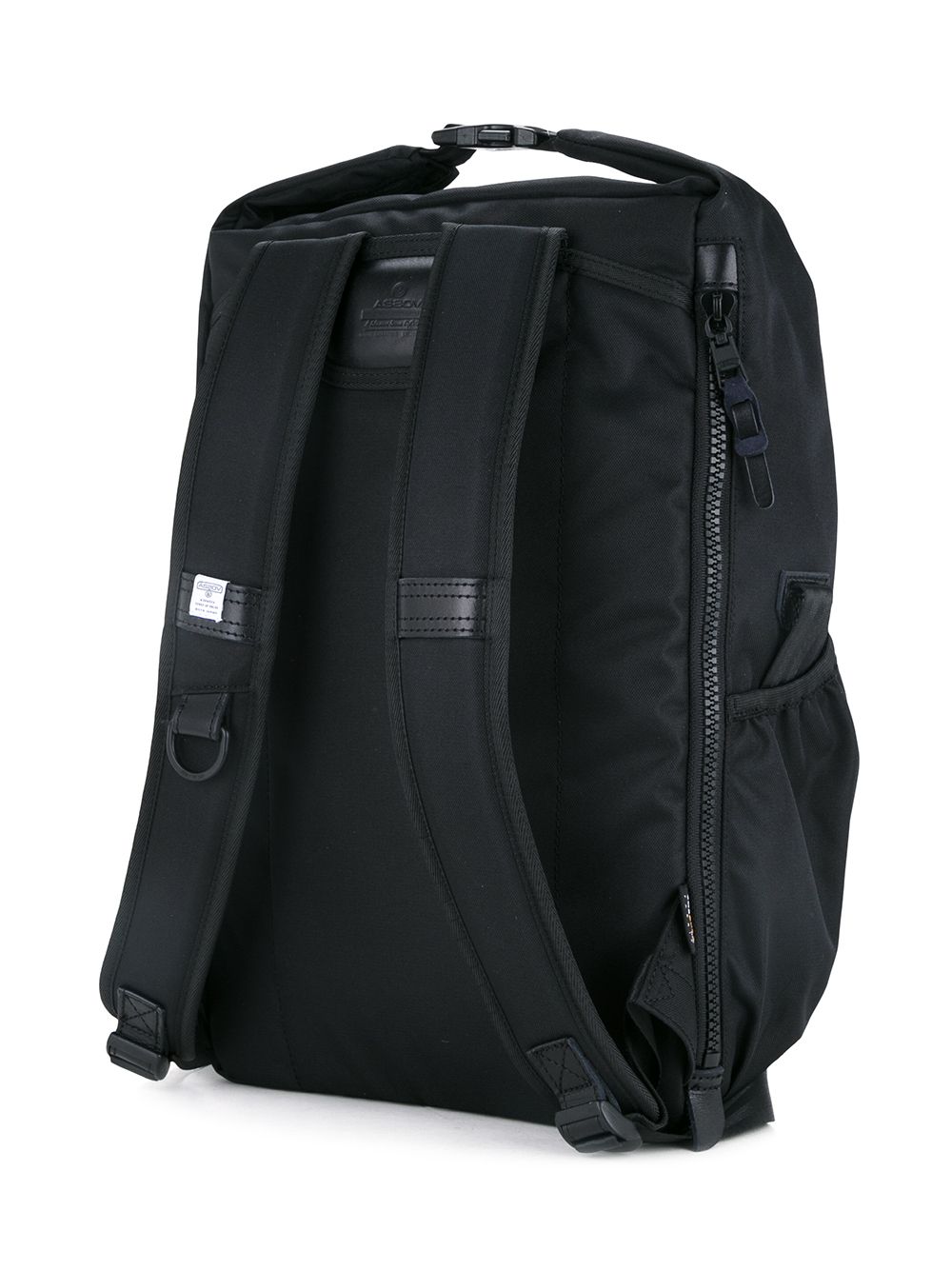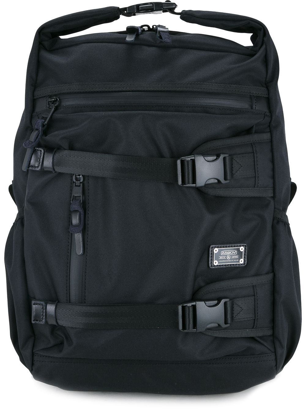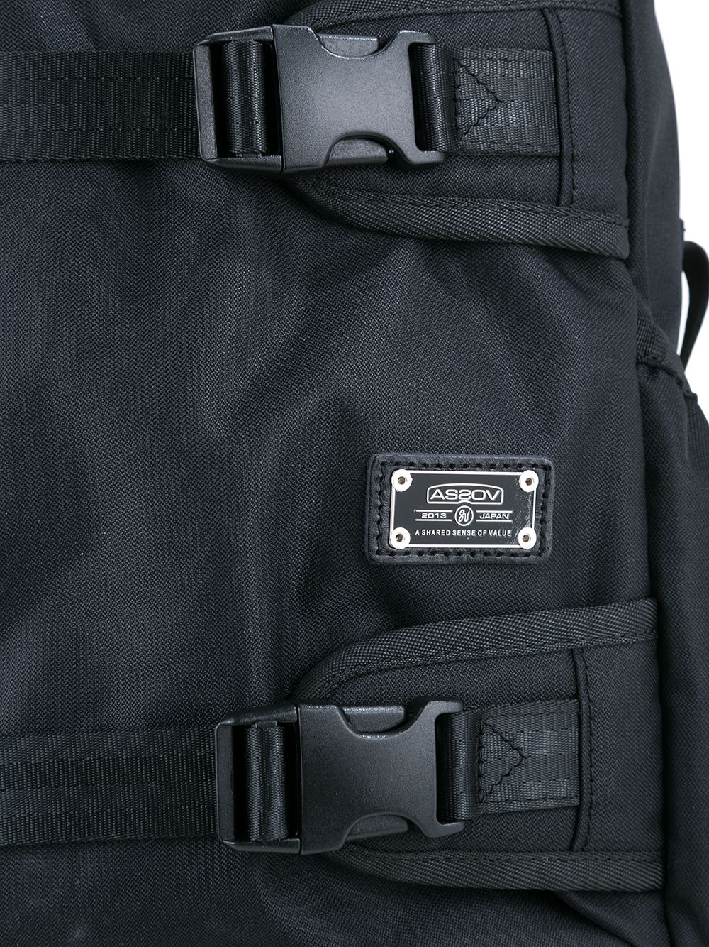 Black Cordura Dobby 2way backpack from AS2OV featuring a silver-tone logo plaque, a buckle fastening, a round top handle and a front zip pocket.