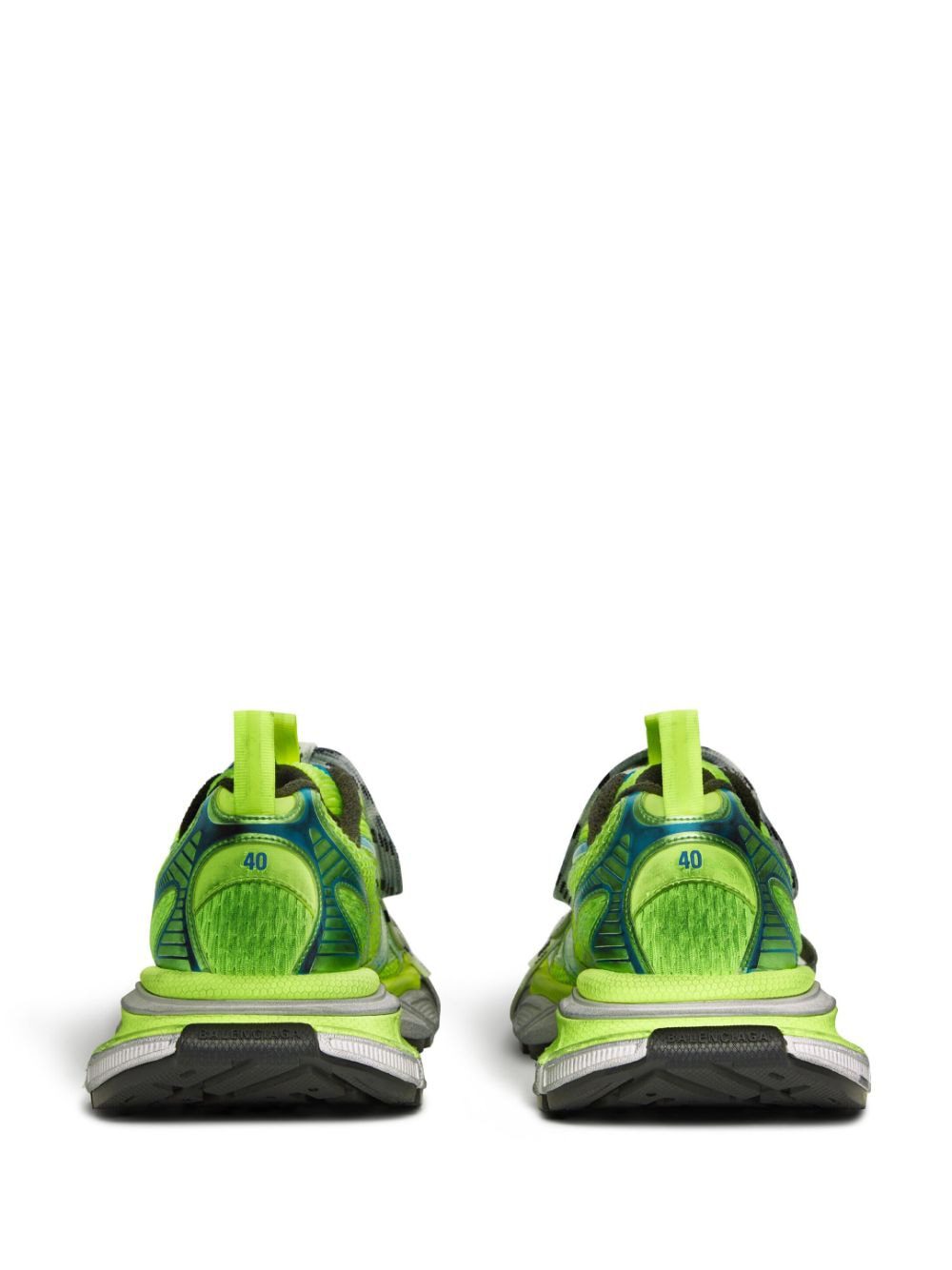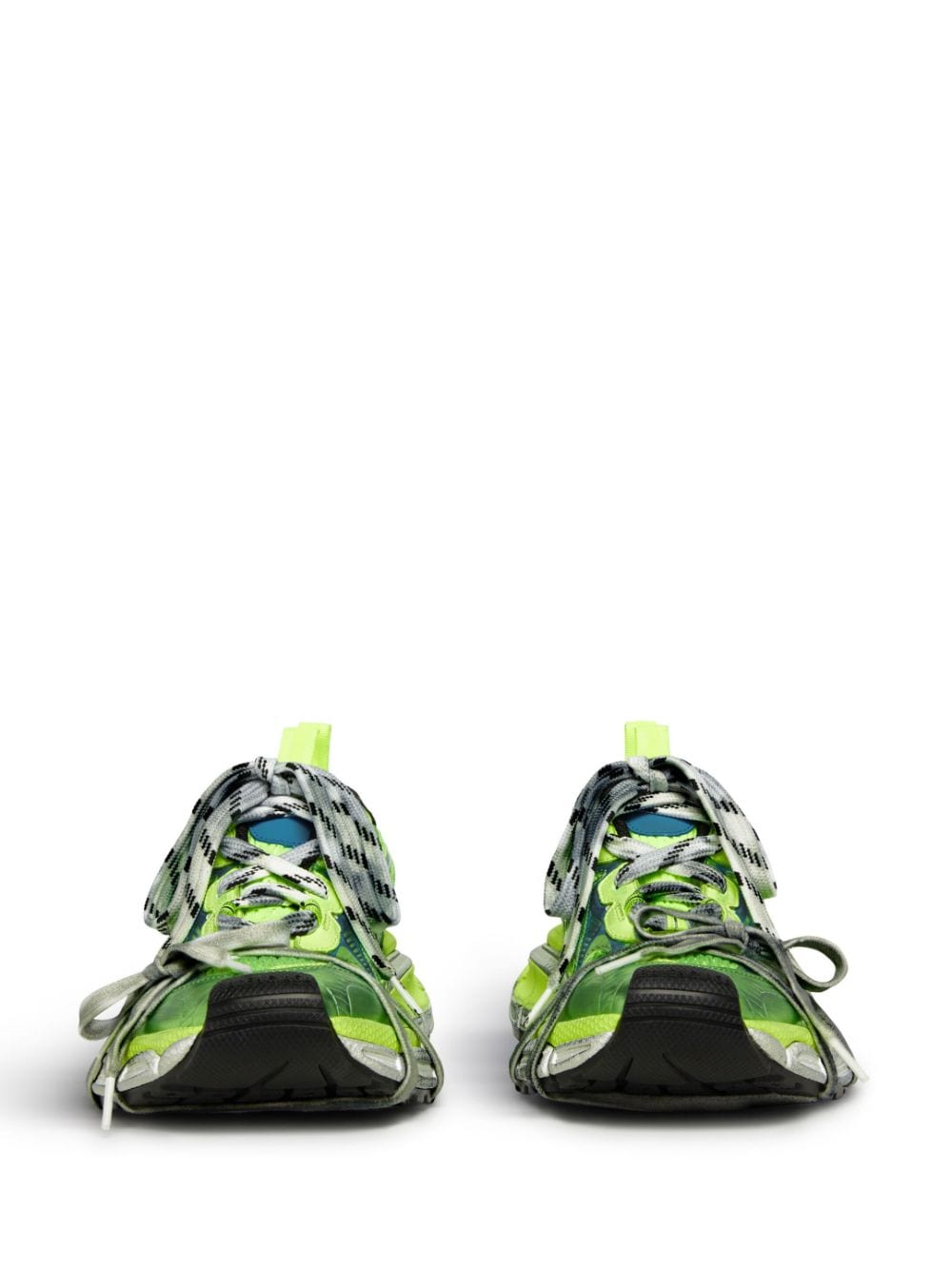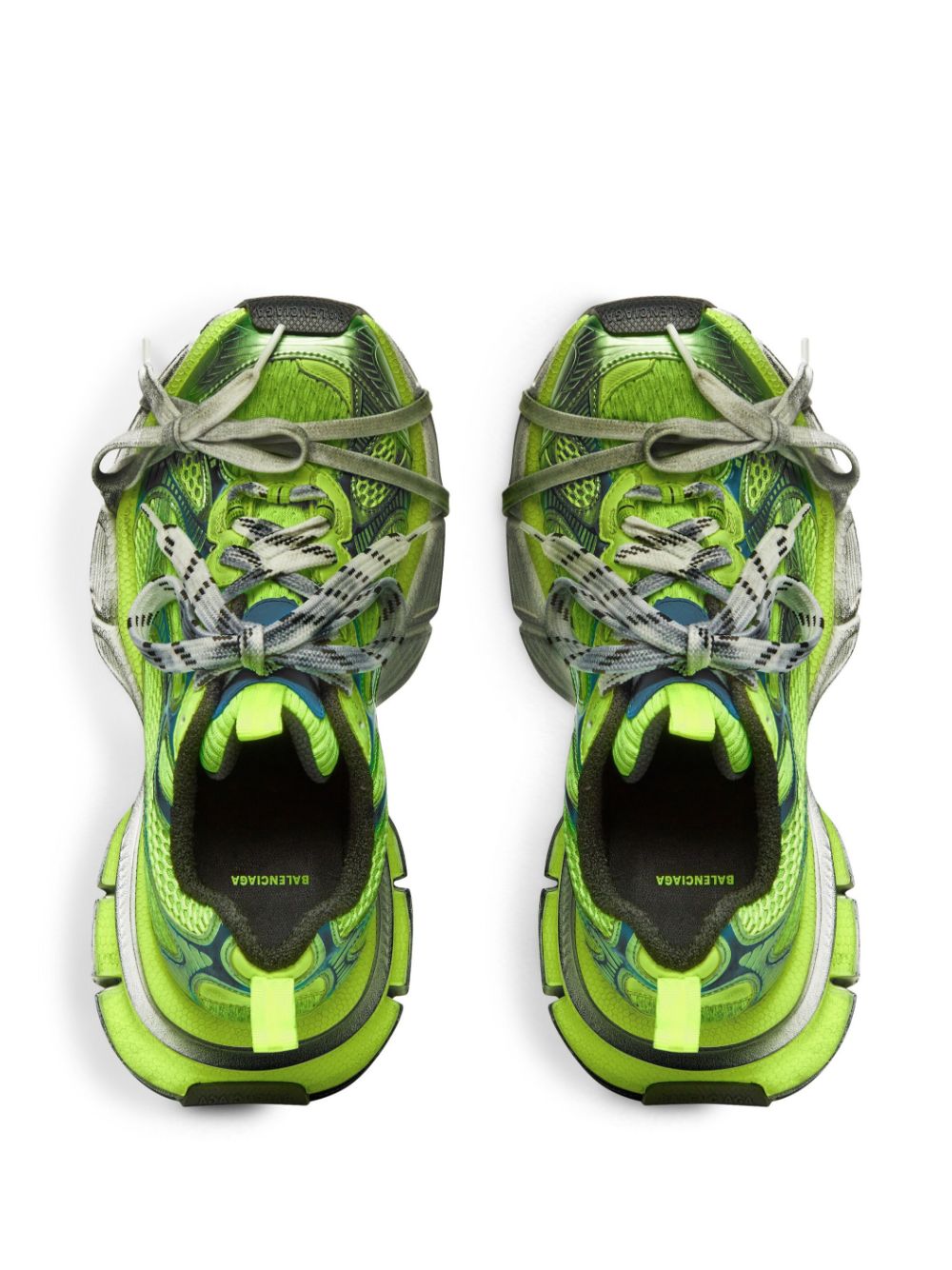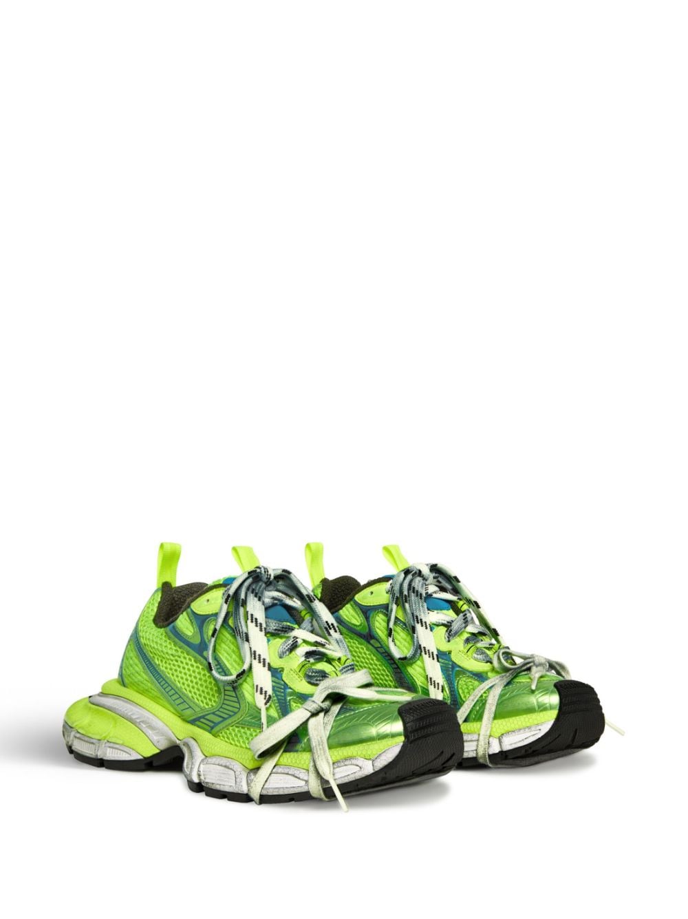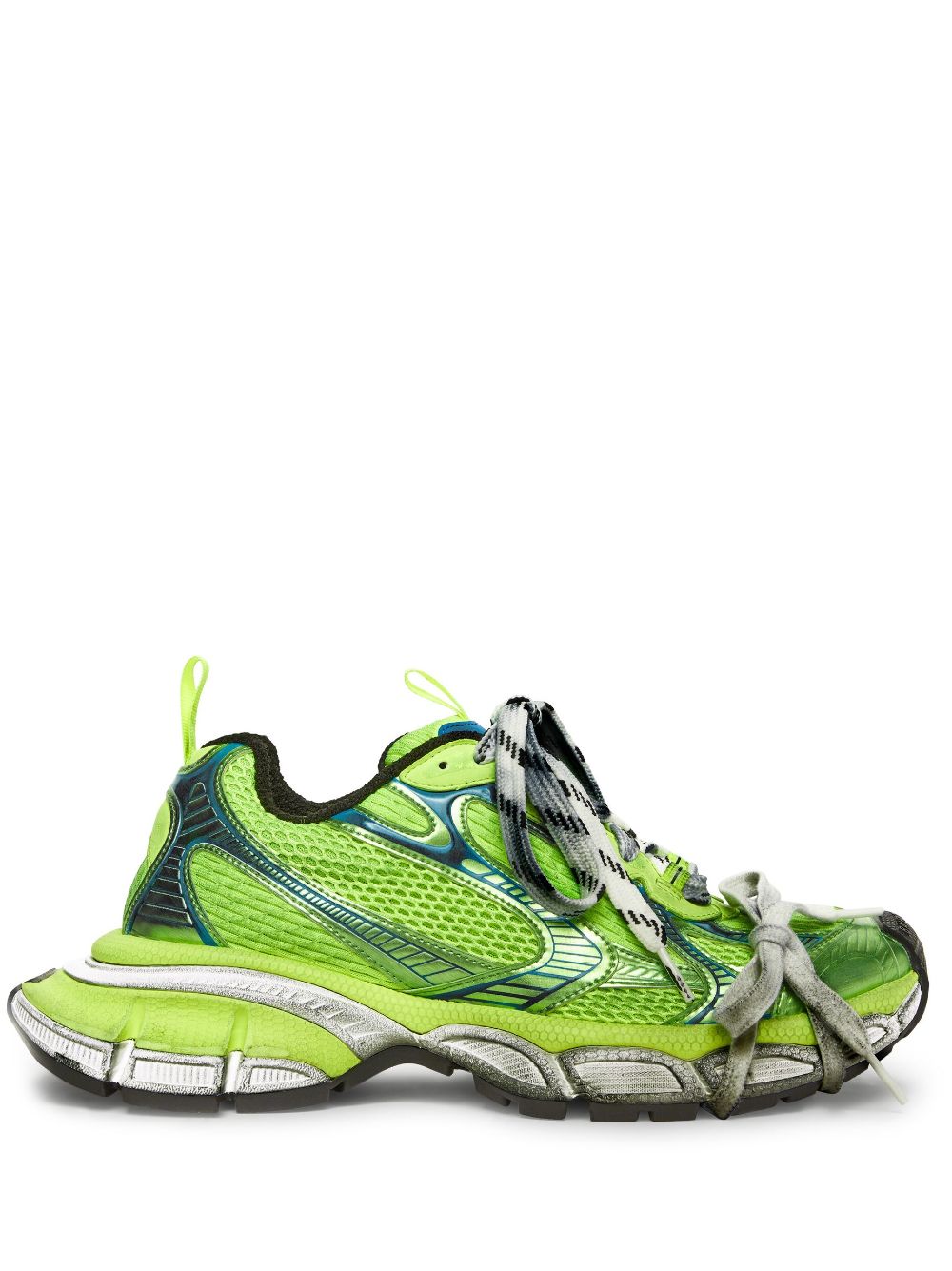 Widely recognized by the dramatic shape of its sole, the 3XL sneakers are a prime example of Balenciaga's keen eye for disruption and cultural referencing. The model takes on the quintessential running shoes of the 2000s and overemphasises elements such as the laces — present as a fastening method and decoratively around the toe — and the distressed effect.