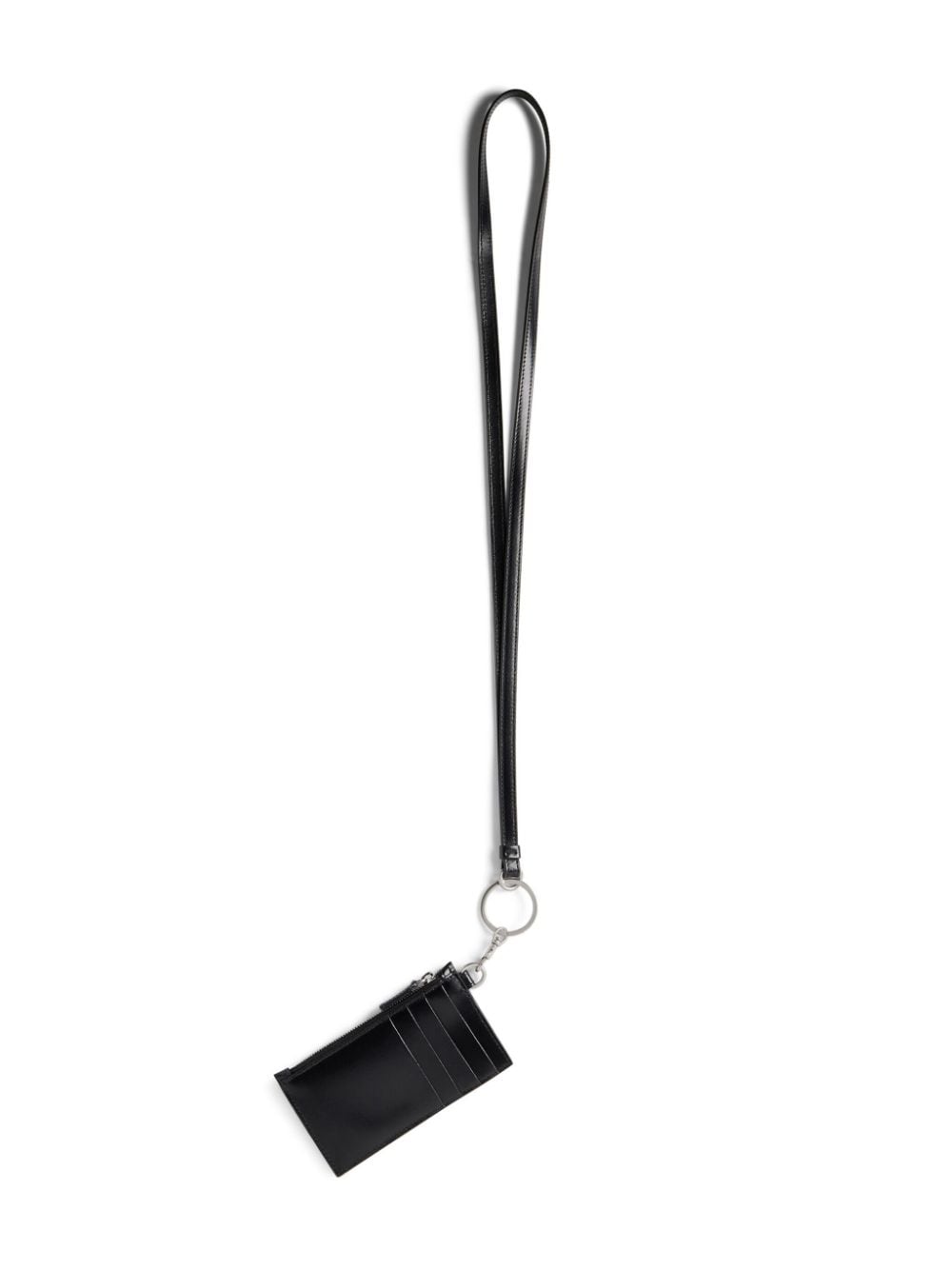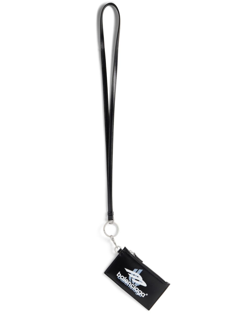 Balenciaga’s black Cash cardholder is printed with a contrasting Layered Sports logo at the front and suspends from a detachable lanyard strap for versatile use.