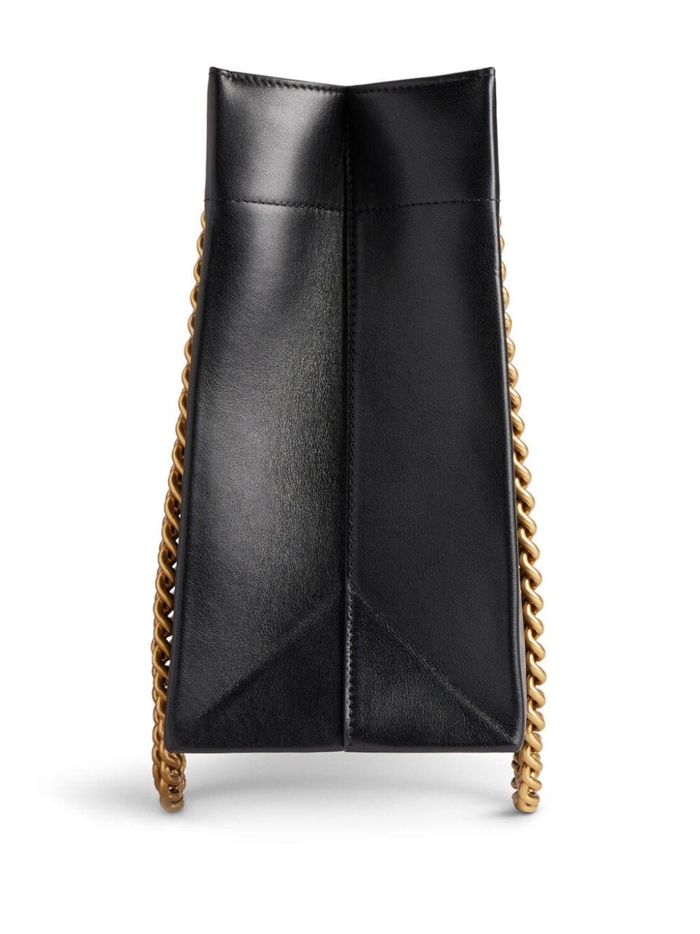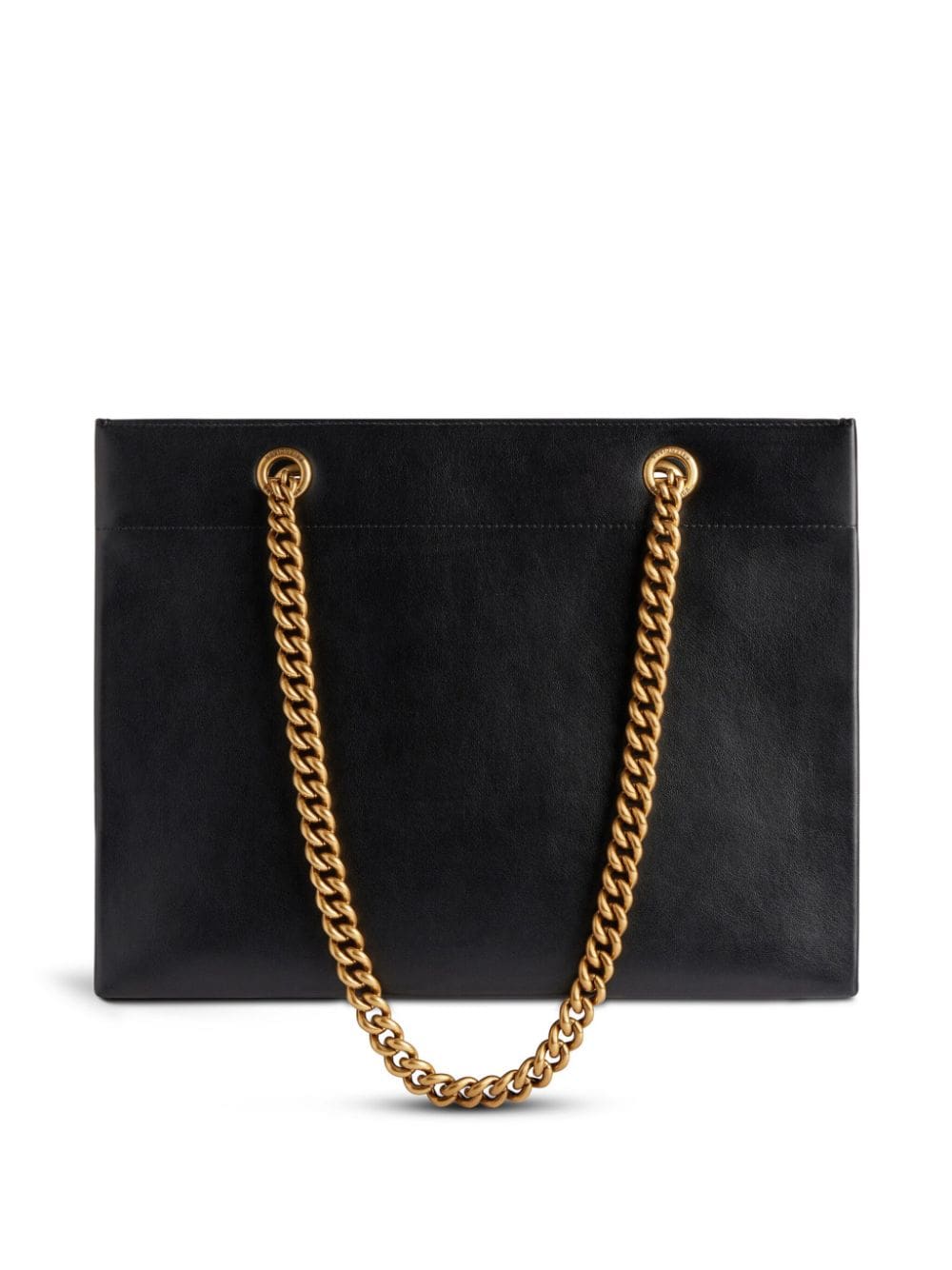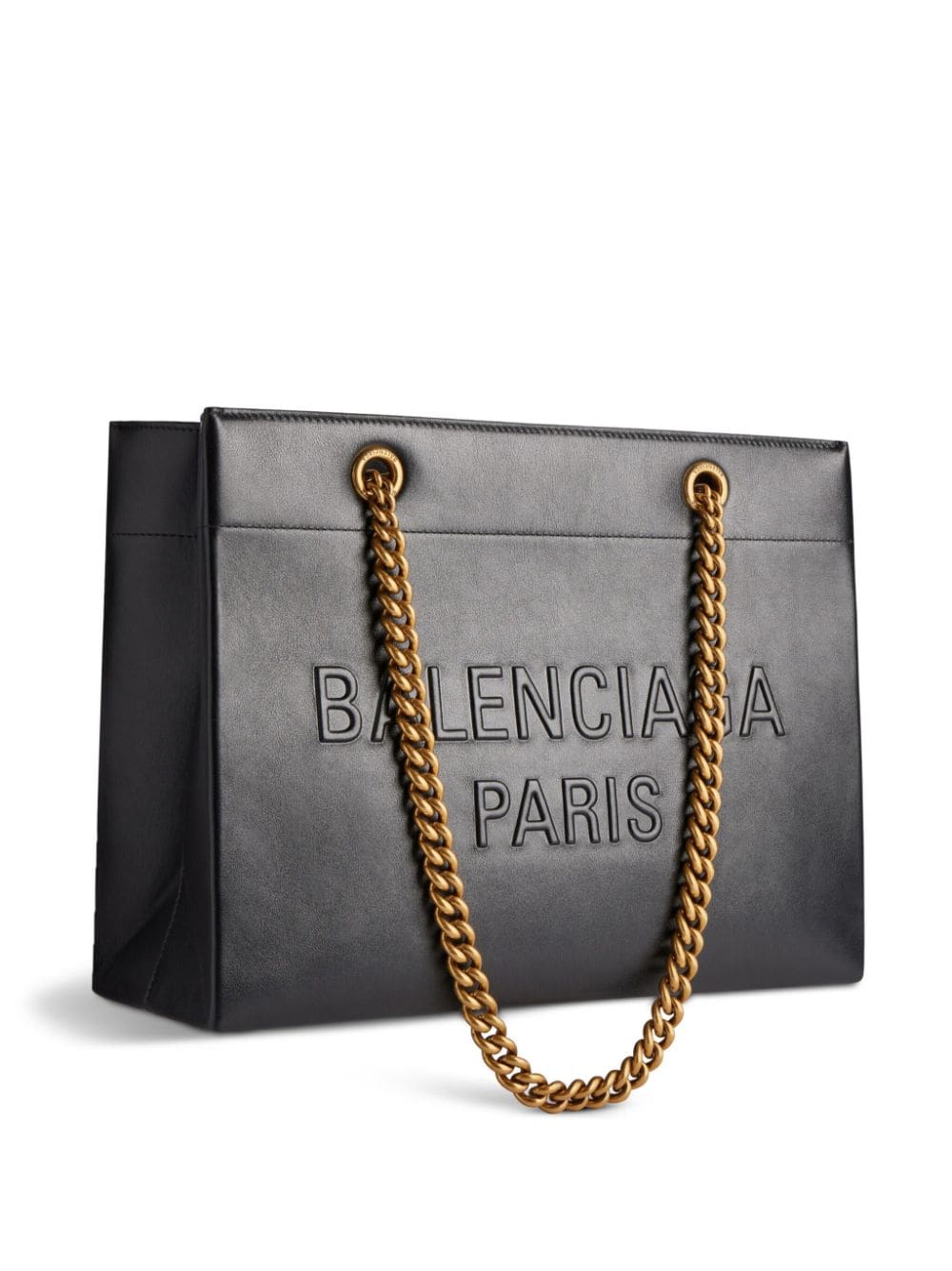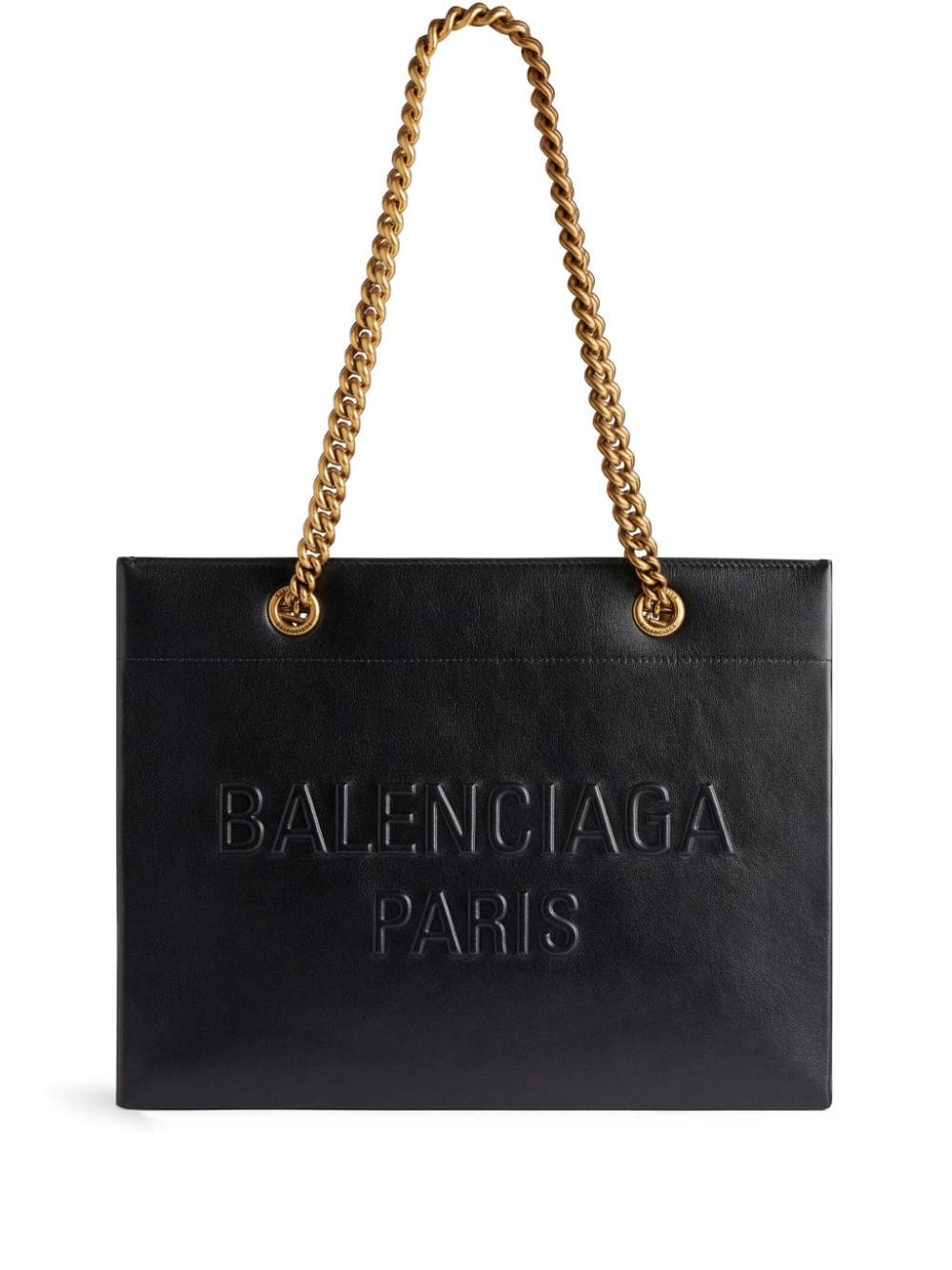 Balenciaga refreshes its iconic Duty Free tote bag with this black leather rendition. Resembling a shopping bag, the boxy silhouette features an embossed logo on the front, while chain-link handles provide a contrasting accent.