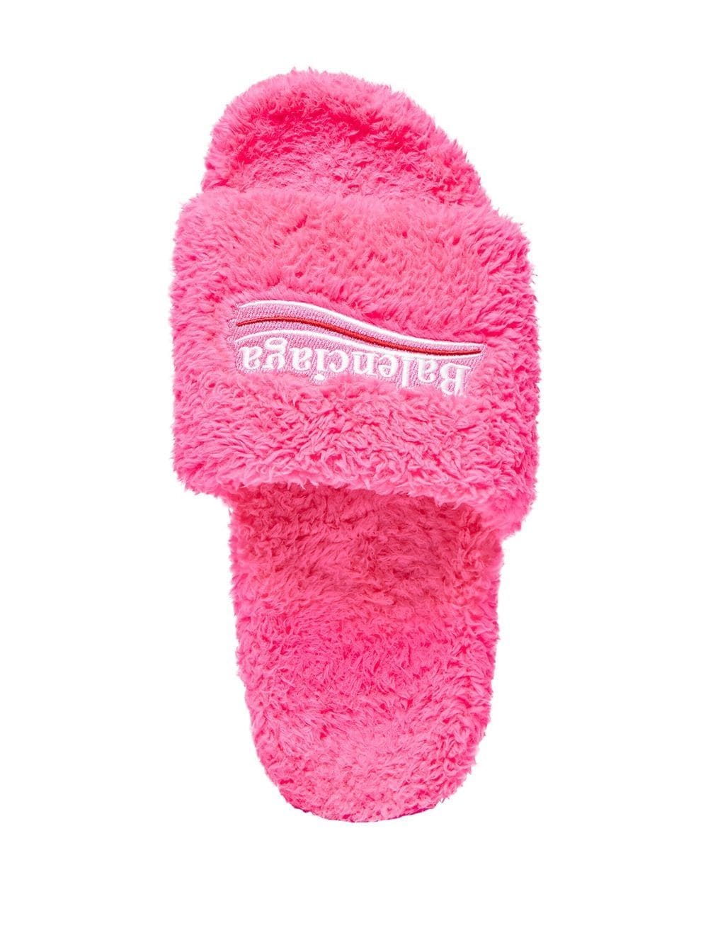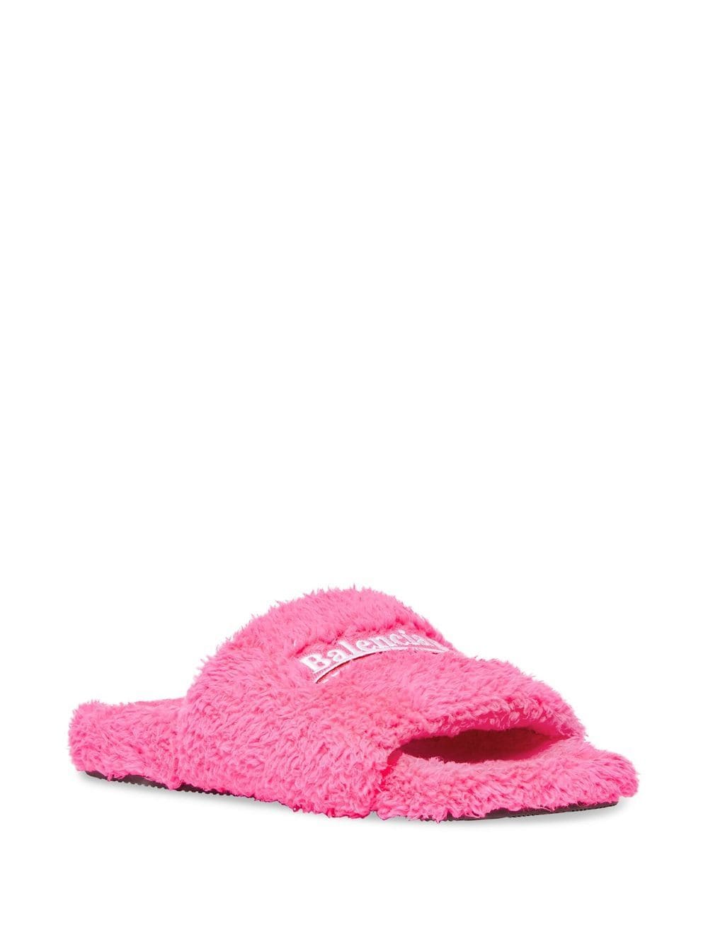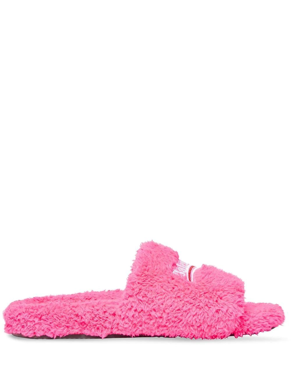 Inspired by the corporate vision, Balenciaga's Political Campaign logo was first introduced in the brand's AW17 collection. Here, the signature motif is embroidered to the strap of these Furry slides, a hot-pink slip-on pair crafted from soft towelling.