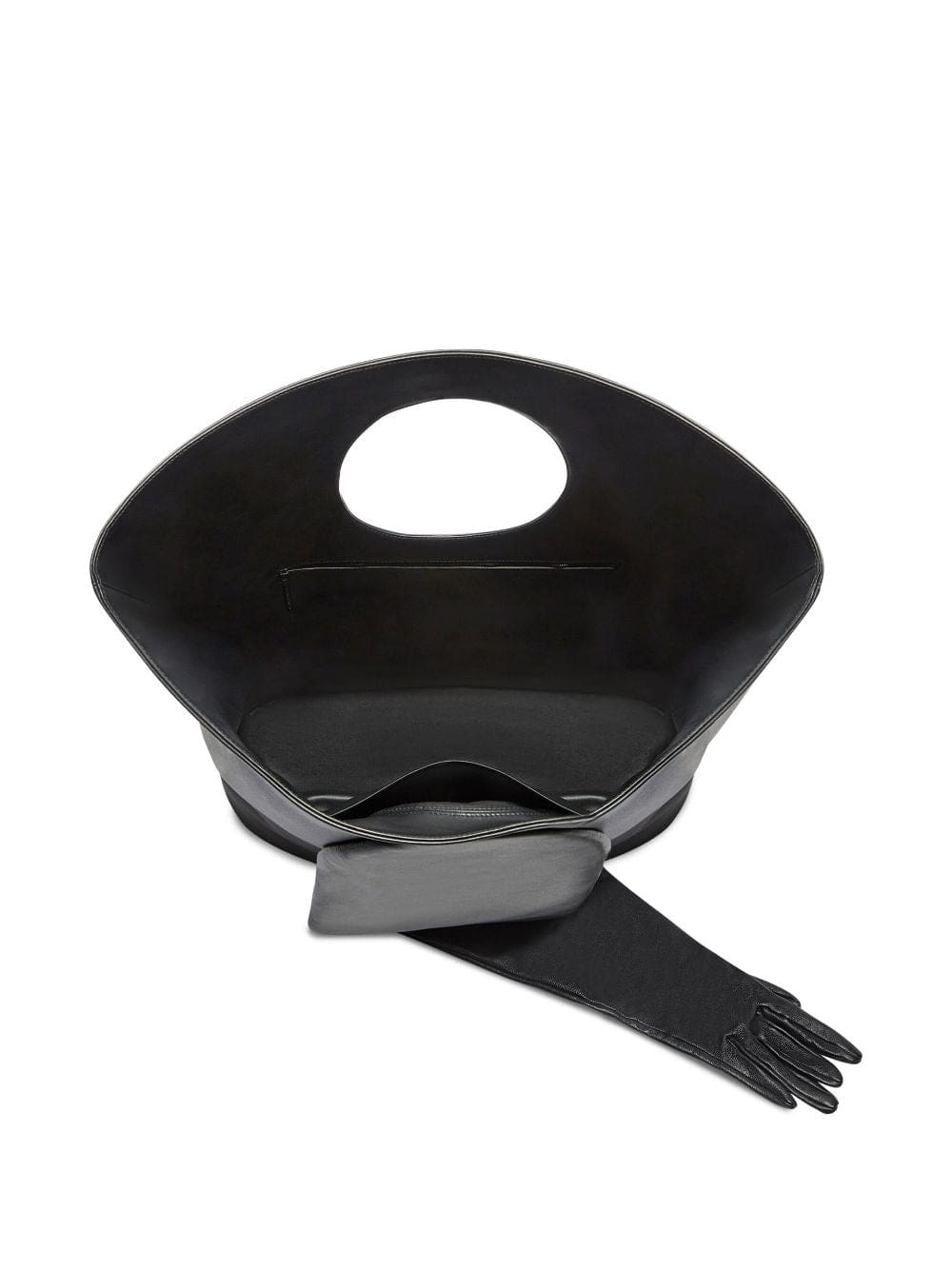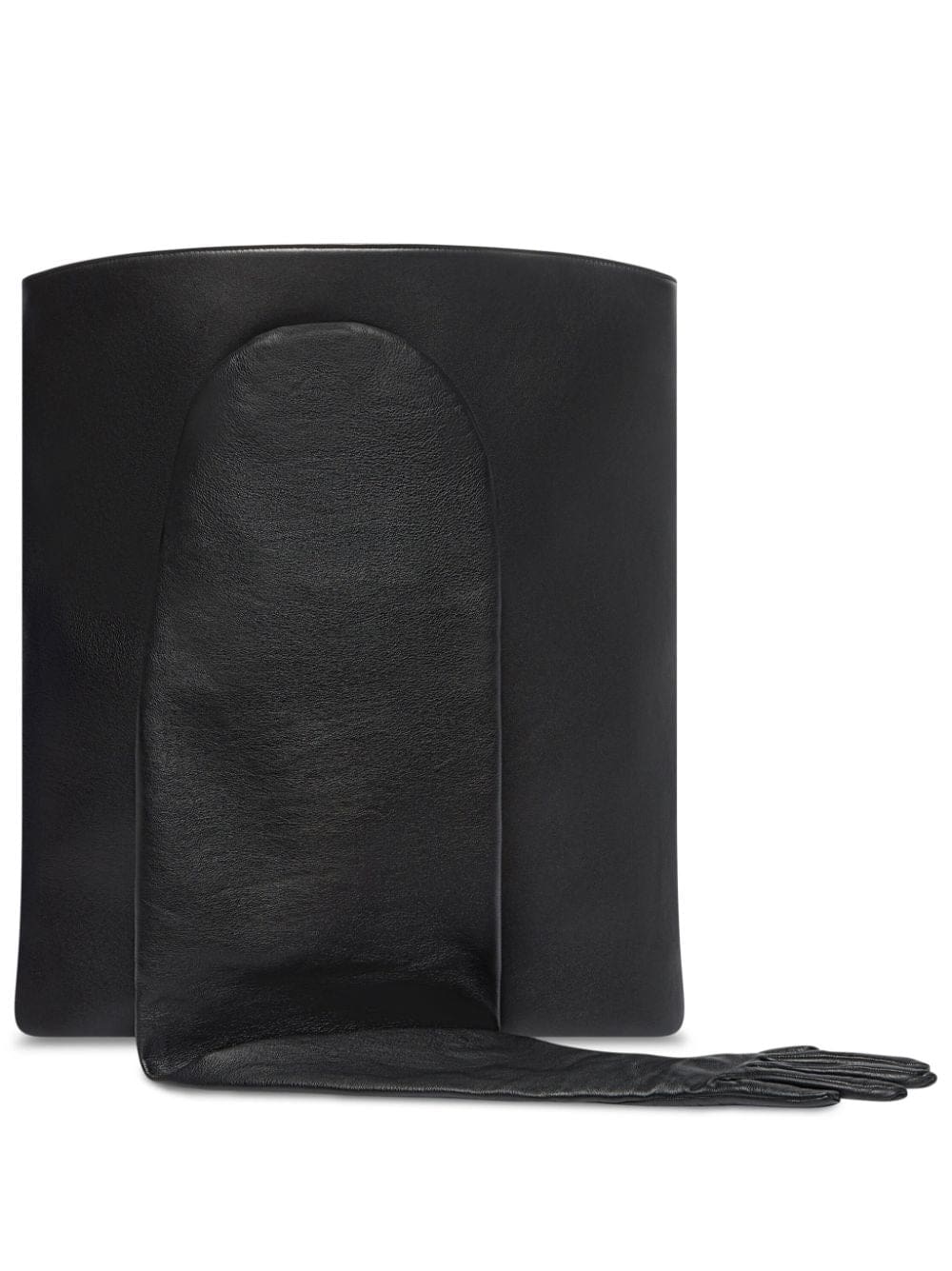 Built to the worn on the right shoulder, this unique design by Balenciaga is crafted from smooth Italian leather and comes with a long-length glove attached to it. With an open top and spacious main compartment, the oversized structure makes it a standalone piece.
