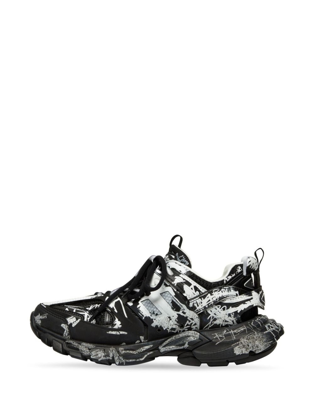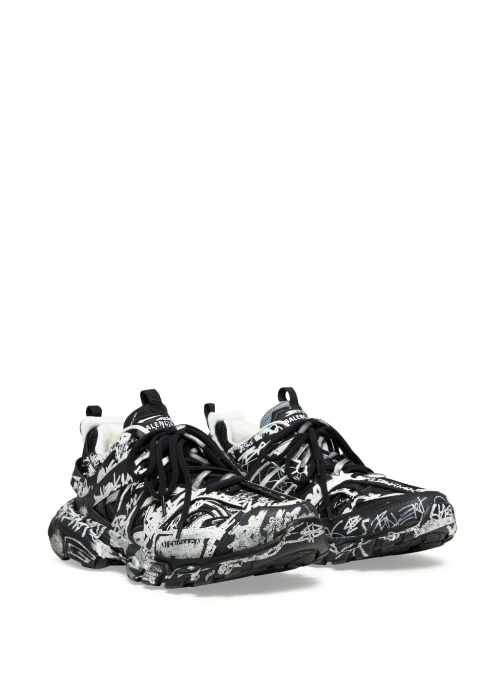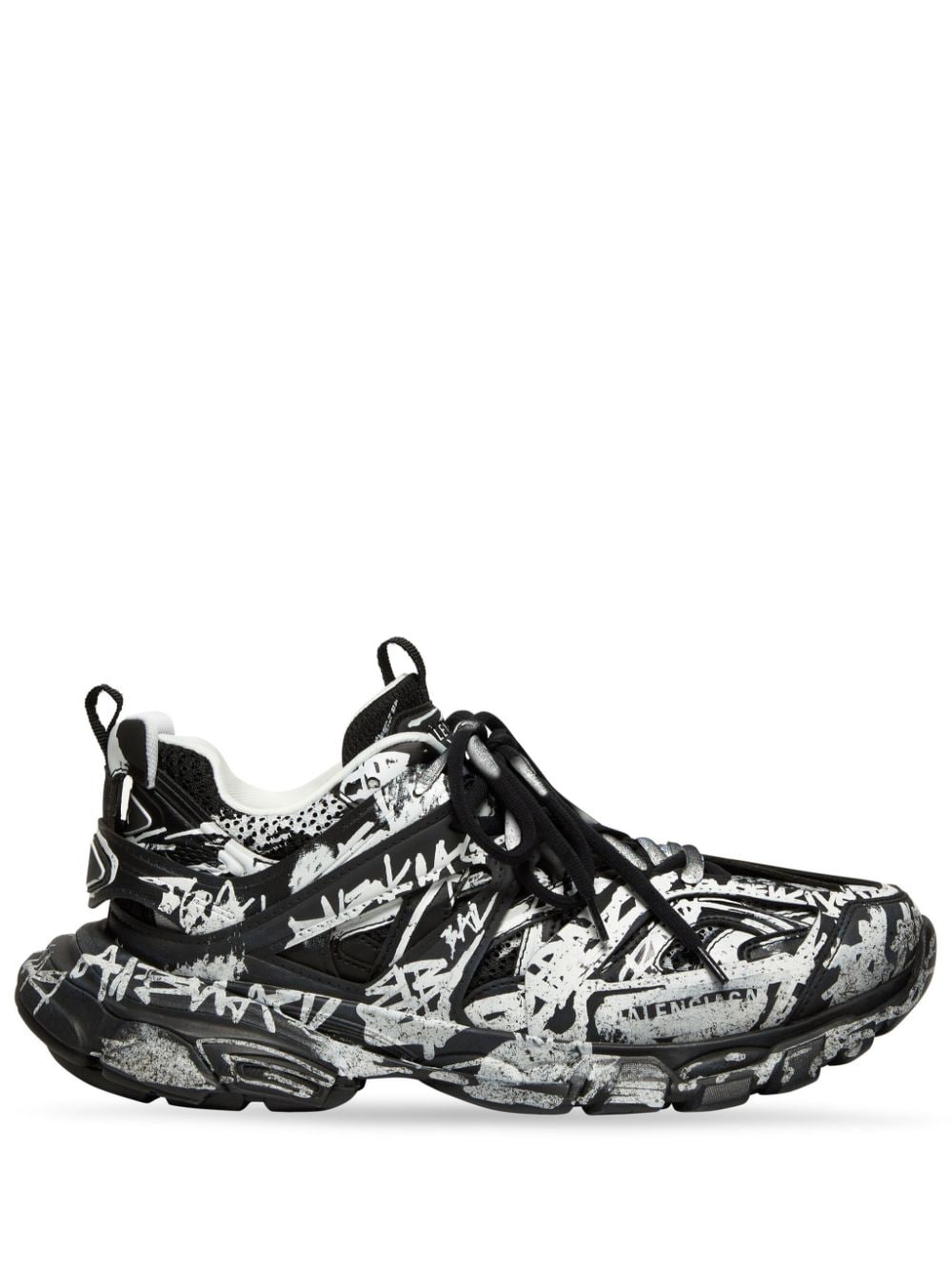 Debuted on Balenciaga’s AW21 runway, the brand re-imagines its Track sneakers in a bold all-over graffiti print for SS23. The sneakers are characterised by a caged design that references retro hiking and running styles, merging style and comfort.