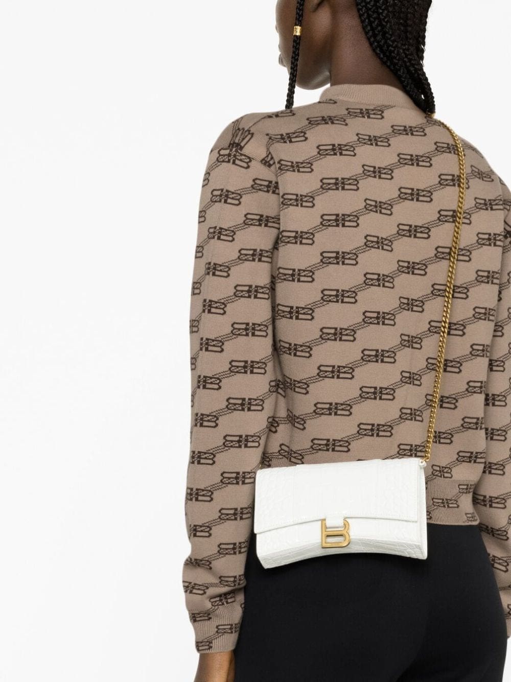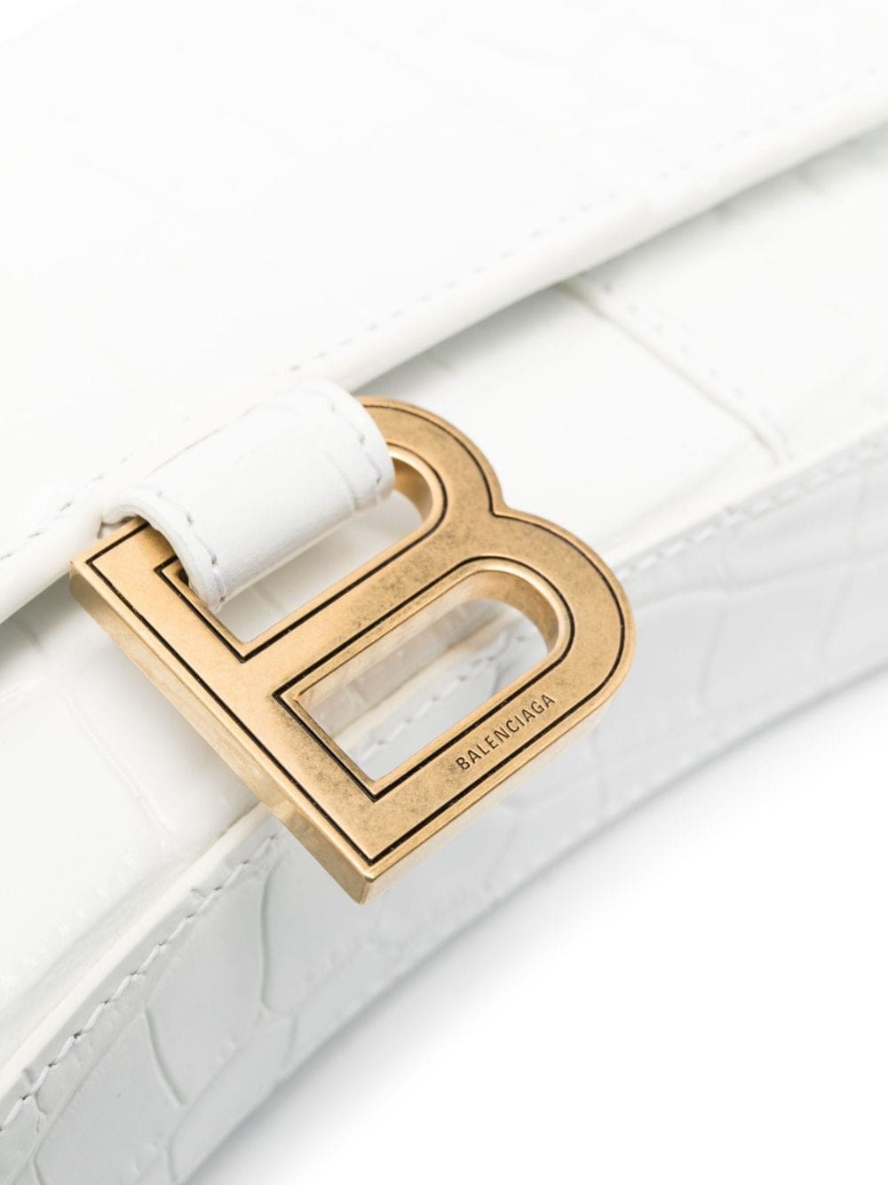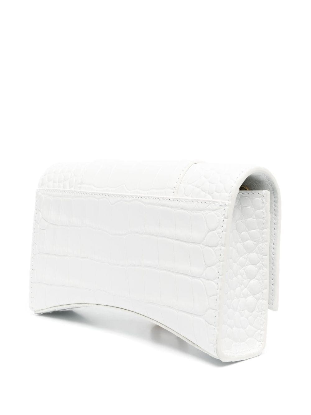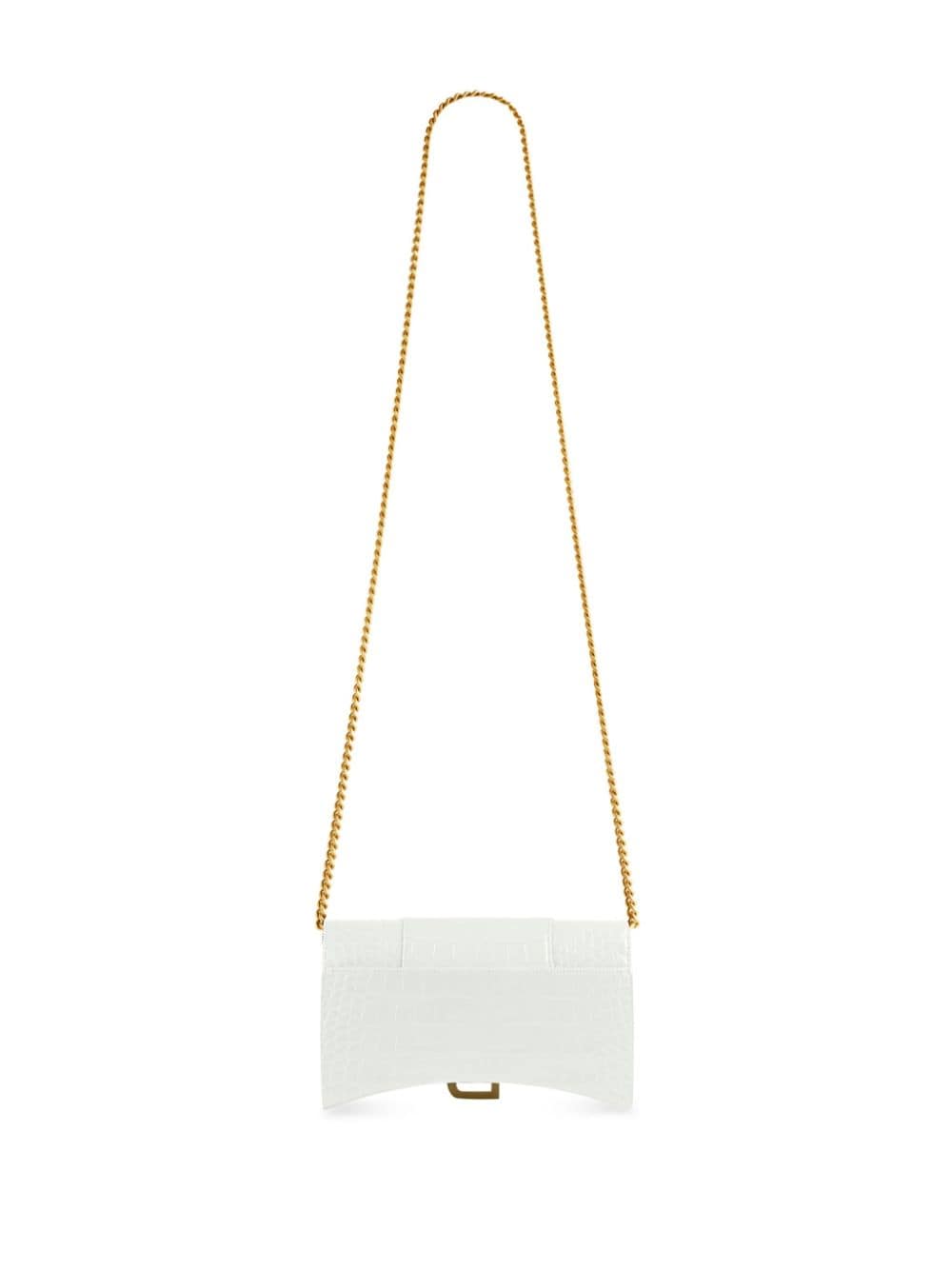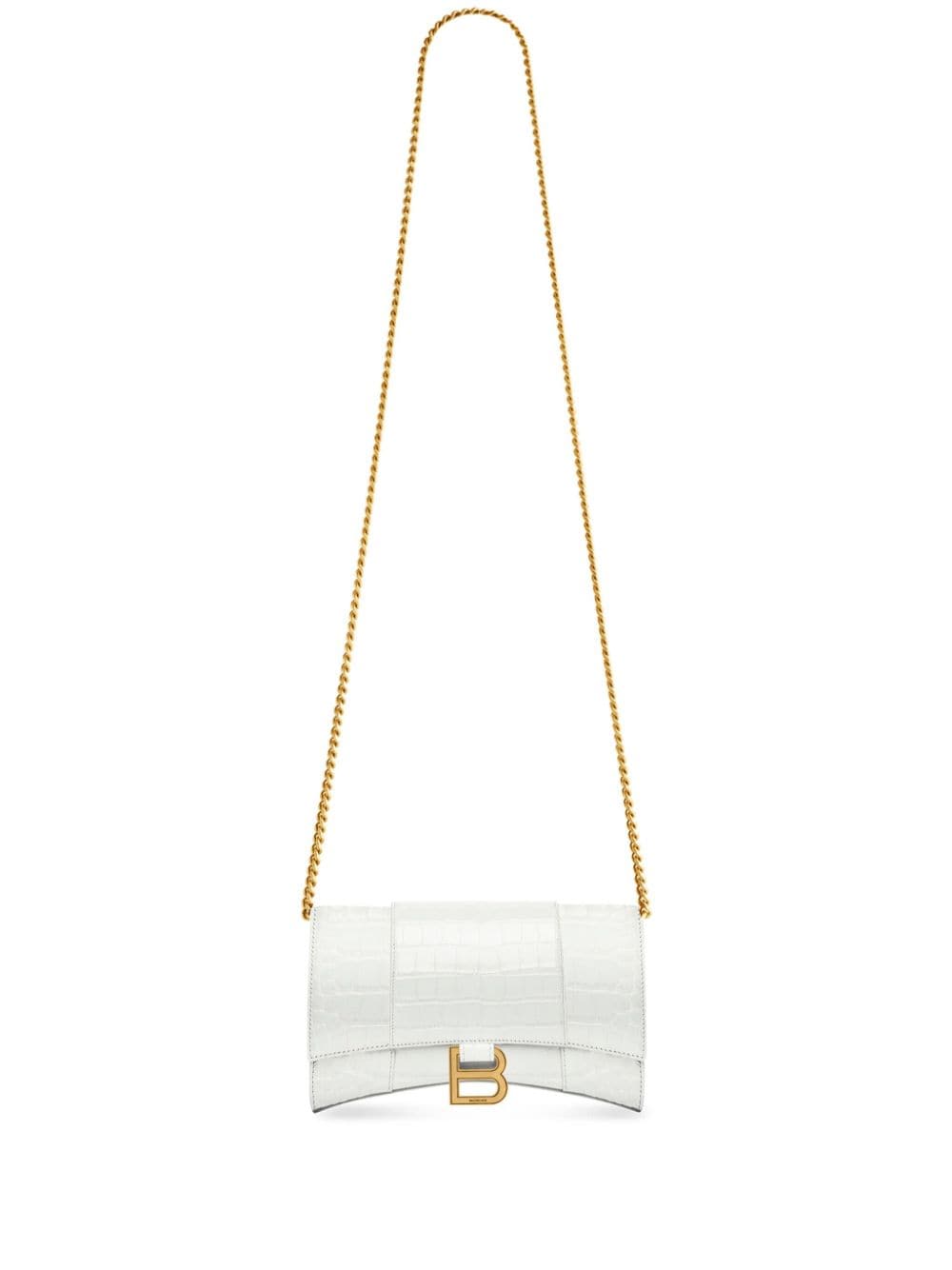 Inspired by outerwear silhouettes first introduced by founder Cristóbal Balenciaga, the Hourglass bag has become one of the brand's most iconic shapes. The sculpted wallet-on-chain is re-invented for SS22 in optical white and elevated with an embossed crocodile effect.