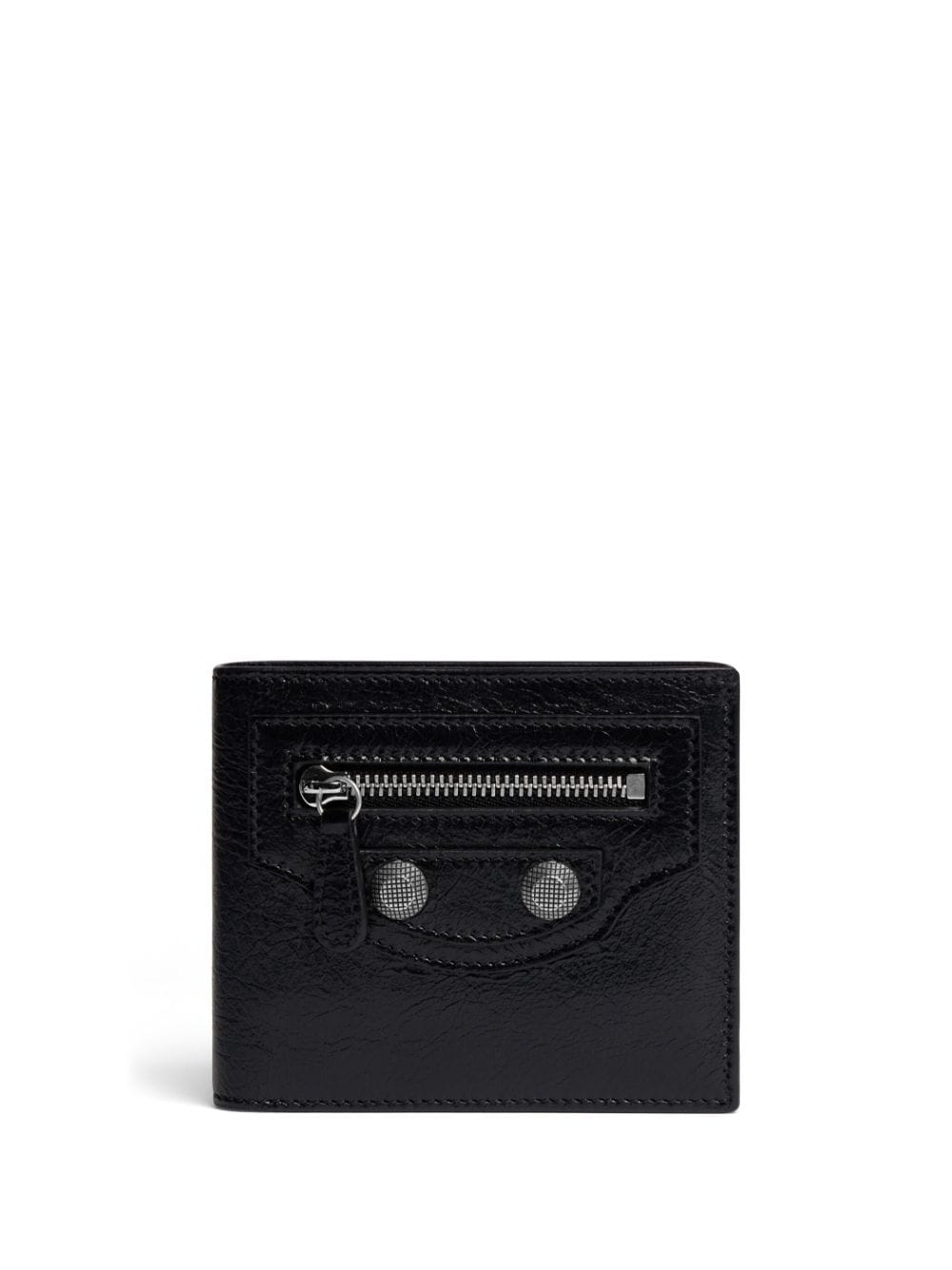 Balenciaga's Le Cagole silhouette is instantly recognisable thanks to the zip and stud detailing, both of which come in mini proportions at the front of this black bi-fold wallet. It’s crafted in durable grained leather and opens to myriad card slots and a bill compartment.