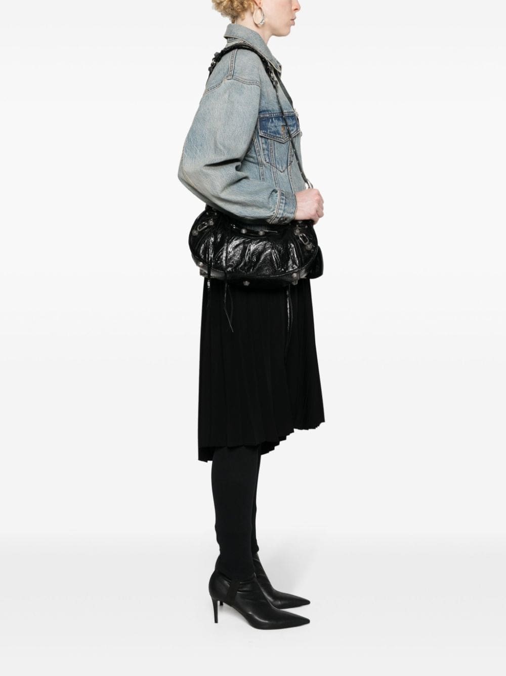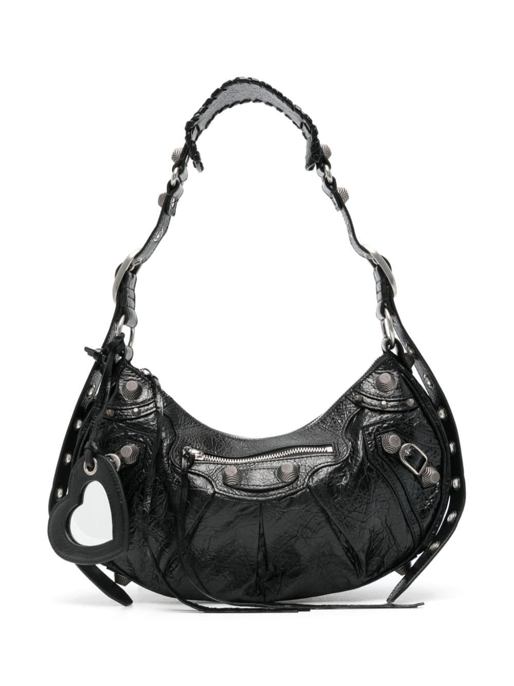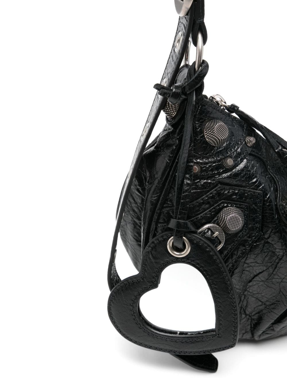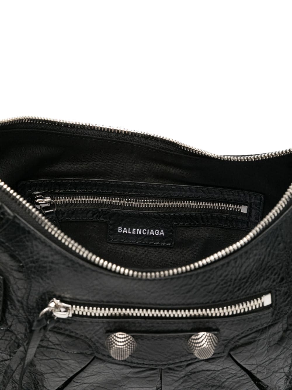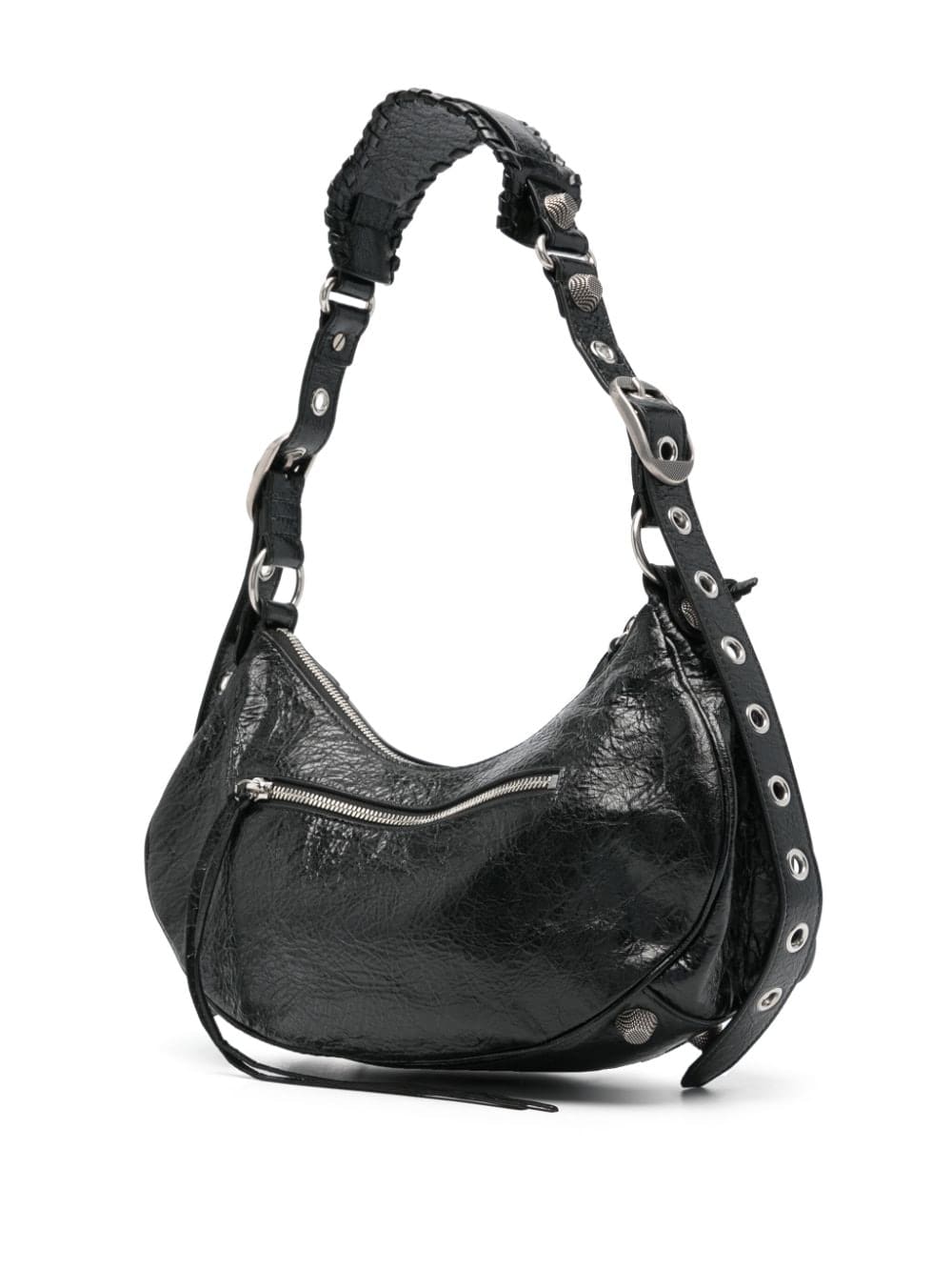Balenciaga's La Cagole bag features multiple elements of silver-tone hardware detailing such as buckle fastenings, stud embellishment, zip fastenings and shoulder-strap eyelet detailing, on tonal, textured-finish leather, which adds to the brand's signature maximalist style.