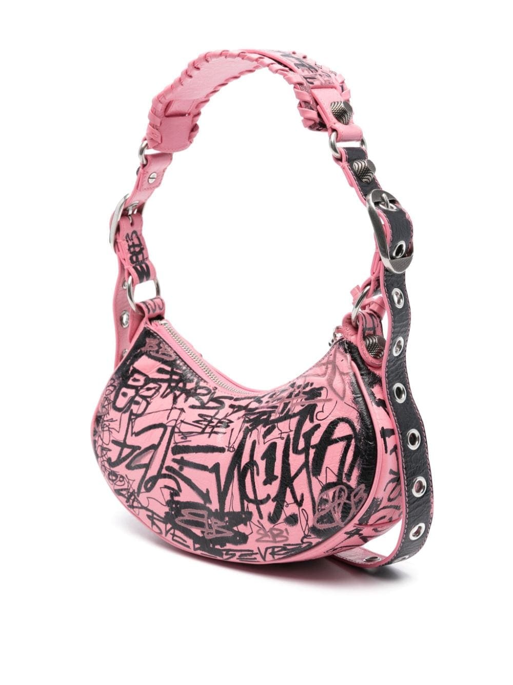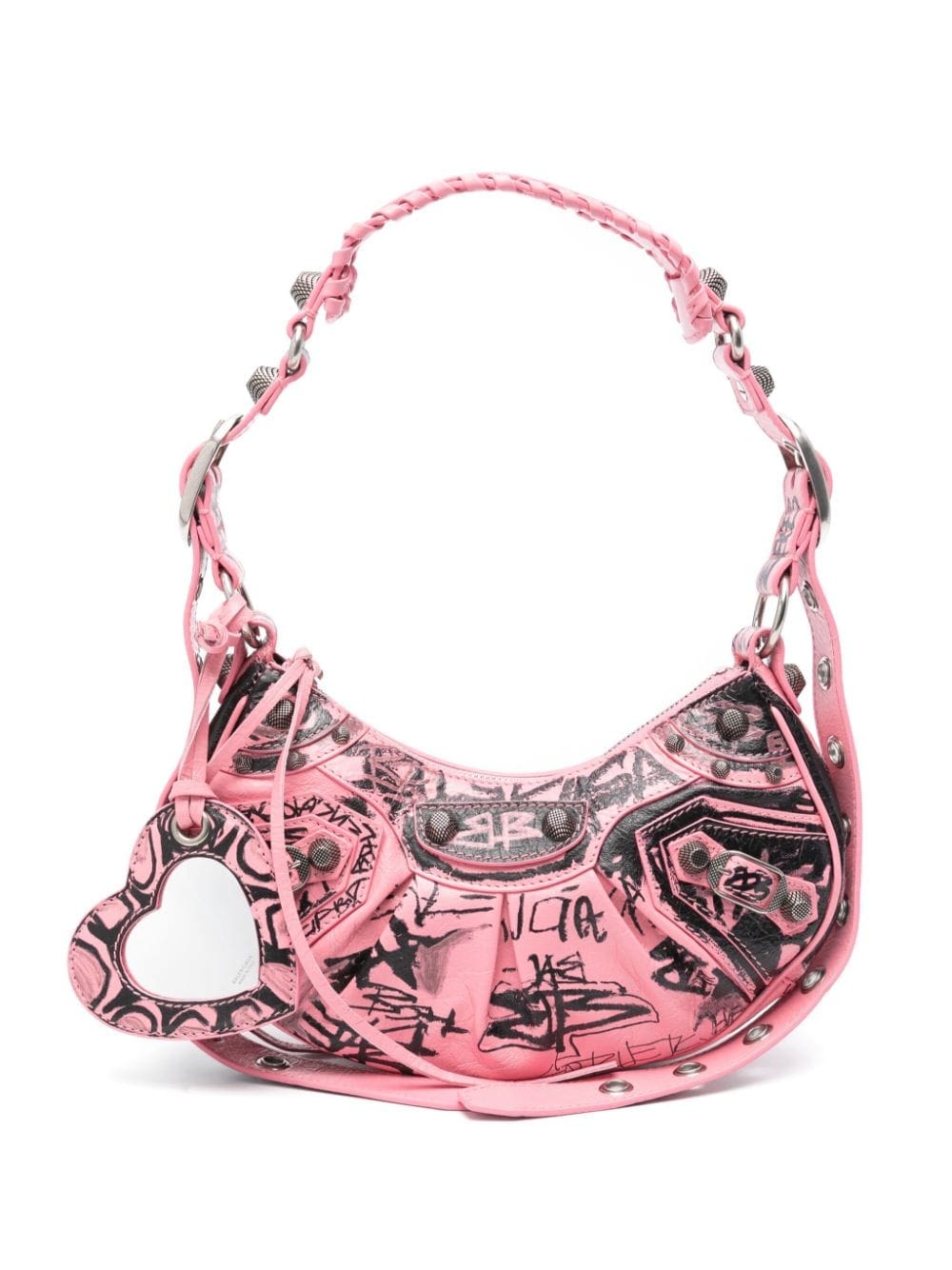 Balenciaga's 'Le Cagole' shoulder bag was first introduced during the brand's pre-Fall 2021 show. For SS23, this iteration arrives in an XS size and is adorned with the brand's Graffiti print throughout. The signature silhouette is accented with iconic identifiers including the heart-shaped mirror and removable cardholder, true to the label's recognisable style.