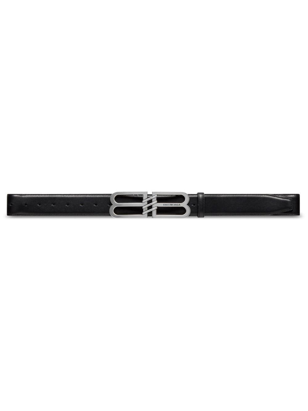 calf leather logo-buckle belt from BALENCIAGA featuring black, logo buckle fastening, silver-tone hardware, adjustable fit and smoothing finish. POSITIVELY CONSCIOUS: We've partnered with Good On You — an ethical agency that rates how sustainably brands perform across various people, planet and animal welfare criteria. This product comes from a Conscious brand that performs well in relation to their impact on the planet, for example ensures the use of materials that limit the amount of chemicals, water and wastewater involved in production processes..