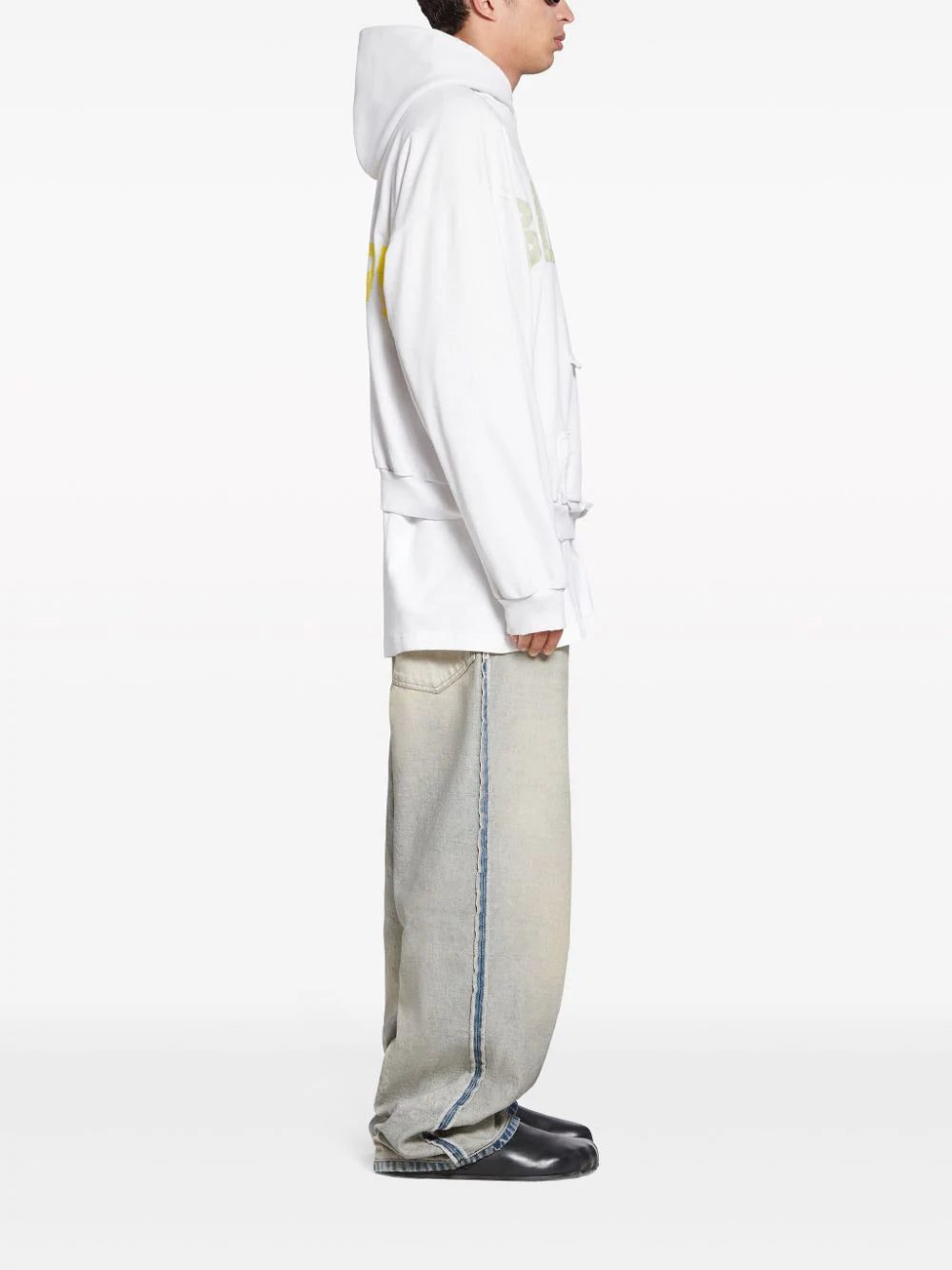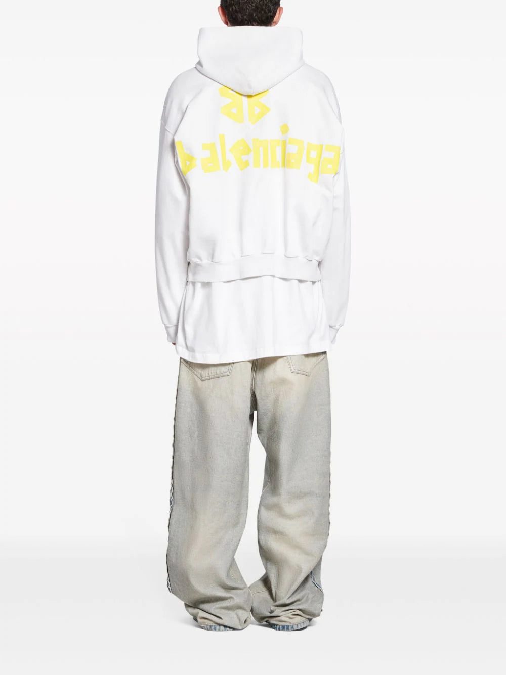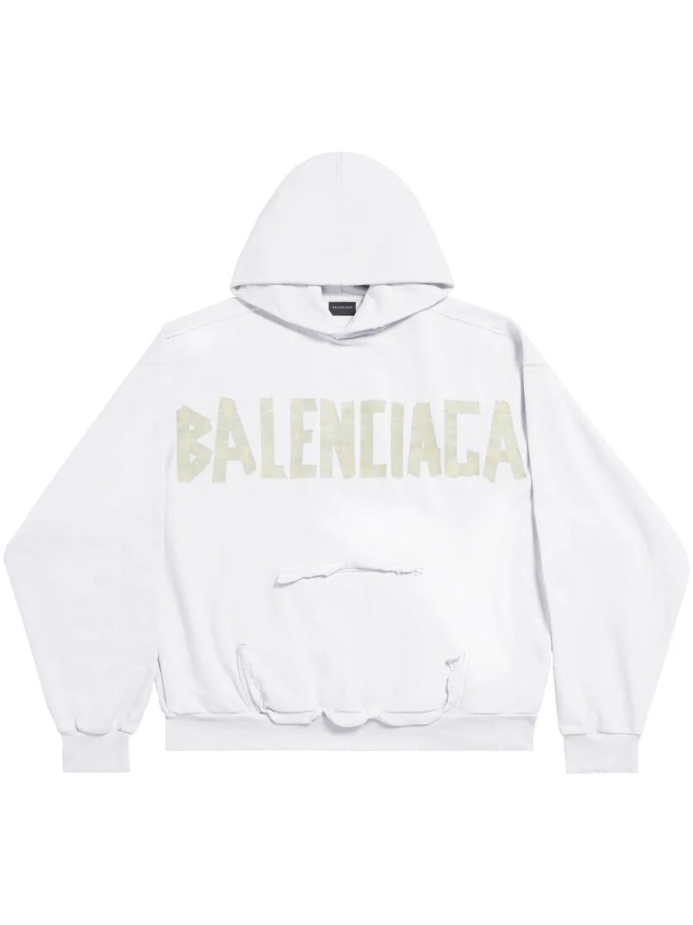 Balenciaga's penchant for a deconstructive aesthetic comes to life in this white cotton hoodie. Featuring the logo front to back in a makeshift-style tape effect, raw cut edges add to the distressed finish of the piece.
