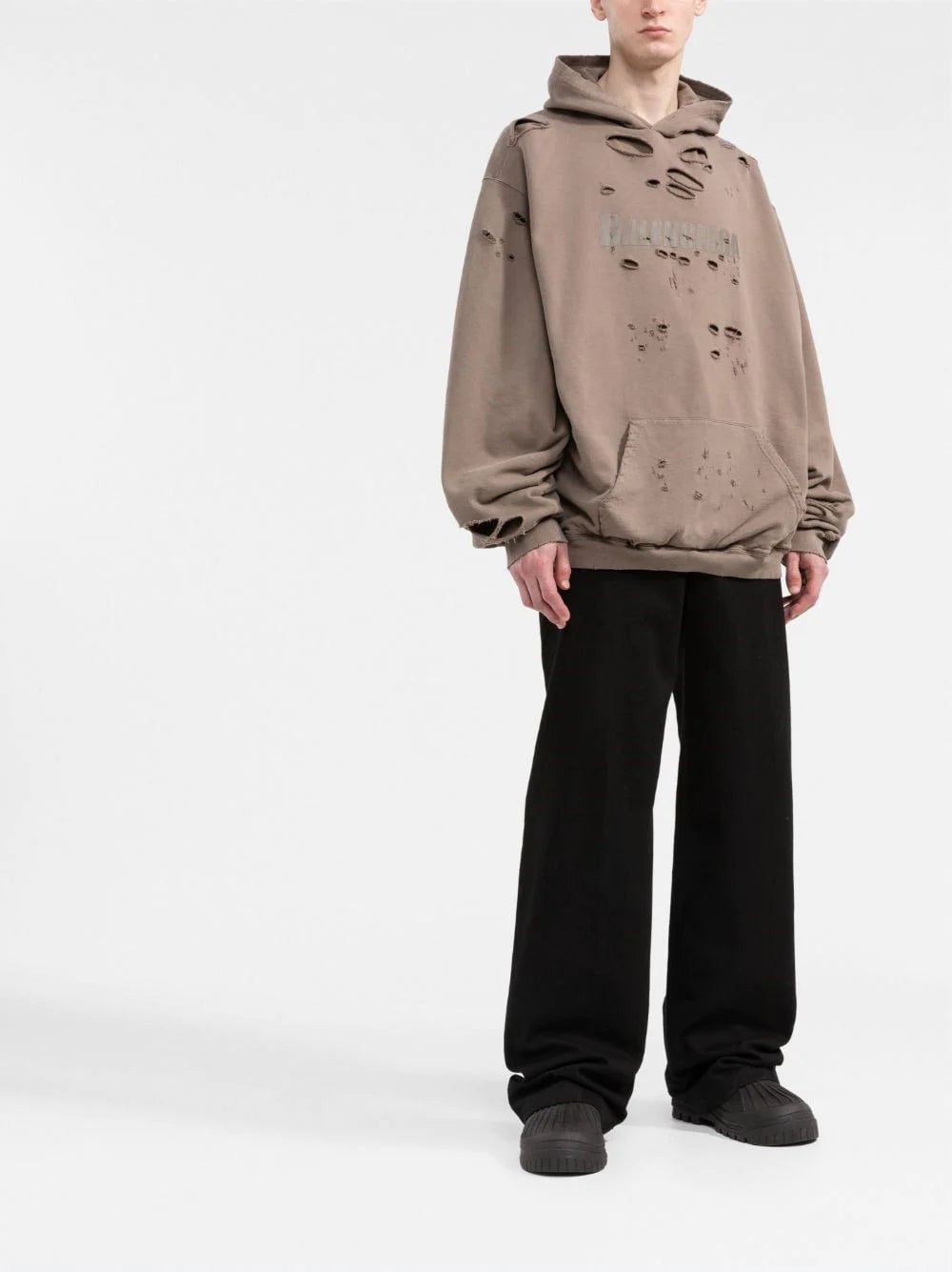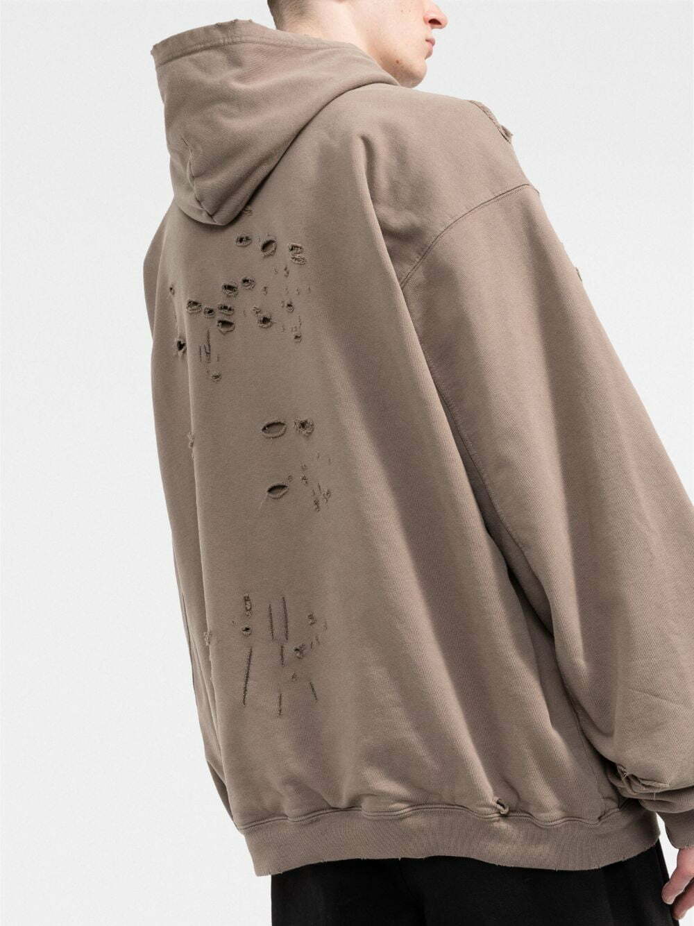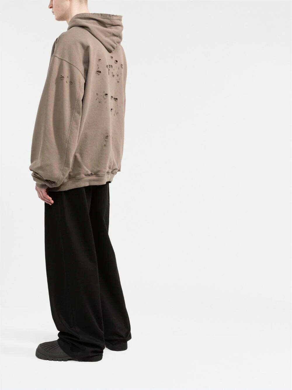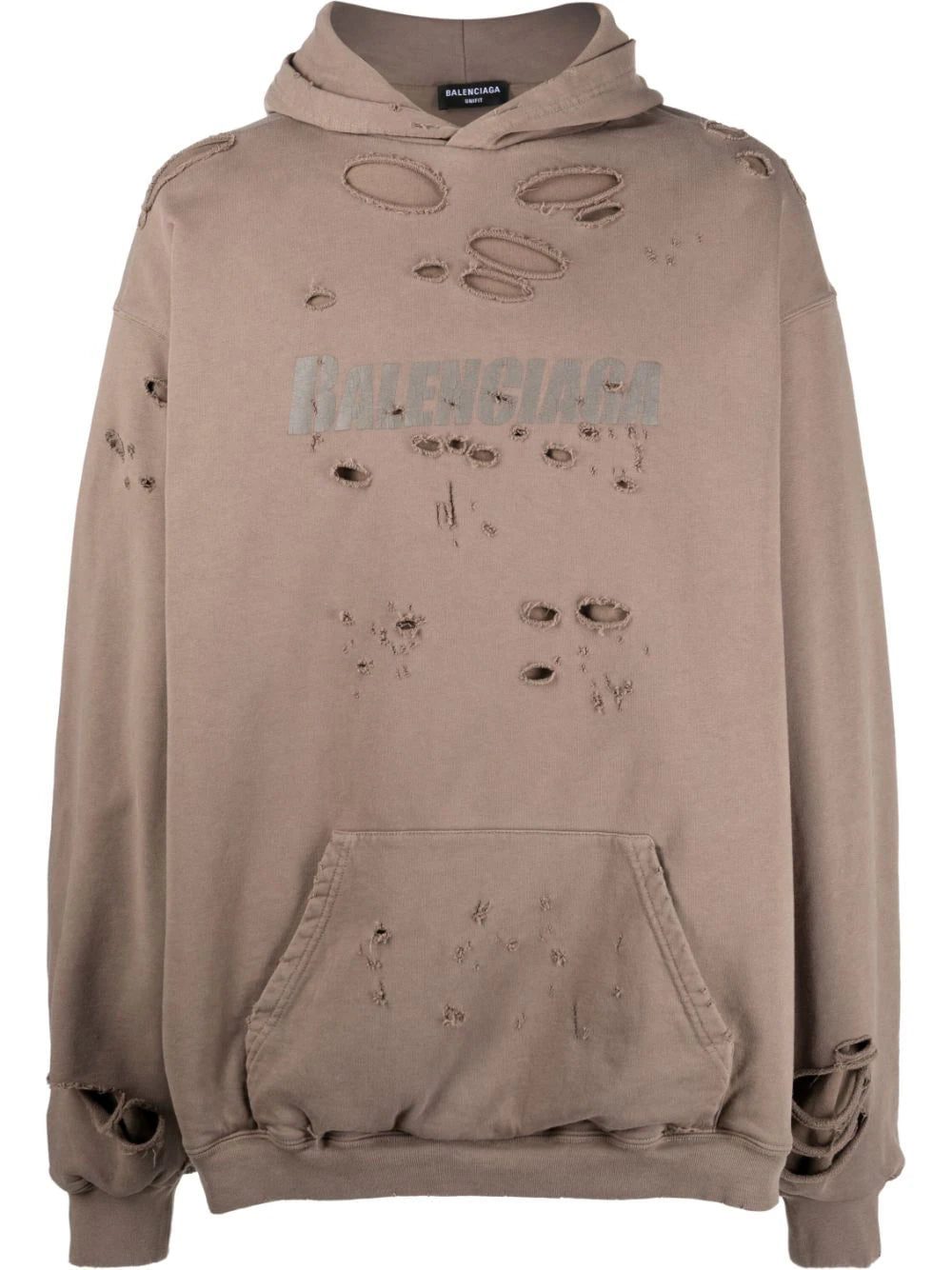 Taupe cotton logo print distressed-finish hoodie from BALENCIAGA featuring logo print at the chest, distressed finish, classic hood, long sleeves and straight hem. When buying this unisex item, keep in mind that it is graded in standard men's sizing..