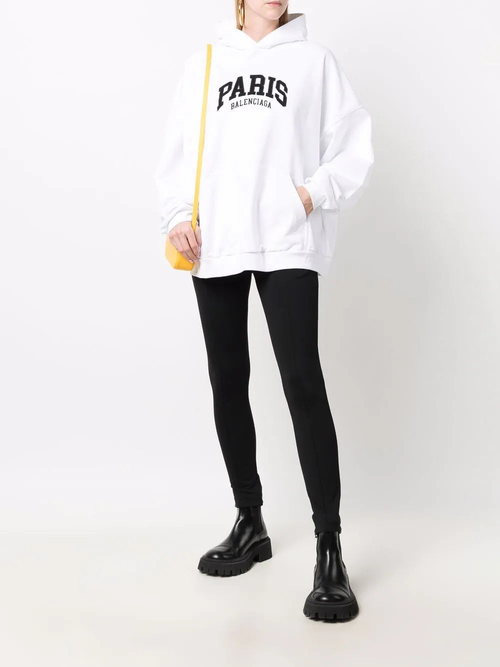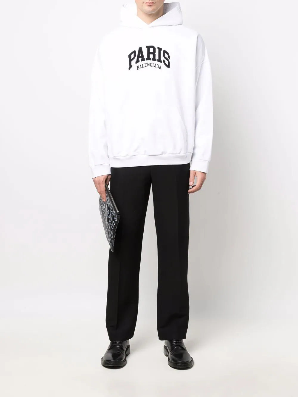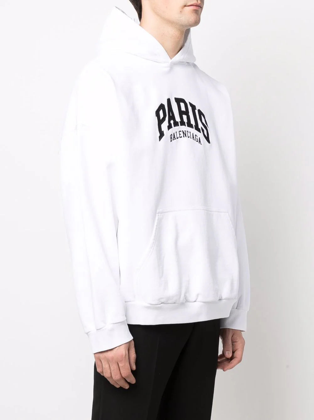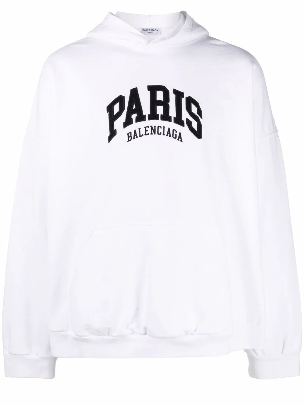 Bright-white/jet-black cotton logo-print pullover hoodie from BALENCIAGA featuring logo print to the front, classic hood, long sleeves and pullover design. POSITIVELY CONSCIOUS: This Planet Conscious product is made from at least 50% organic materials, which helps you support organic farming practices such as the restricted use of synthetic chemicals and genetically modified seeds, improved soil fertility and better livestock management..