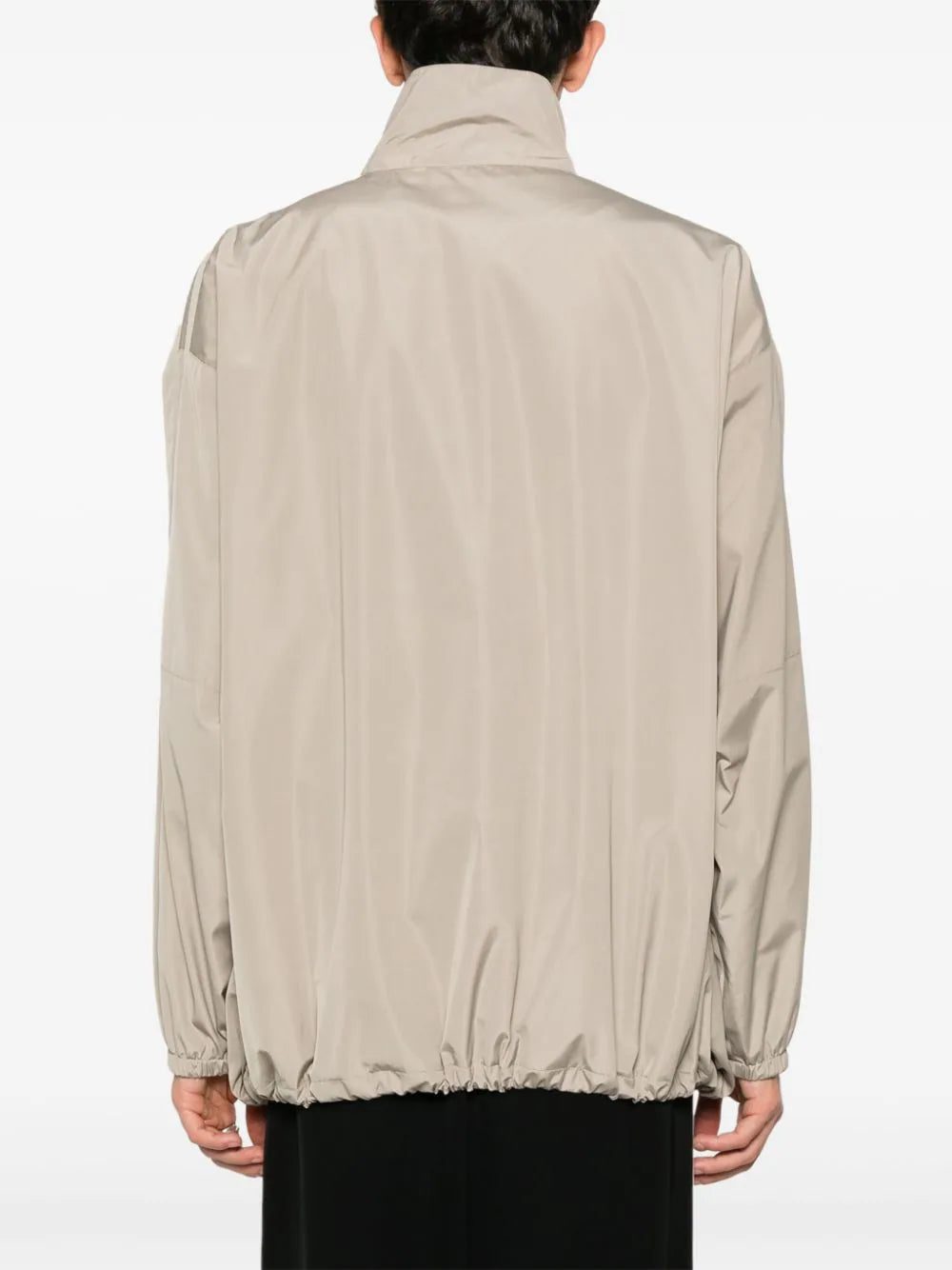 Balenciaga's streetwear sensibilities are put on display in this light-beige jacket. Cut to a minimalist windbreaker silhouette with a protective high neck and elasticated-cuff long sleeves, it is imbued with an urban quality. Meanwhile, a logo print across the front boldly announces its origins.