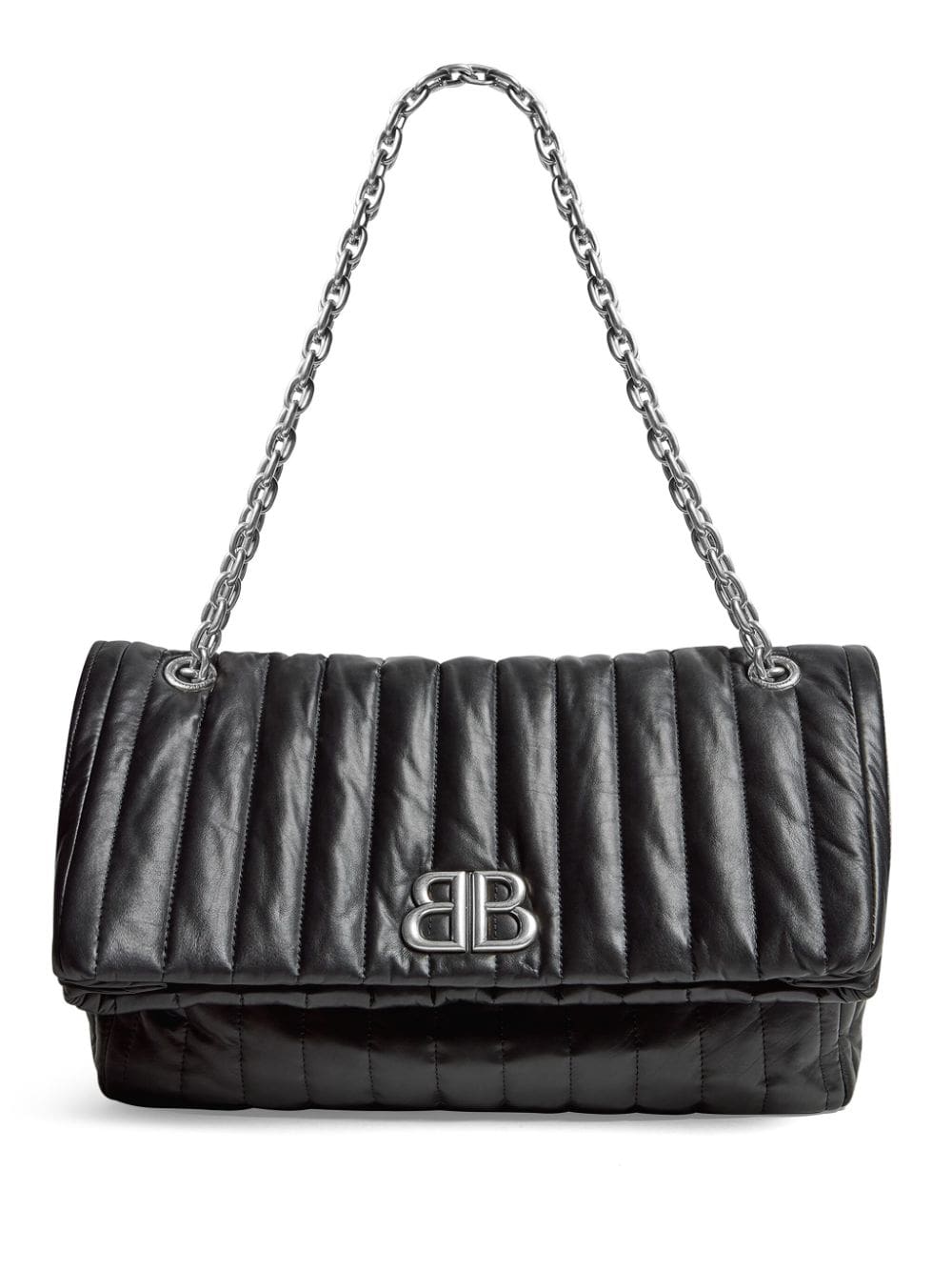 Balenciaga's iconic Monaco bag is defined by its quilted silhouette and embossed 'B' logo plaque. It's made in Italy from leather.