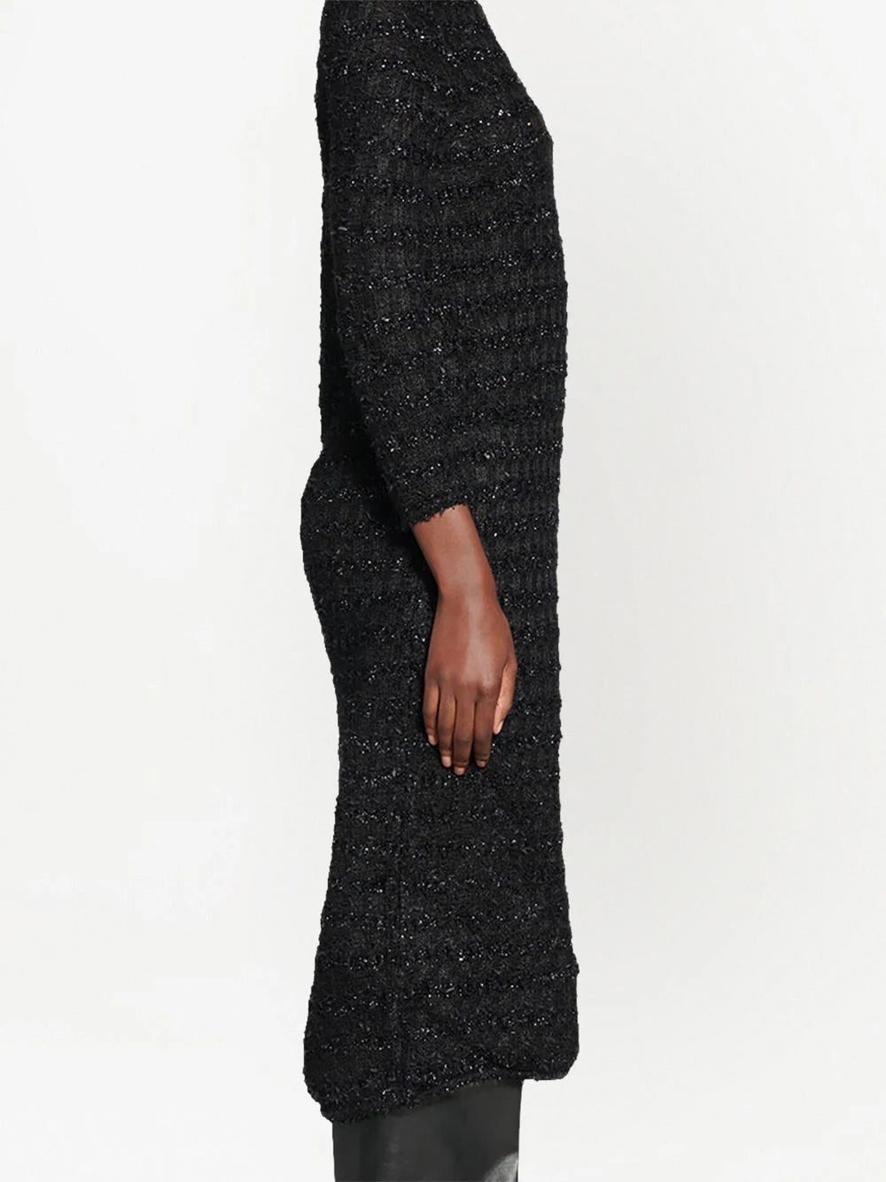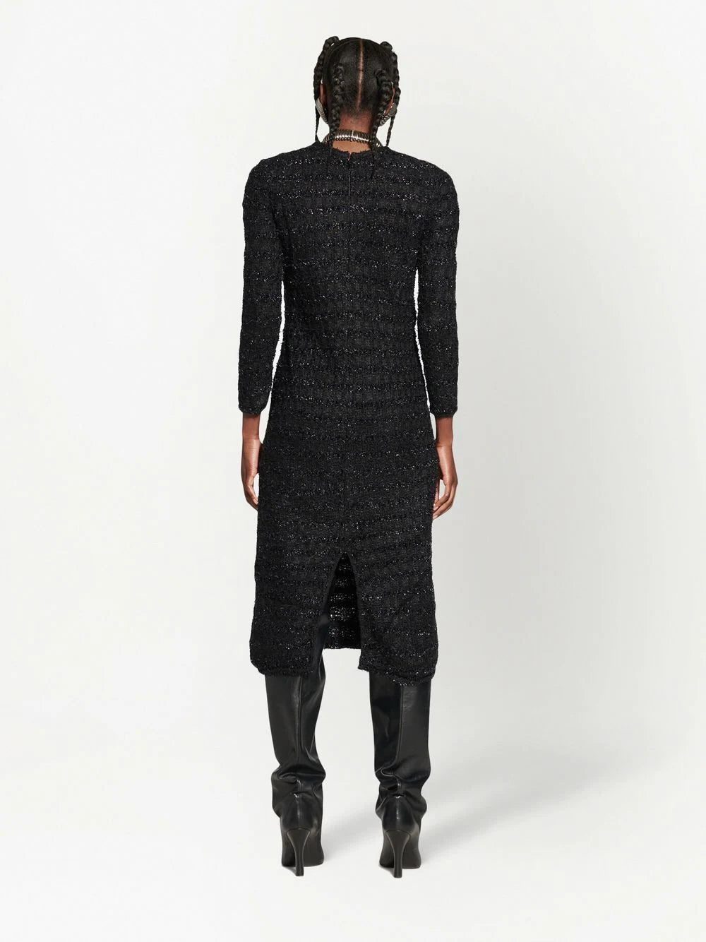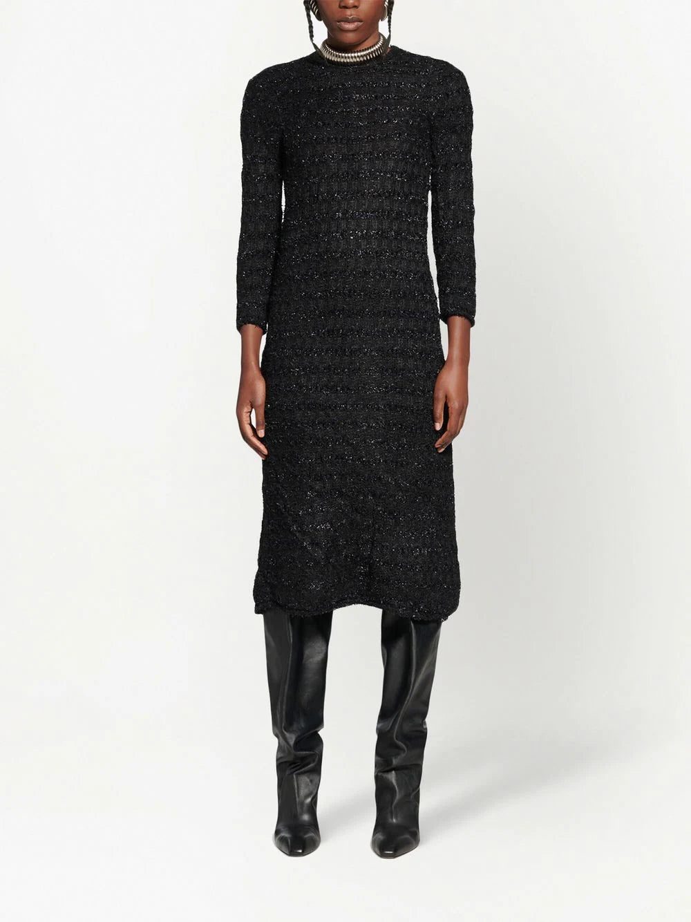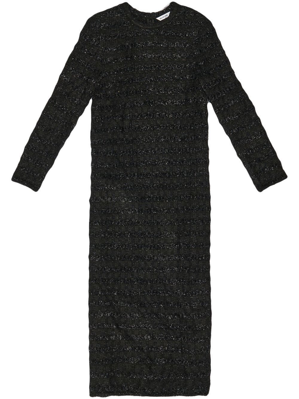 metallic-woven wool midi dress from BALENCIAGA featuring black, wool, metallic threading, round neck, long sleeves, below-knee length and straight hem. Conscious: We've partnered with Good On You – an ethical agency that rates how sustainably brands perform. This item comes from a brand that performs well in relation to their impact on the planet..