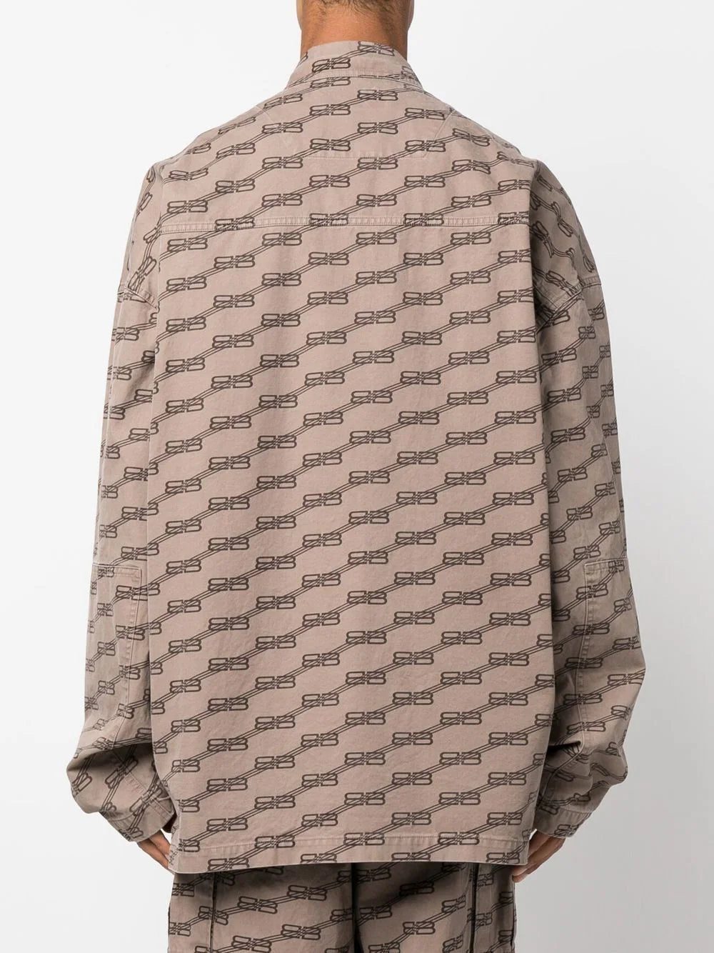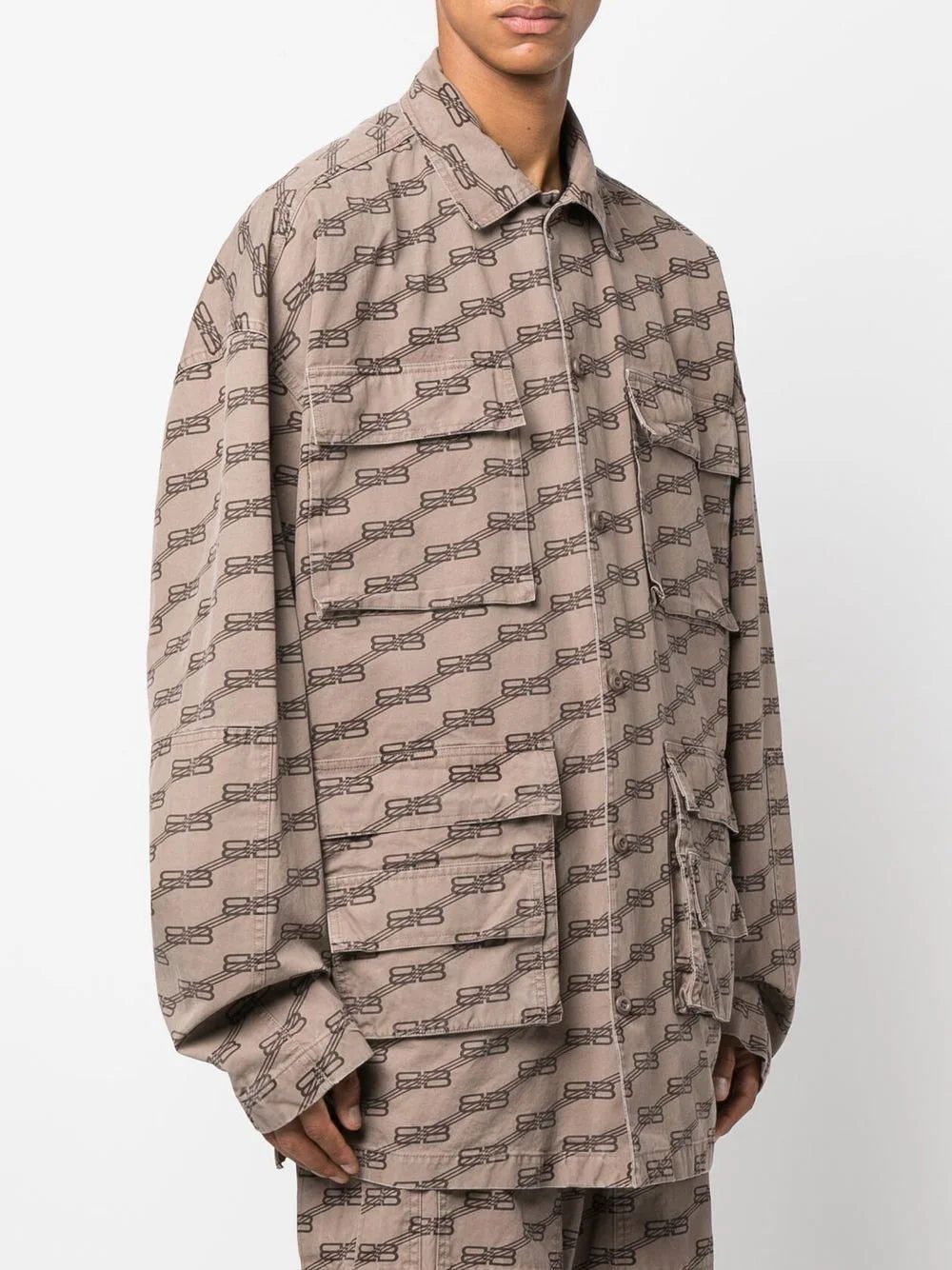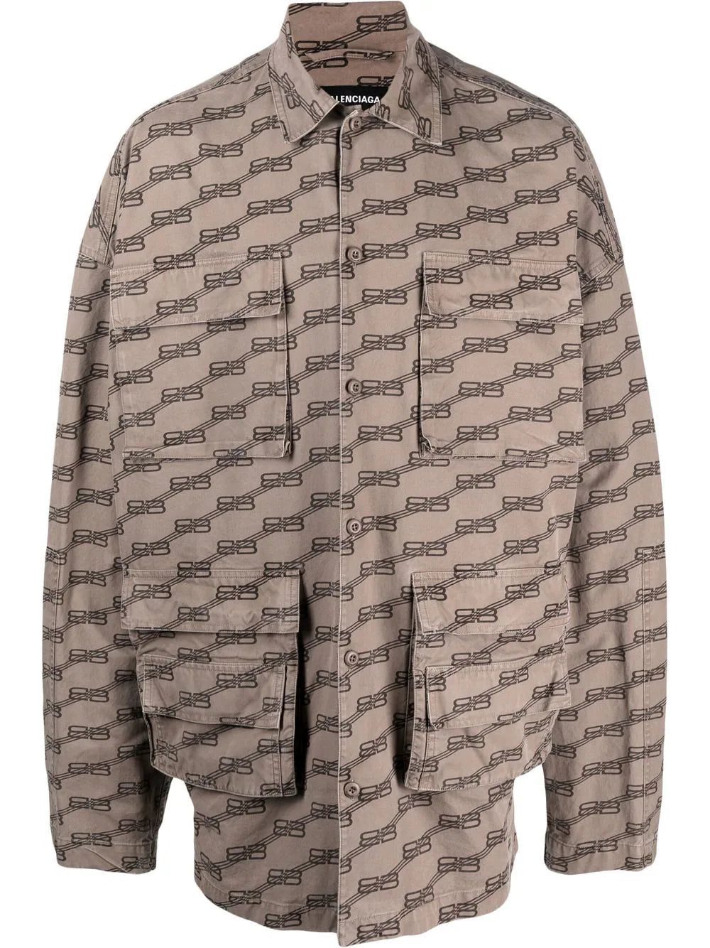 monogram-print cargo shirt from BALENCIAGA featuring beige, brown, cotton, monogram print, multiple cargo pockets, front button fastening, classic collar and long sleeves. Conscious: We've partnered with Good On You – an ethical agency that rates how sustainably brands perform. This item comes from a brand that performs well in relation to their impact on the planet..