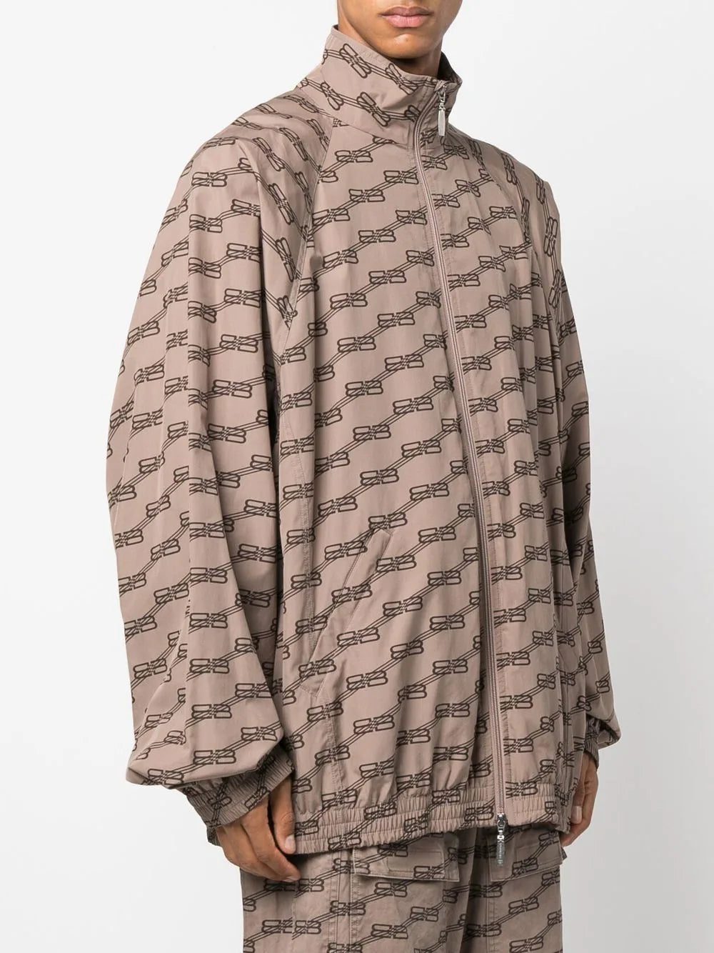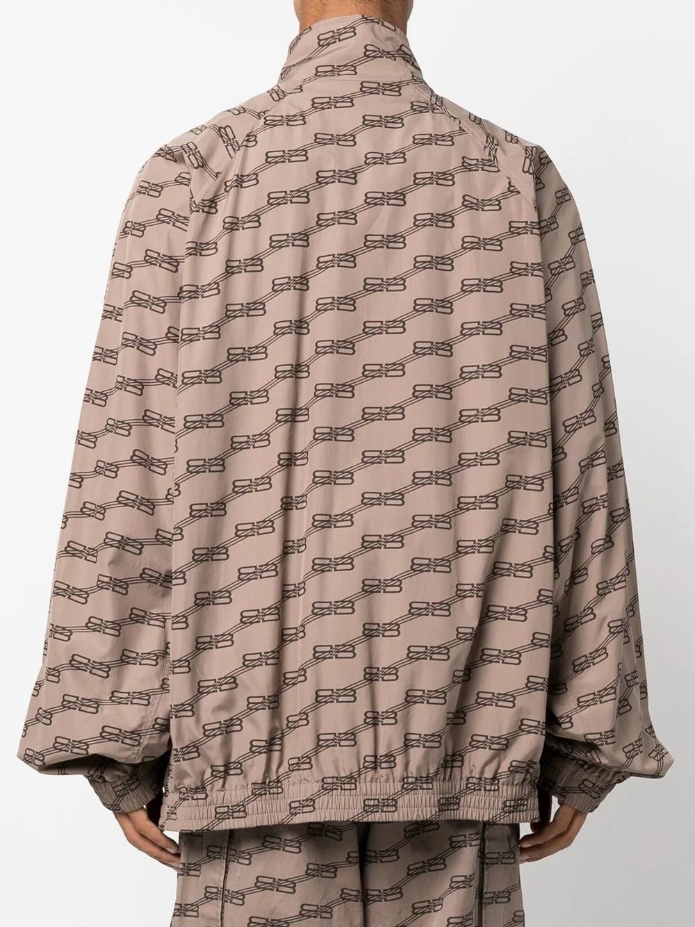 monogram-print track jacket from BALENCIAGA featuring beige, brown, cotton, monogram print, front zip fastening, high neck and long sleeves. Conscious: We've partnered with Good On You – an ethical agency that rates how sustainably brands perform. This item comes from a brand that performs well in relation to their impact on the planet..