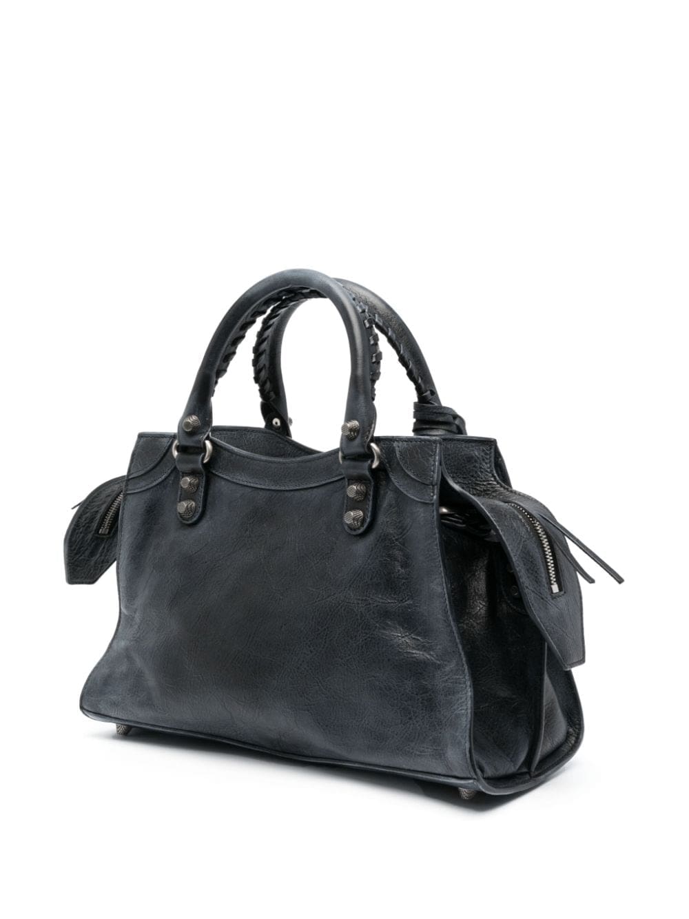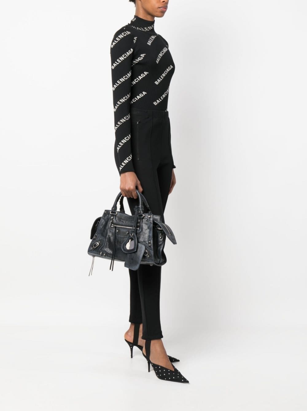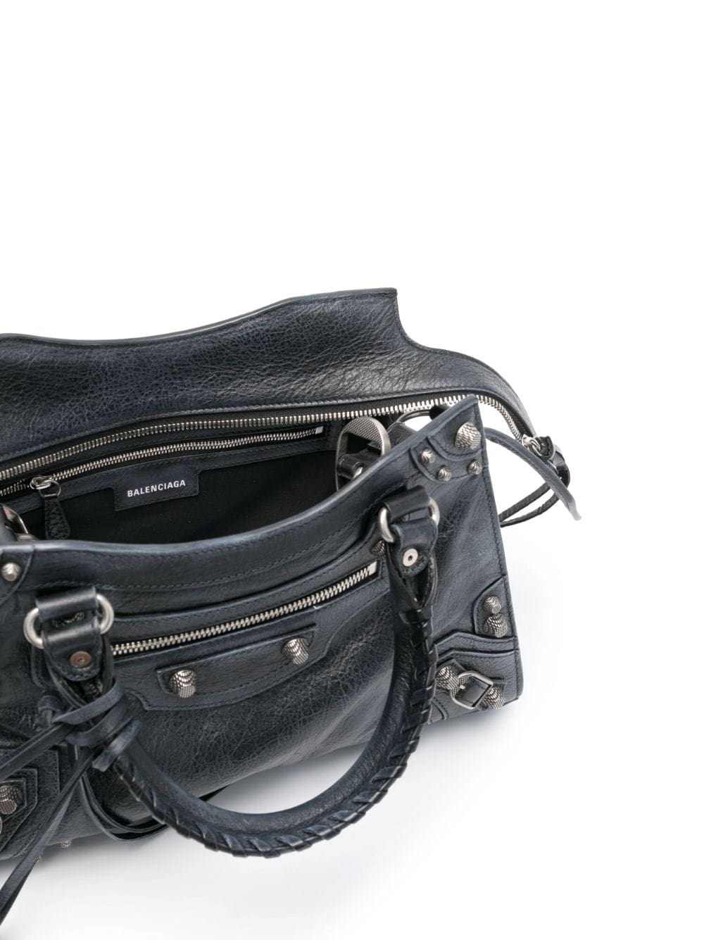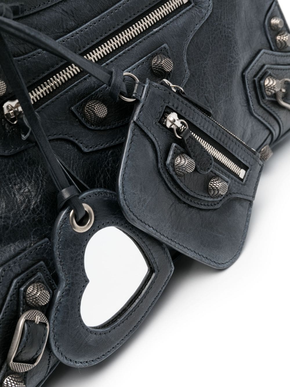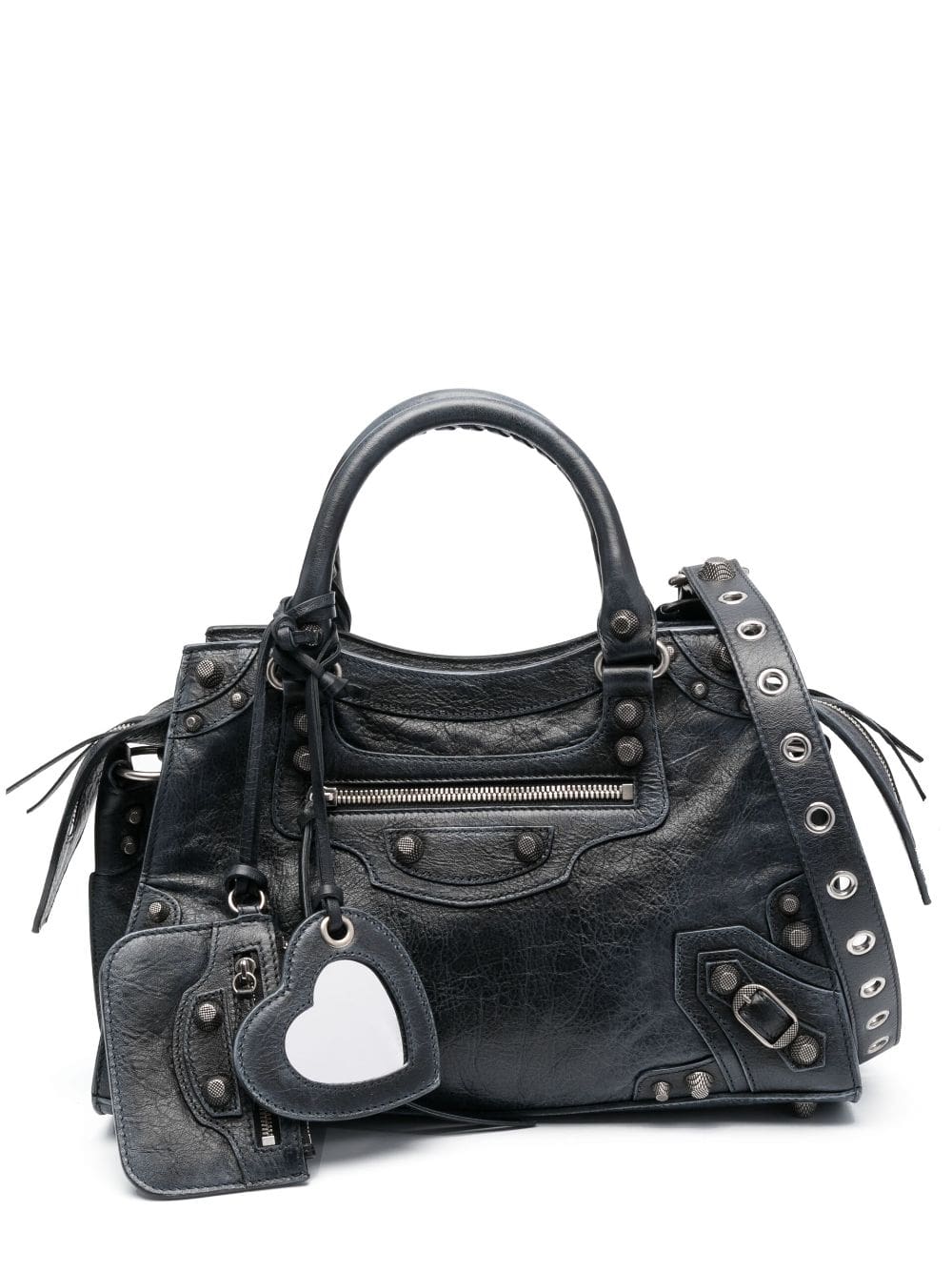 Balenciaga's Neo Cagole City shoulder bag is inspired by the brand's signature moto-inspired styles. This black iteration is accented with studs and eyelets that trace the distressed leather construction, It comes with a handy heart-shaped mirror tag and zipped pouch.