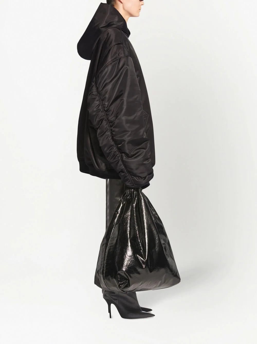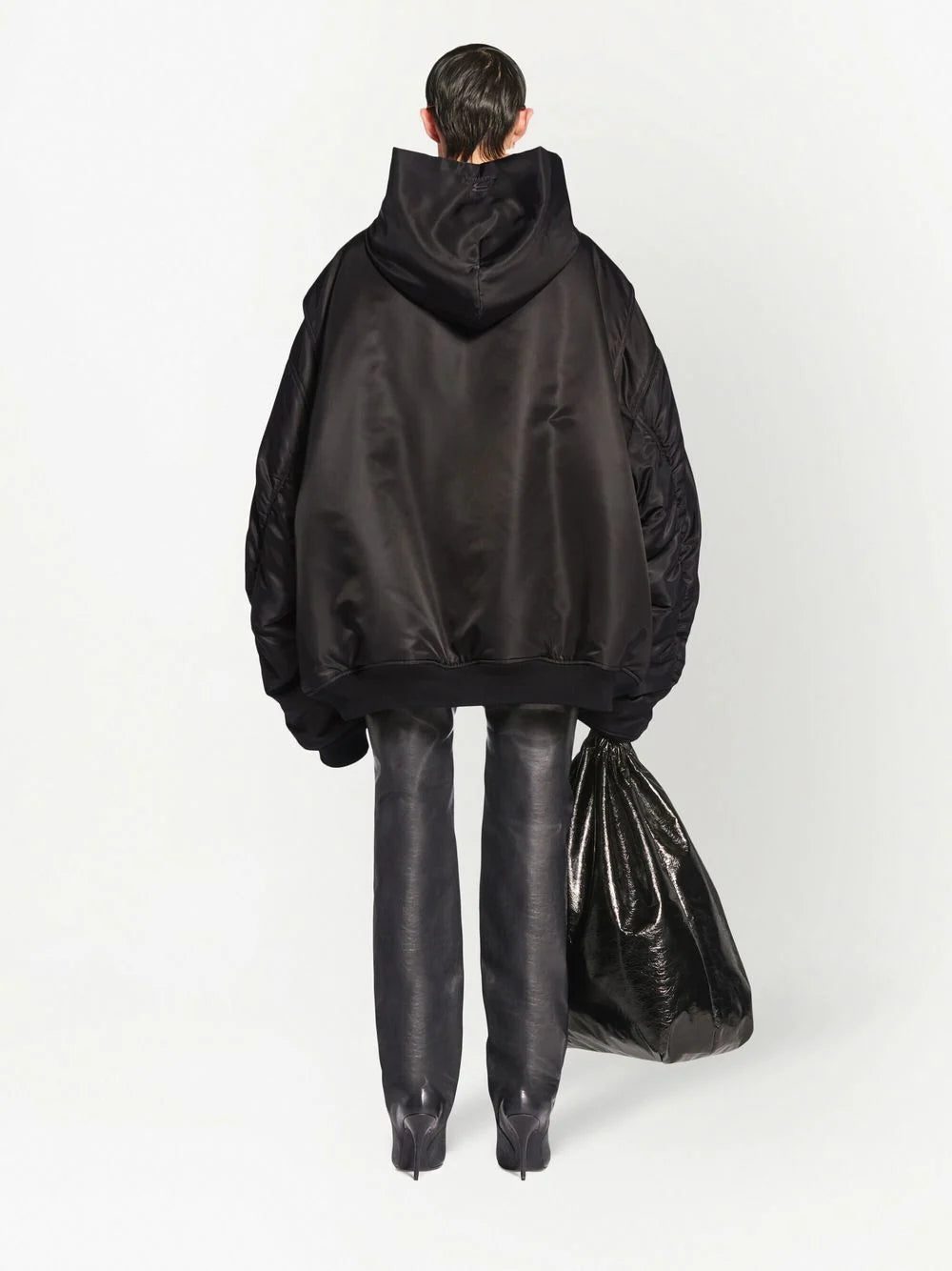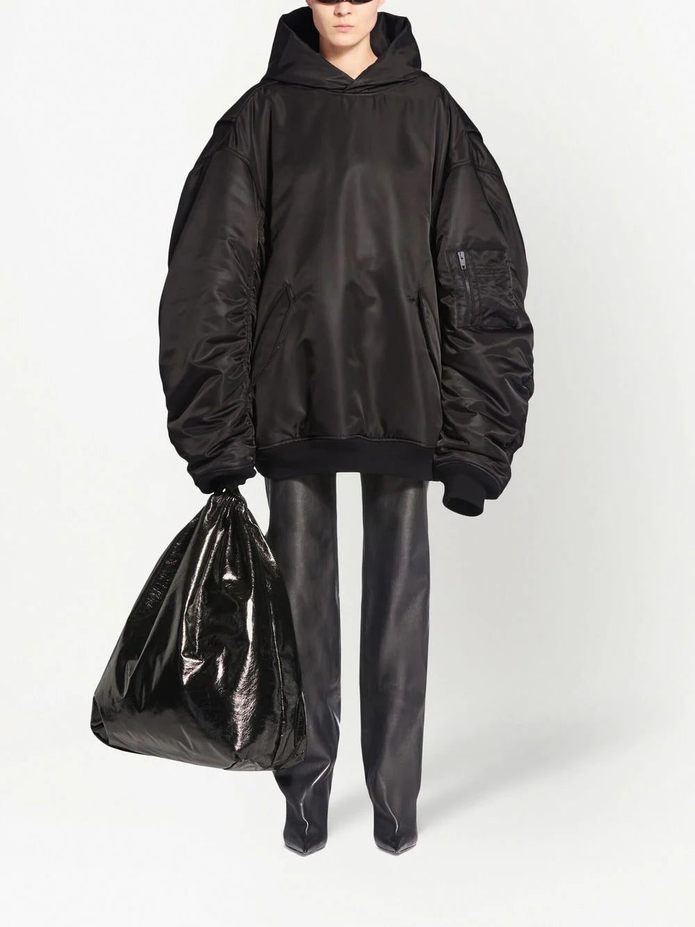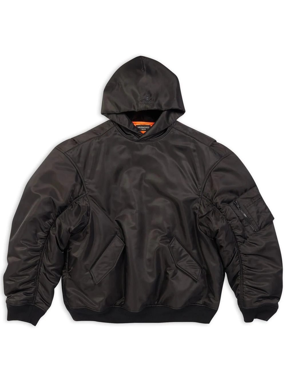 oversized-cut bomber hoodie from BALENCIAGA featuring long sleeves, sleeve zip pocket, two front flap pockets, jet black, oversized cut and classic hood. Conscious: We've partnered with Good On You – an ethical agency that rates how sustainably brands perform. This item comes from a brand that performs well in relation to their impact on the planet..