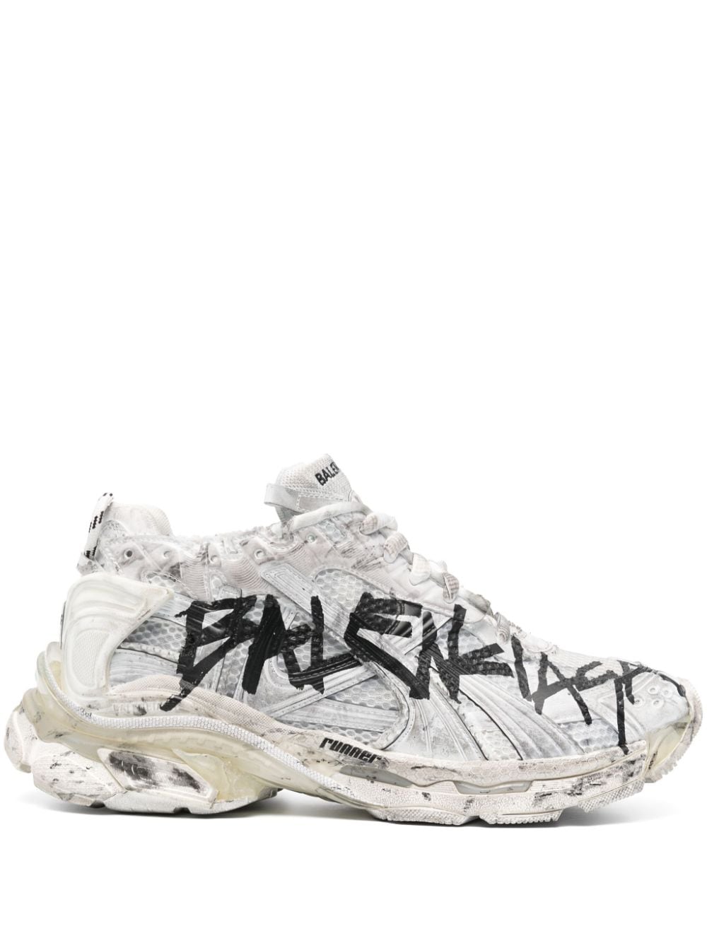 Balenciaga's iconic Runner sneakers are inspired by retro track styles from the '90s, as their name suggests. These ones sport the signature panelled mesh upper but are elevated by a graffiti print and distressed detailing at the chunky rubber sole.