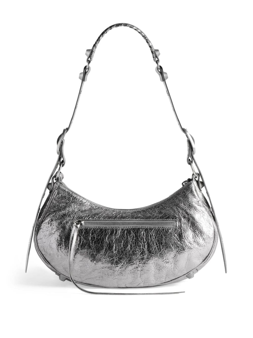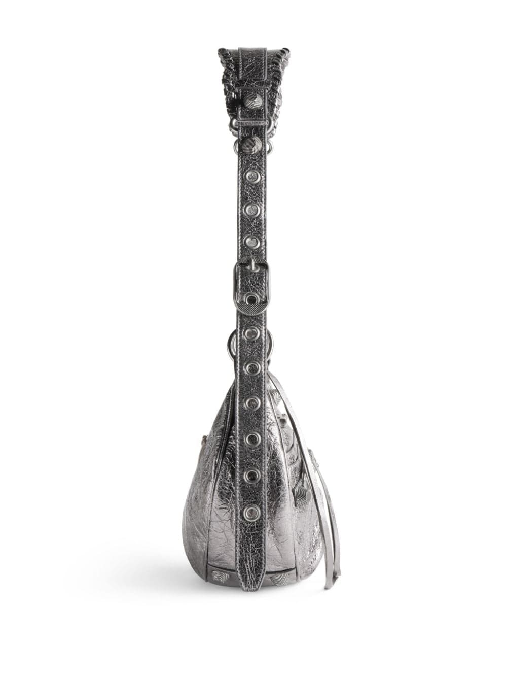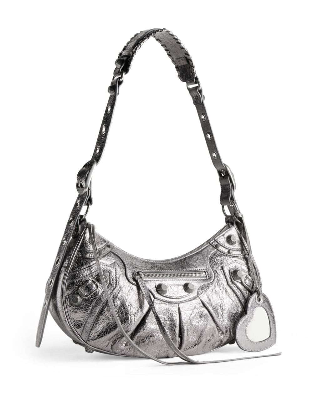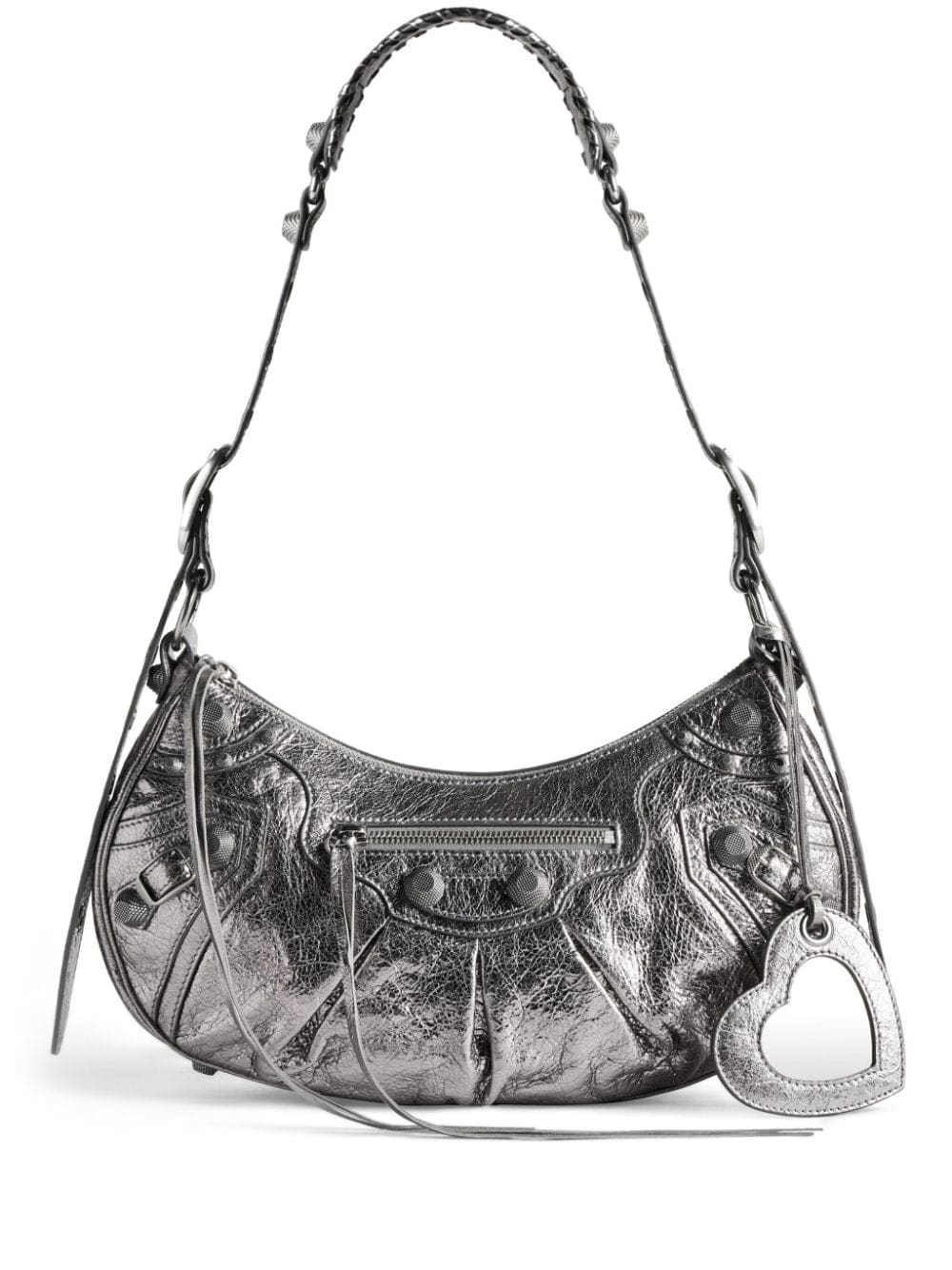 Balenciaga look to the turn of the millennium for their noughties-inspired Le Cagole shoulder bag. Constructed in a hemispherical shape with a foldover strap and magnetic fastening, it is punctuated with metal studs, whilst a detachable heart-shaped mirror and pouch charm add playfulness to it's bold design.