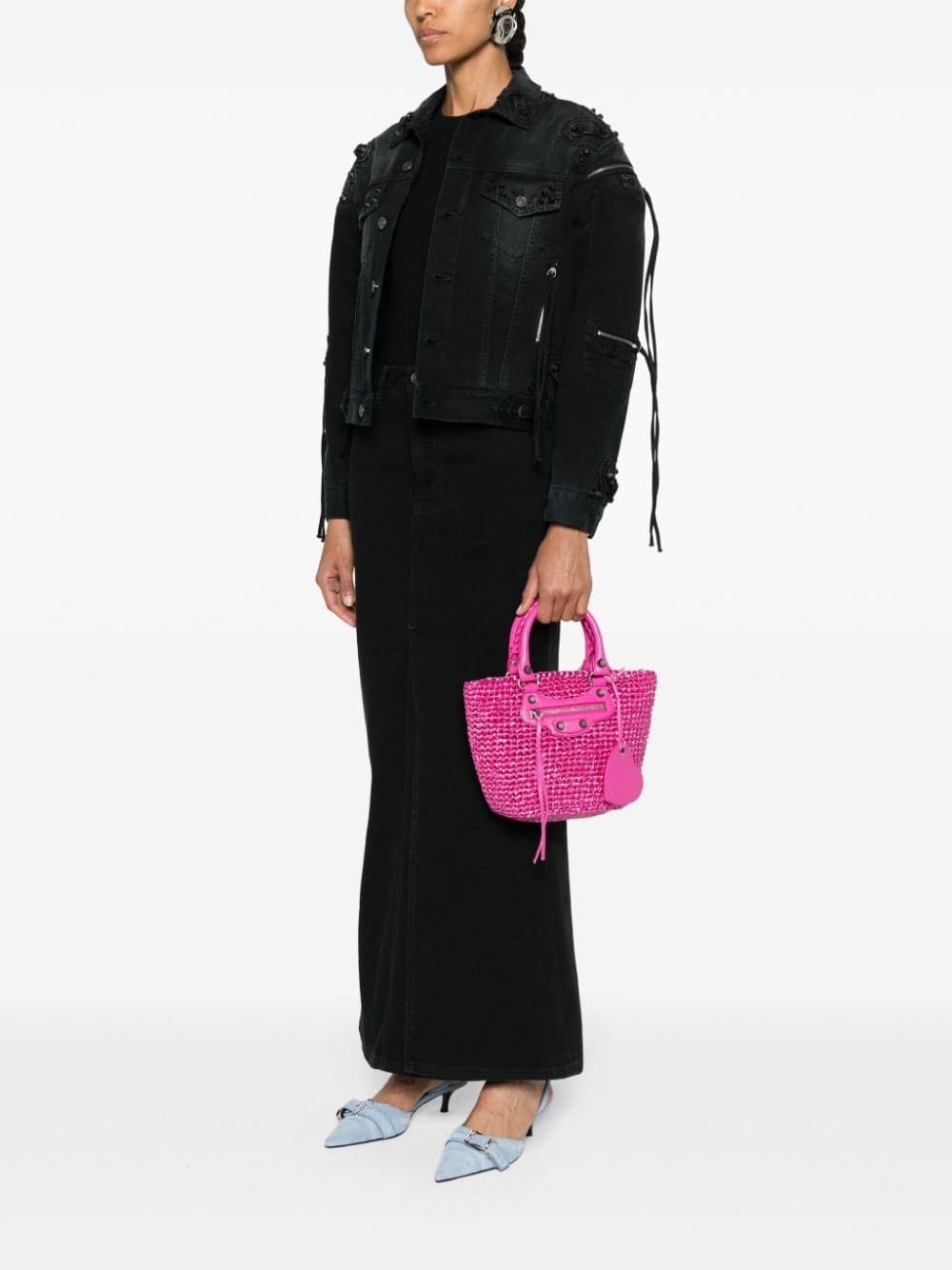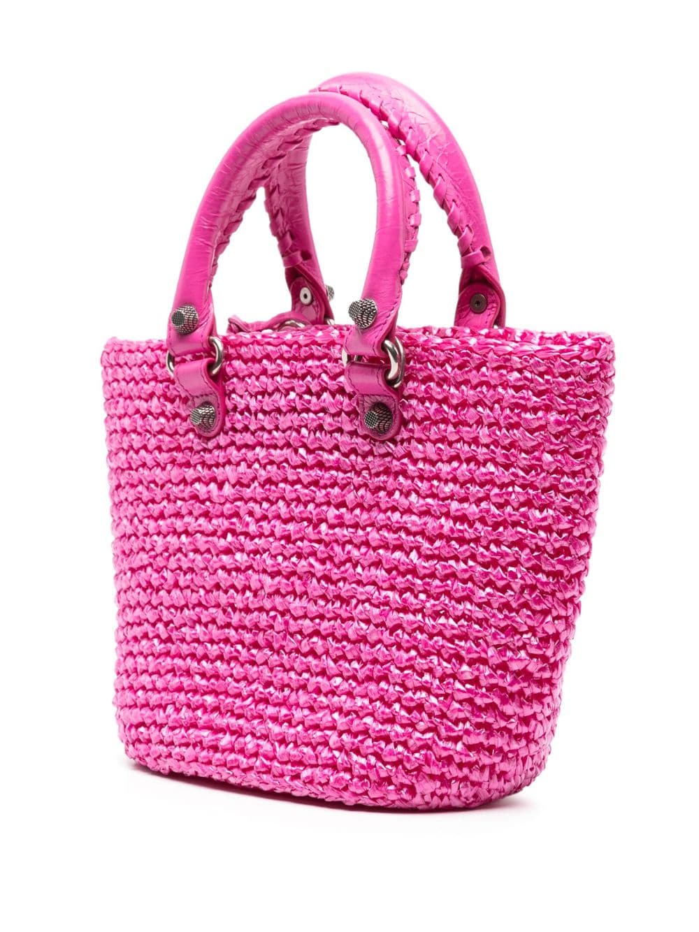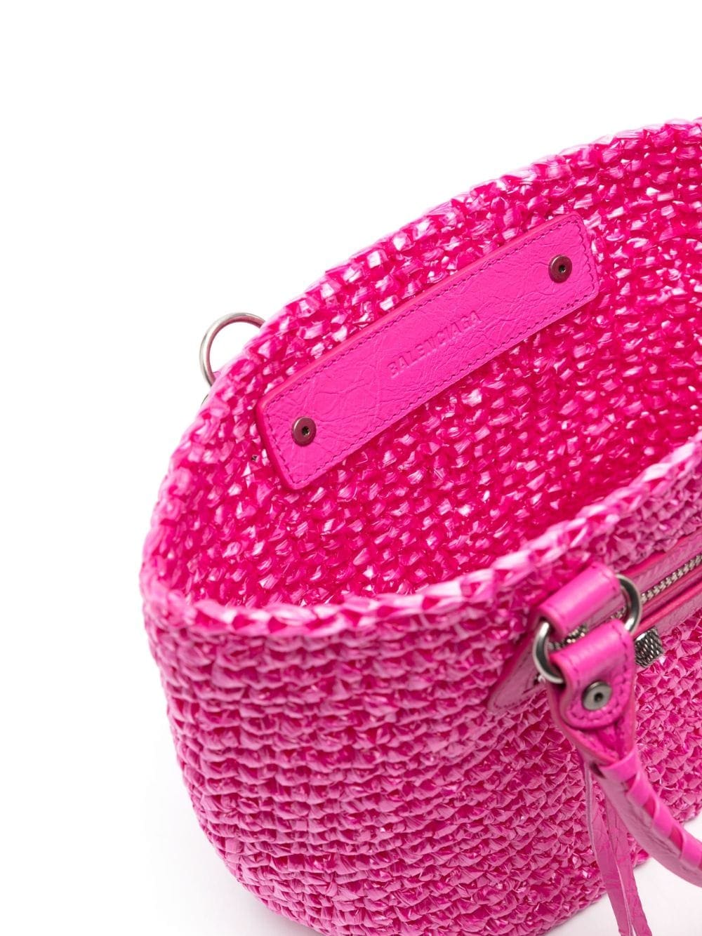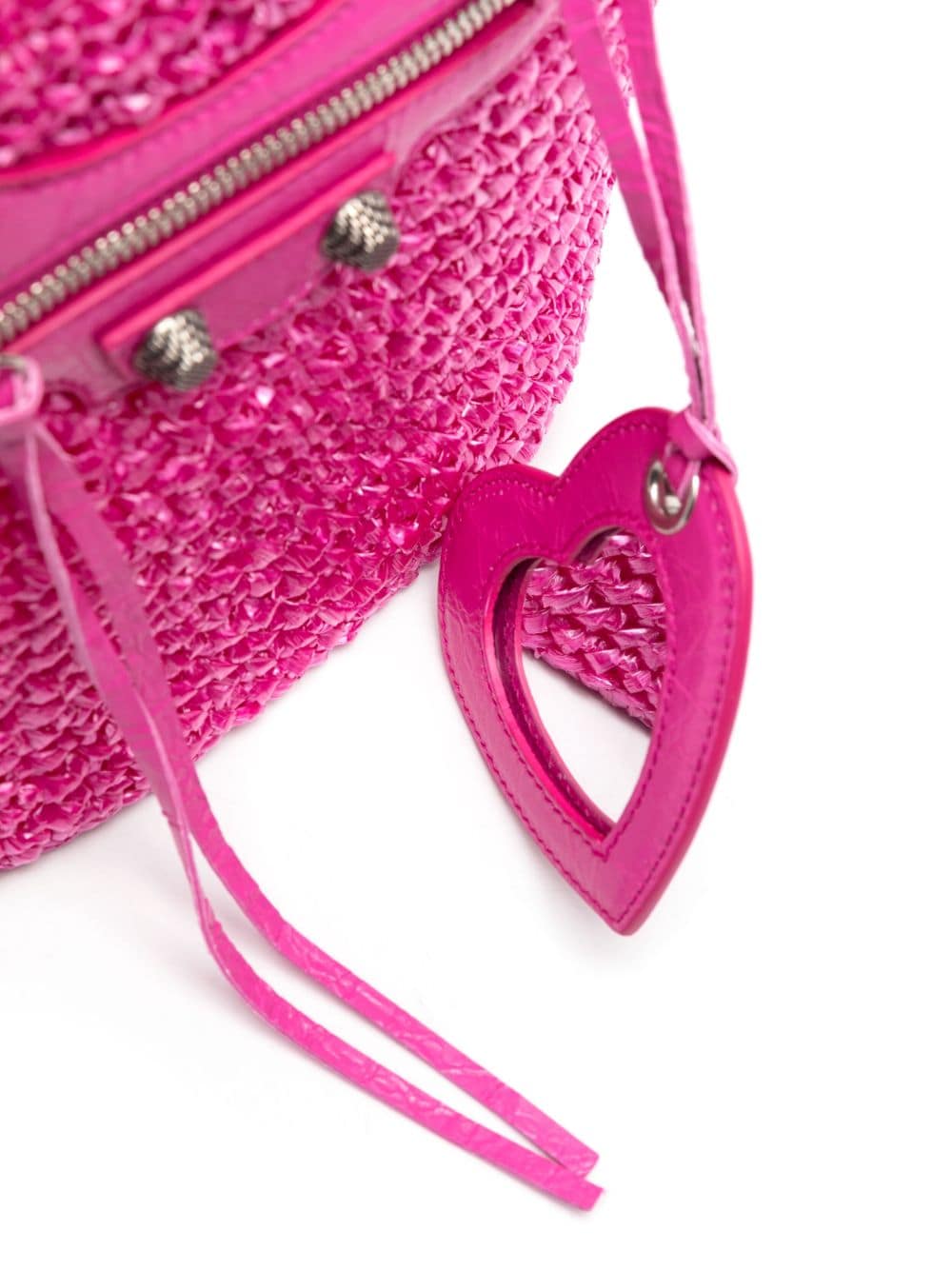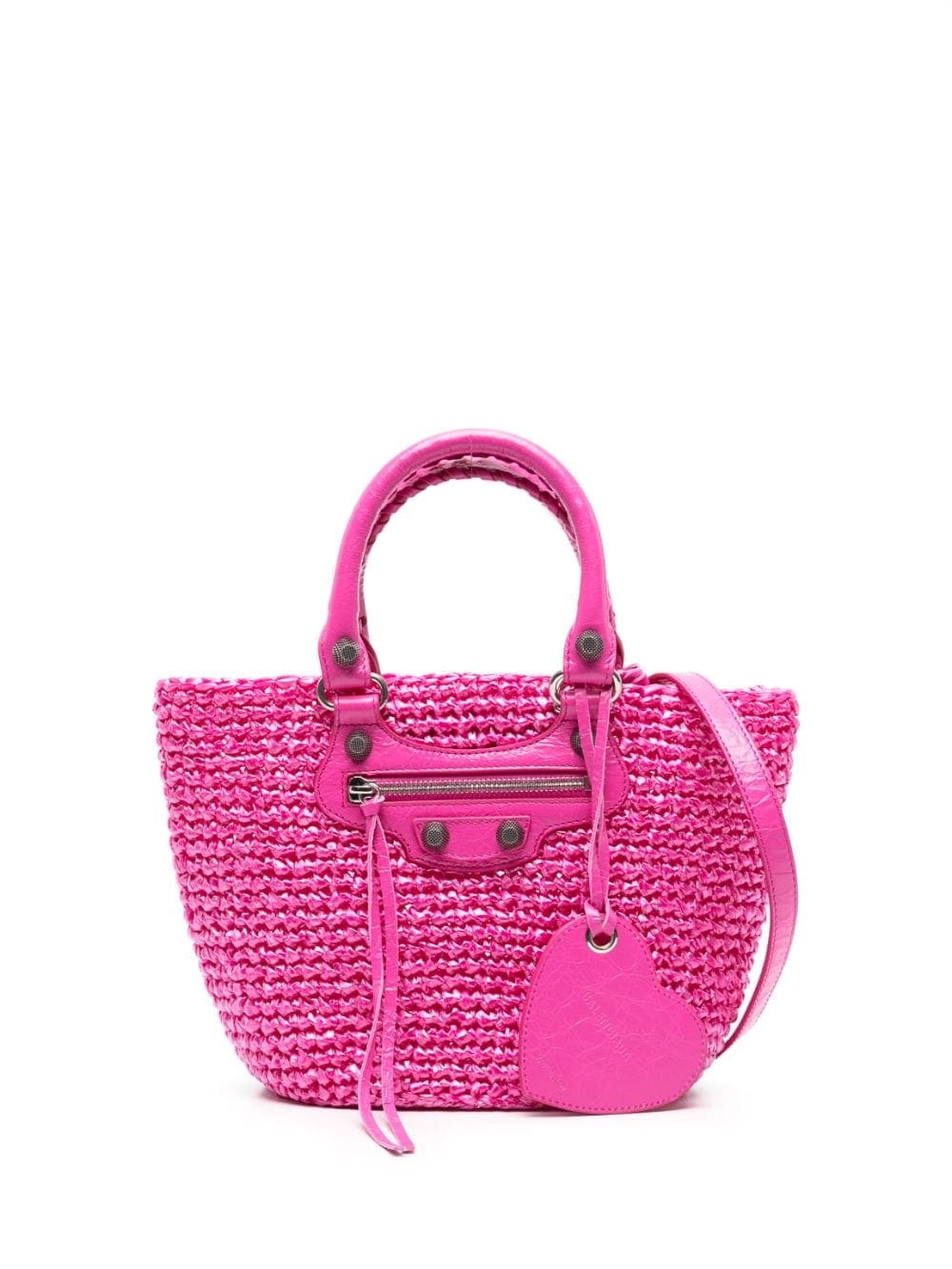 Balenciaga's Le Cagole tote bag is updated here with a nylon raffia effect. Presented in pink, it features a monochromatic design enhanced by aged-silver hardware and one removable heart mirror.