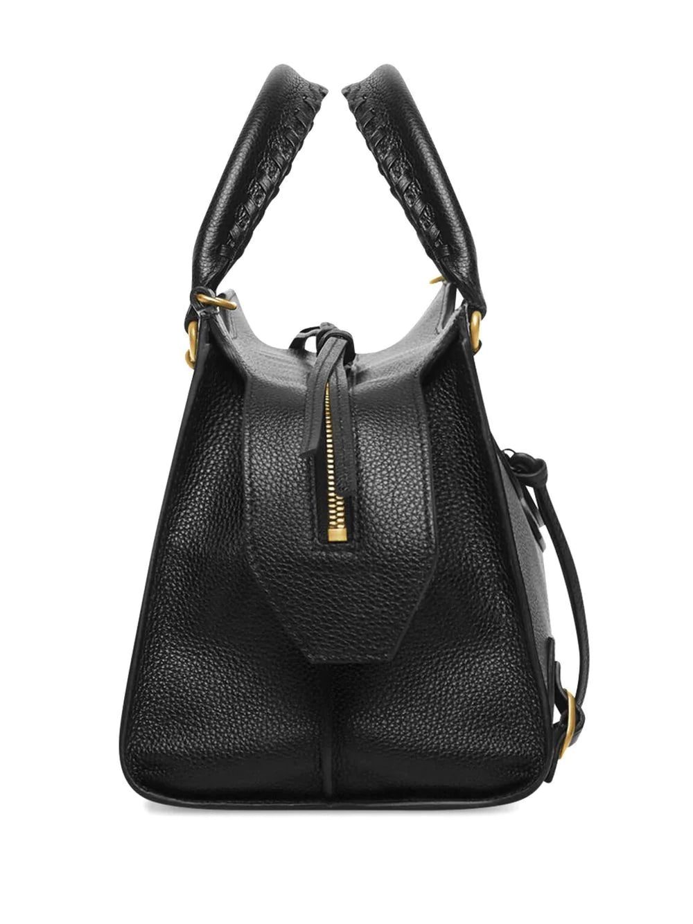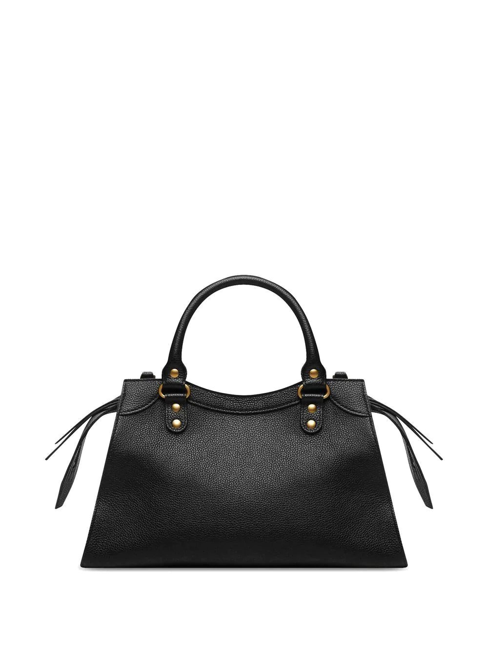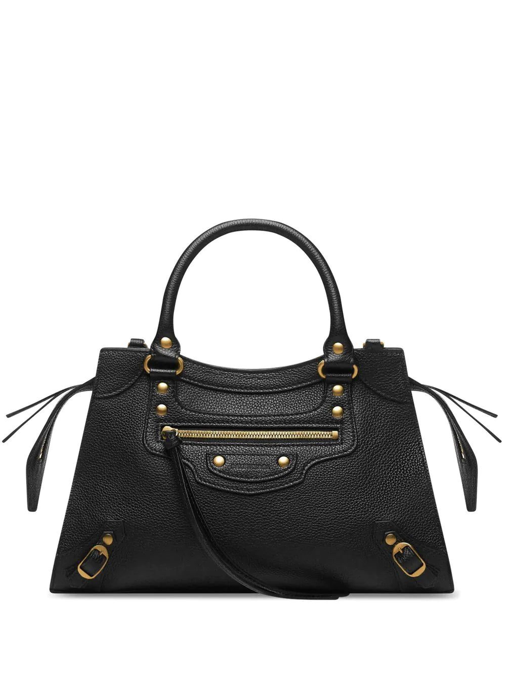 small Neo Classic tote bag from BALENCIAGA featuring black, calf leather, grained texture, logo patch to the front, decorative buckle detailing, gold-tone hardware, whipstitch top handles, two-way zip fastening, front zip-fastening pocket and adjustable detachable shoulder strap. POSITIVELY CONSCIOUS: We've partnered with Good On You — an ethical agency that rates how sustainably brands perform across various people, planet and animal welfare criteria. This product comes from a Conscious brand that performs well in relation to their impact on the planet, for example ensures the use of materials that limit the amount of chemicals, water and wastewater involved in production processes..