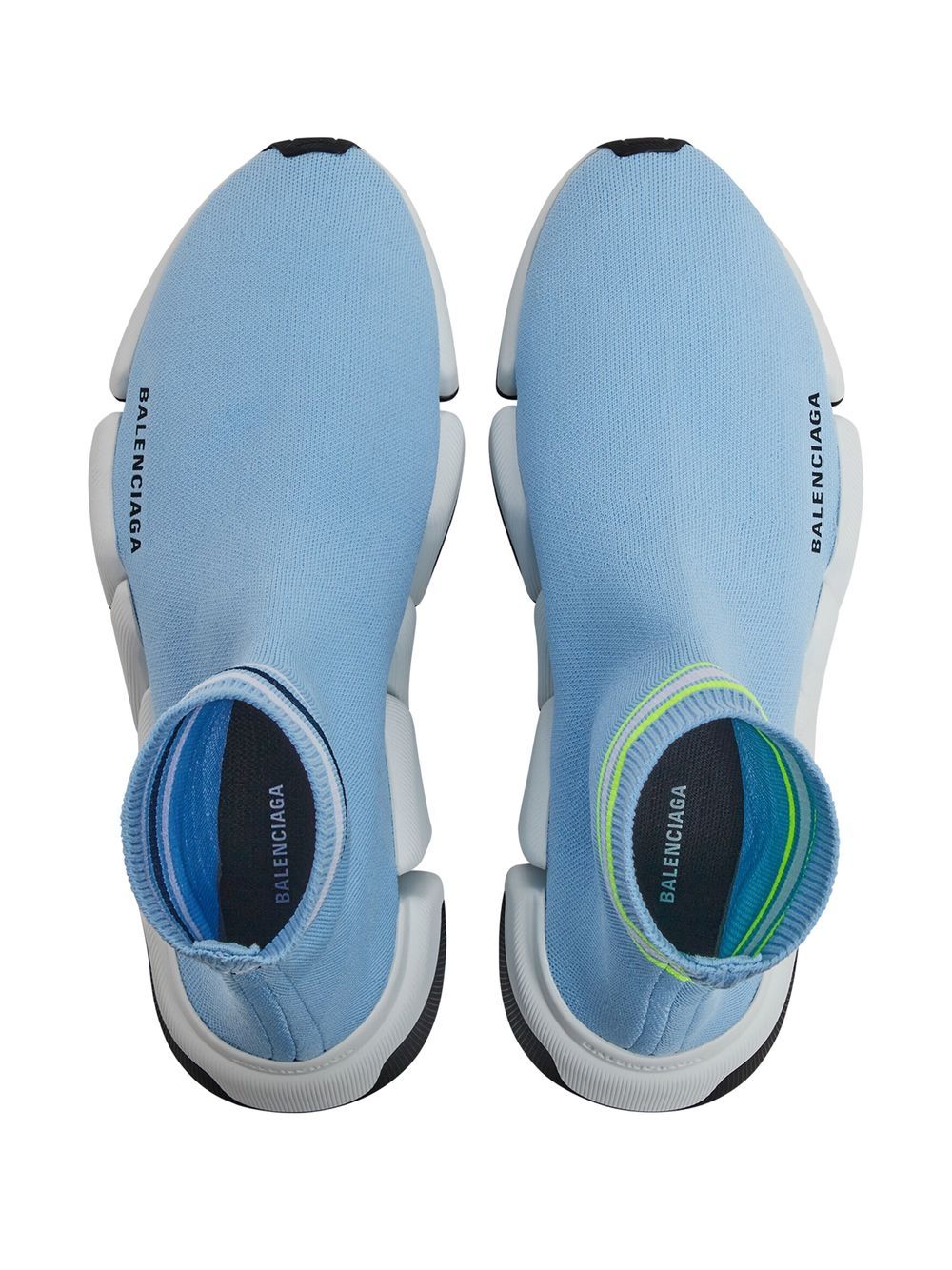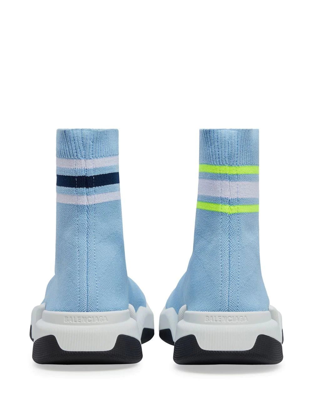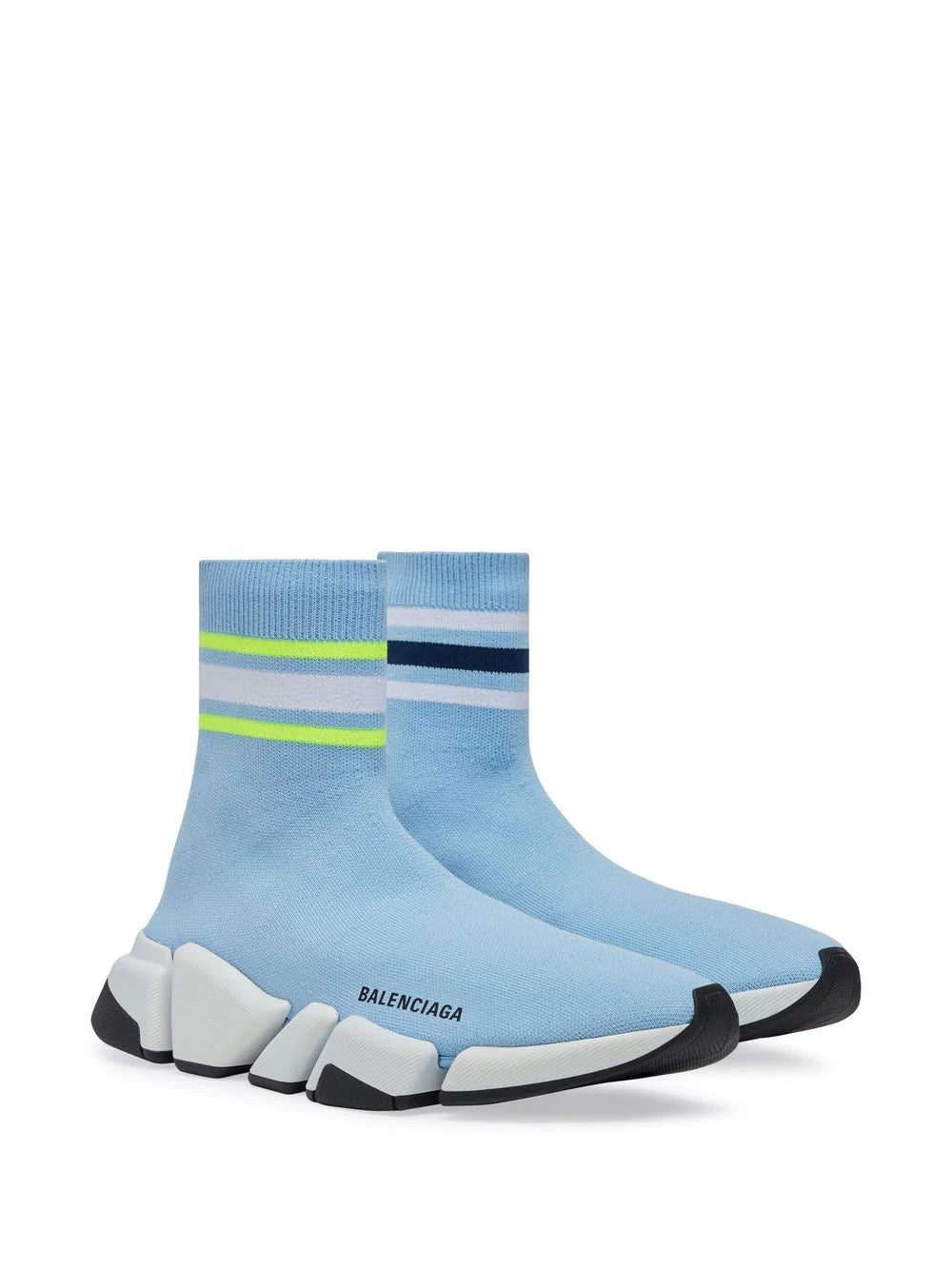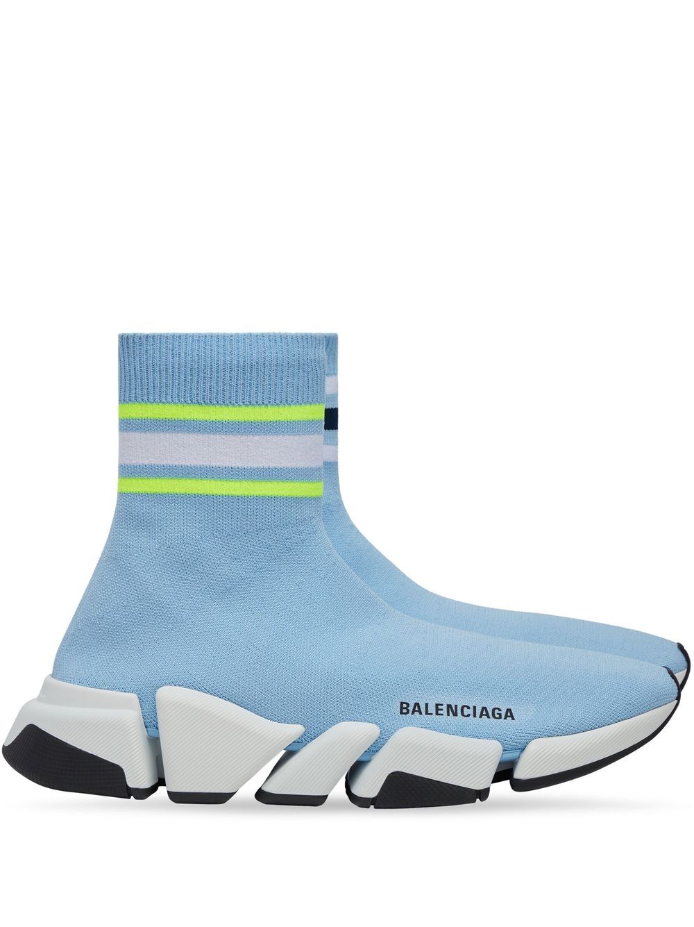Speed 2.0 sock-style sneakers from BALENCIAGA featuring light yellow, blue, knitted upper, logo print to the side, stripe trim, ankle-length, pull-on style and chunky rubber sole. Conscious: We've partnered with Good On You – an ethical agency that rates how sustainably brands perform. This item comes from a brand that performs well in relation to their impact on the planet..