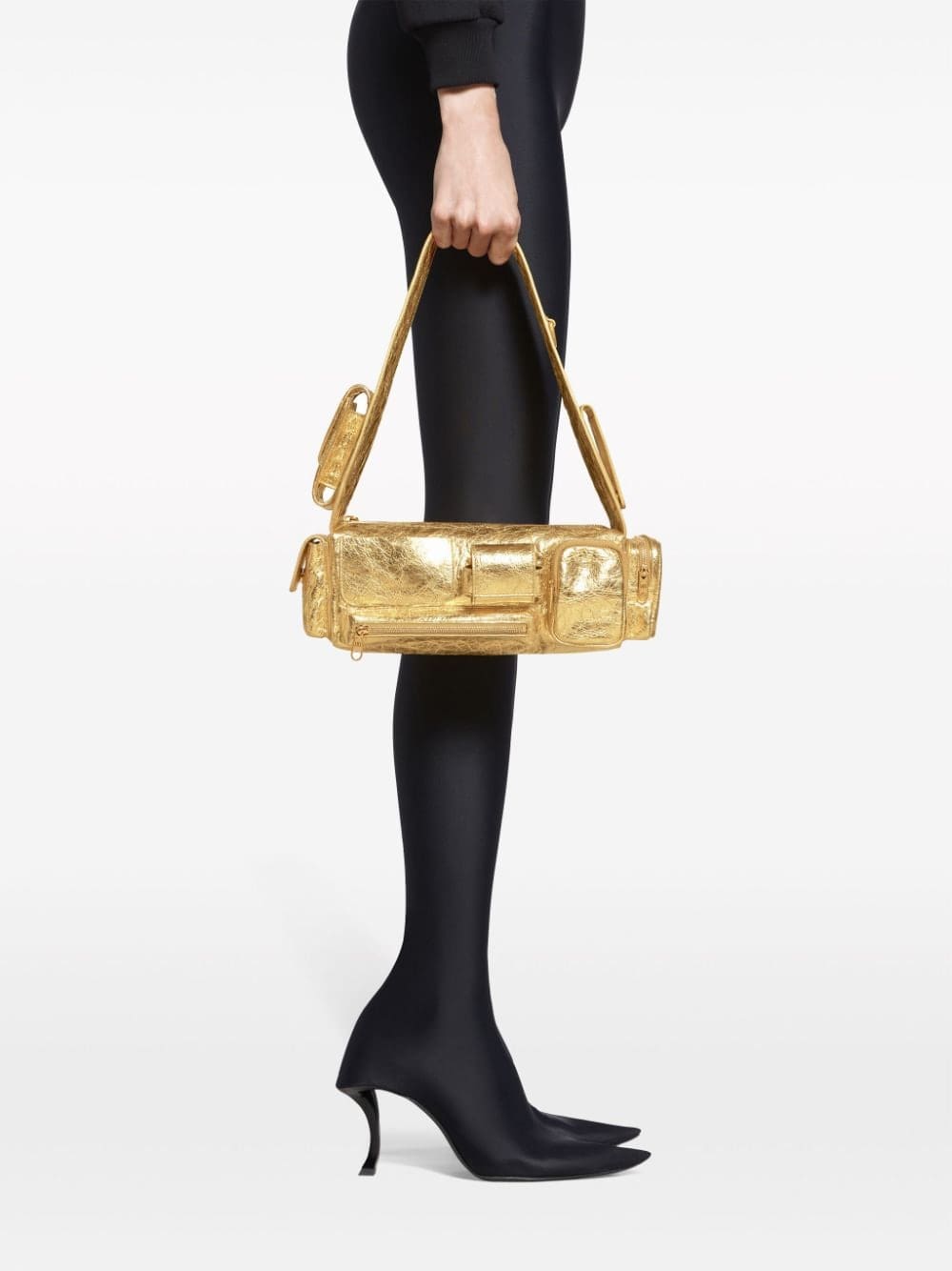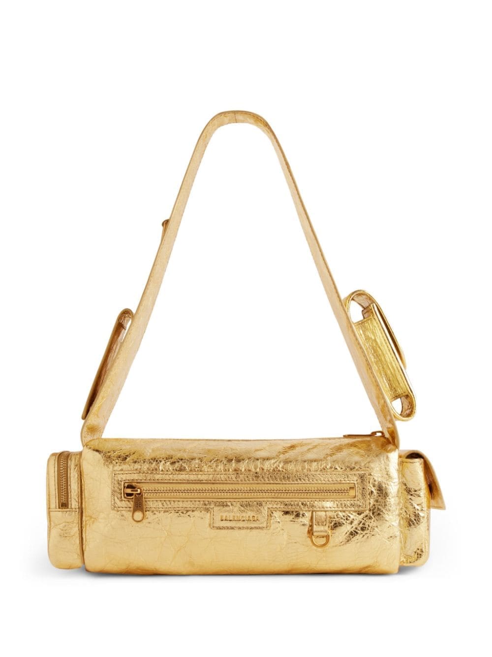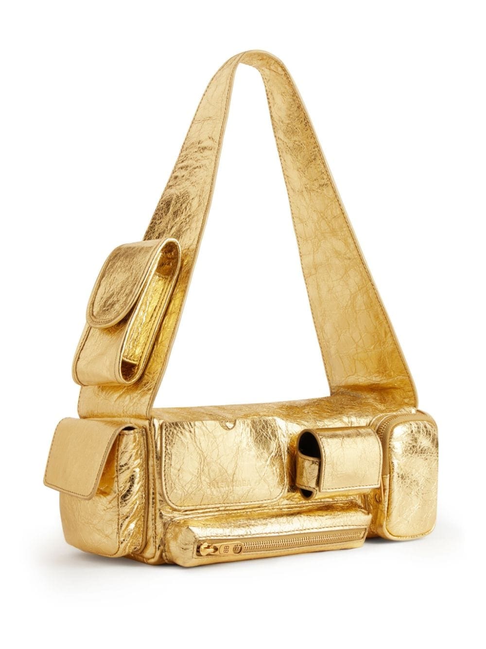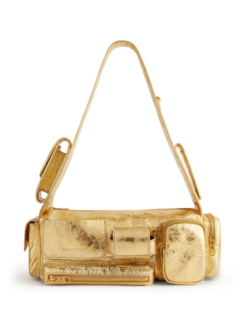 Balenciaga's relaxed utilitarian-inspired aesthetic is showcased with the Superbusy shoulder bag, presented in the small iteration. Crafted from smooth leather in a metallic finish, it's defined by multiple pockets and compartments.
