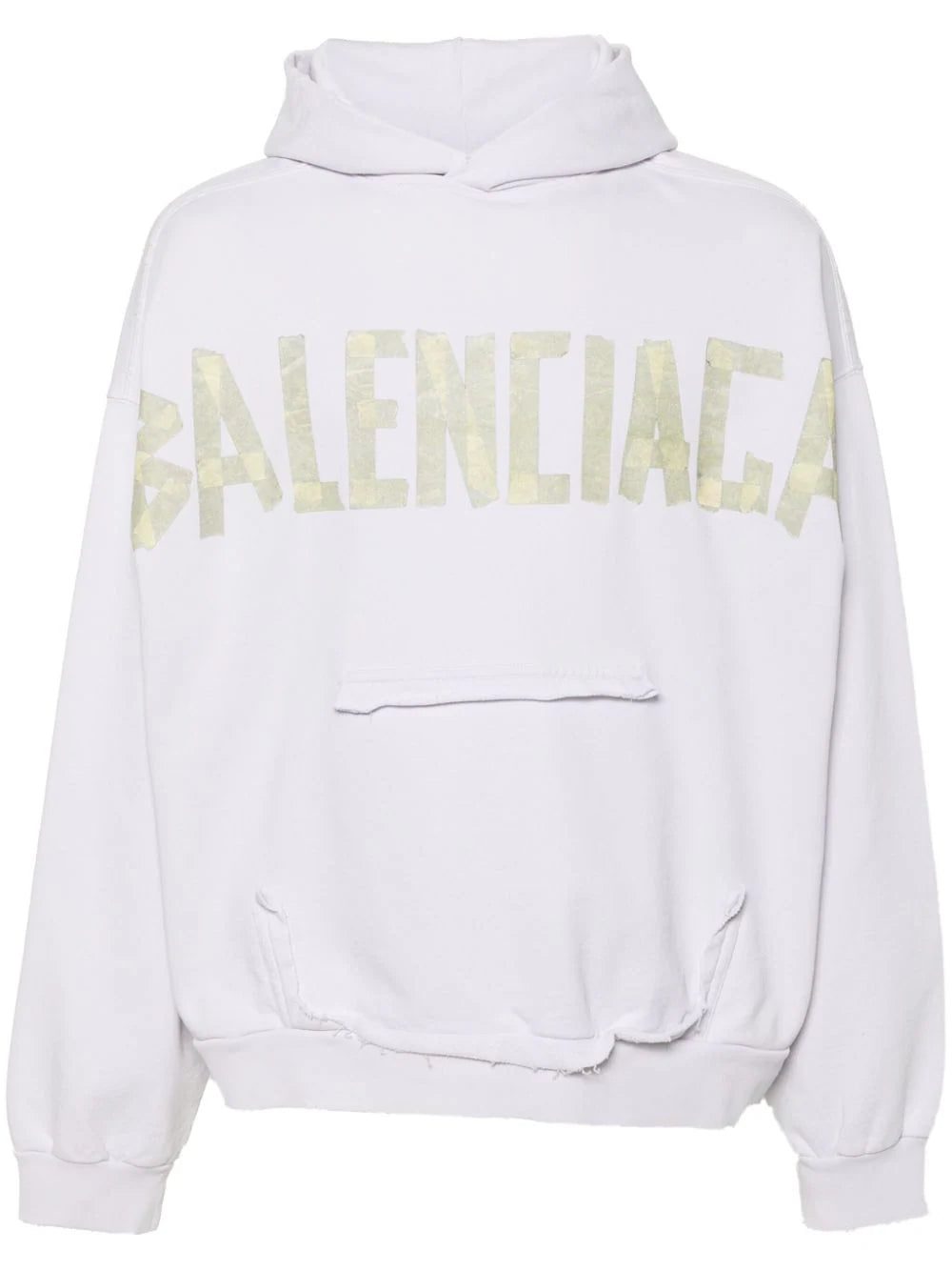 Balenciaga's penchant for a deconstructive aesthetic comes to life in this white cotton hoodie. Featuring the logo front to back in a makeshift-style tape effect, raw cut edges add to the distressed finish of the piece.