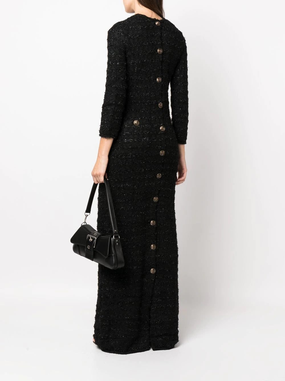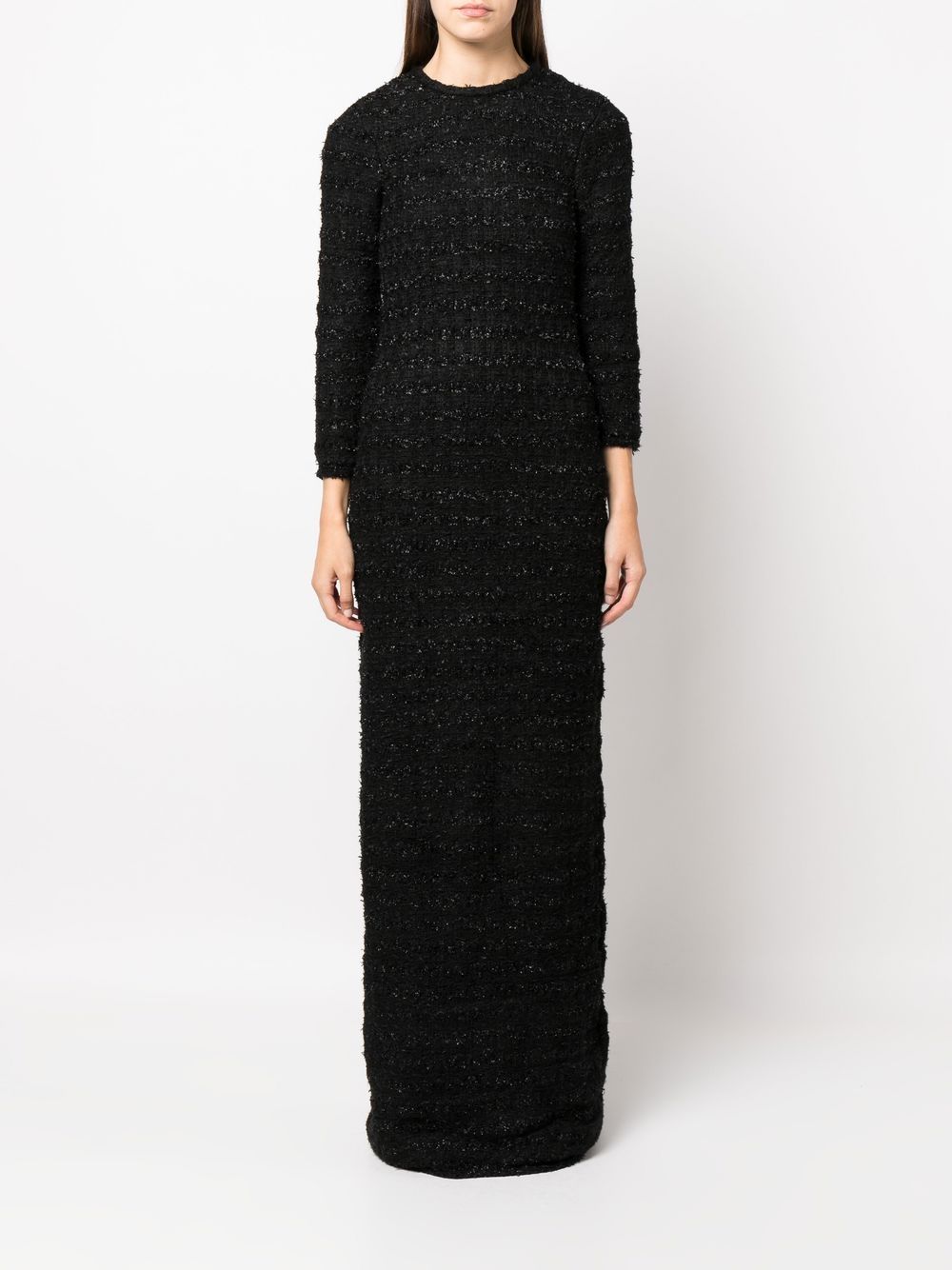 tweed button-back dress from BALENCIAGA featuring core black, tweed, crew neck, rear button fastening, three-quarter length sleeves, two rear patch pockets, floor-length and full lining.