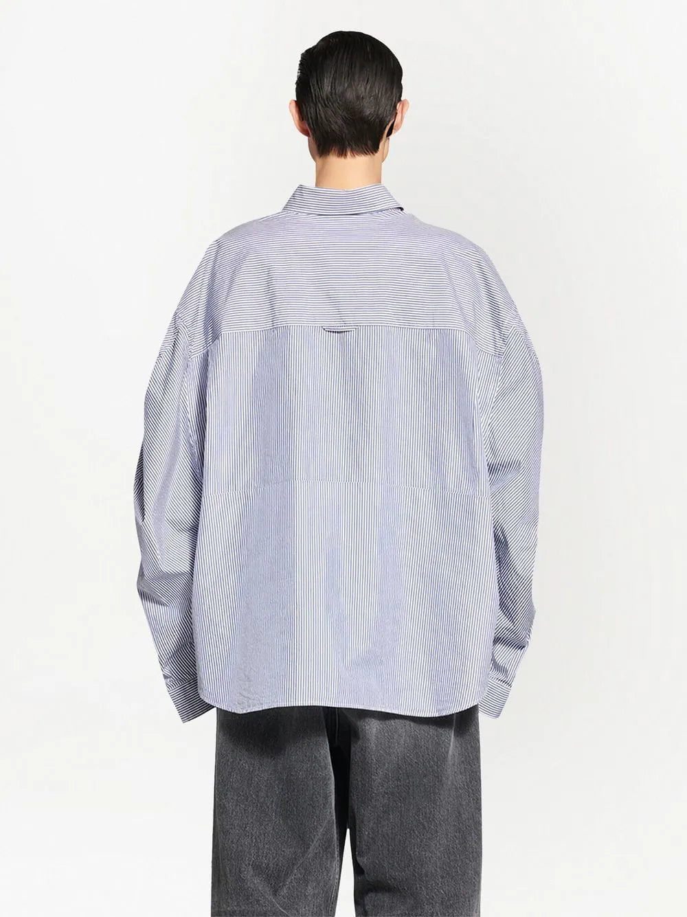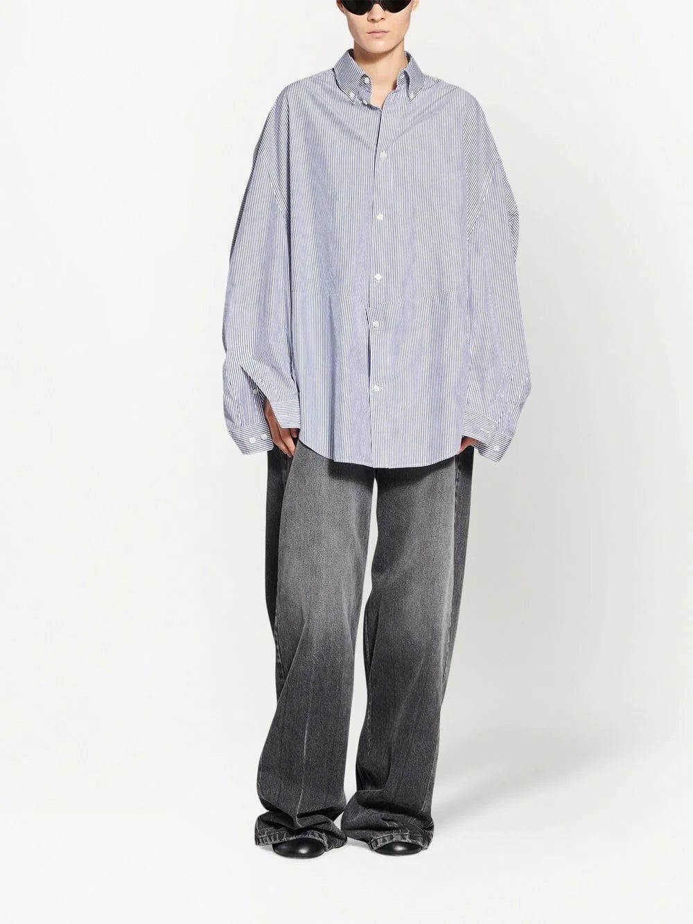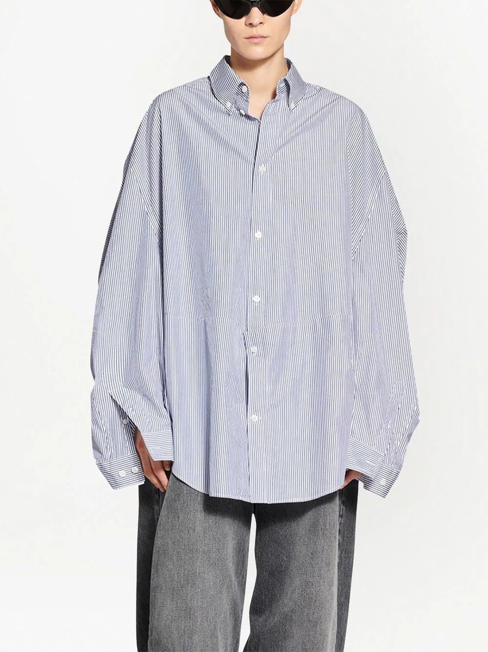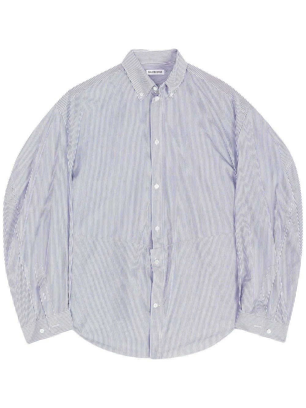 twisted-sleeve oversized shirt from BALENCIAGA featuring blue, white, cotton-silk blend, vertical stripe pattern, button-down collar, front button fastening, long sleeves, curved hem and buttoned cuffs. POSITIVELY CONSCIOUS: We've partnered with Good On You — an ethical agency that rates how sustainably brands perform across various people, planet and animal welfare criteria. This product comes from a Conscious brand that performs well in relation to their impact on the planet, for example ensures the use of materials that limit the amount of chemicals, water and wastewater involved in production processes..