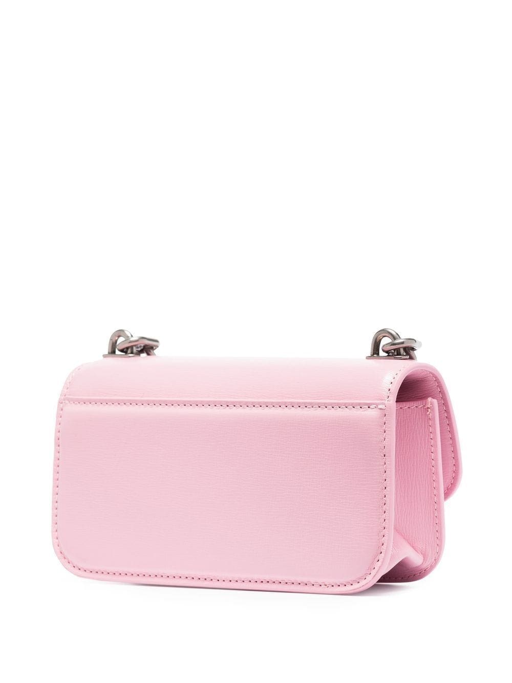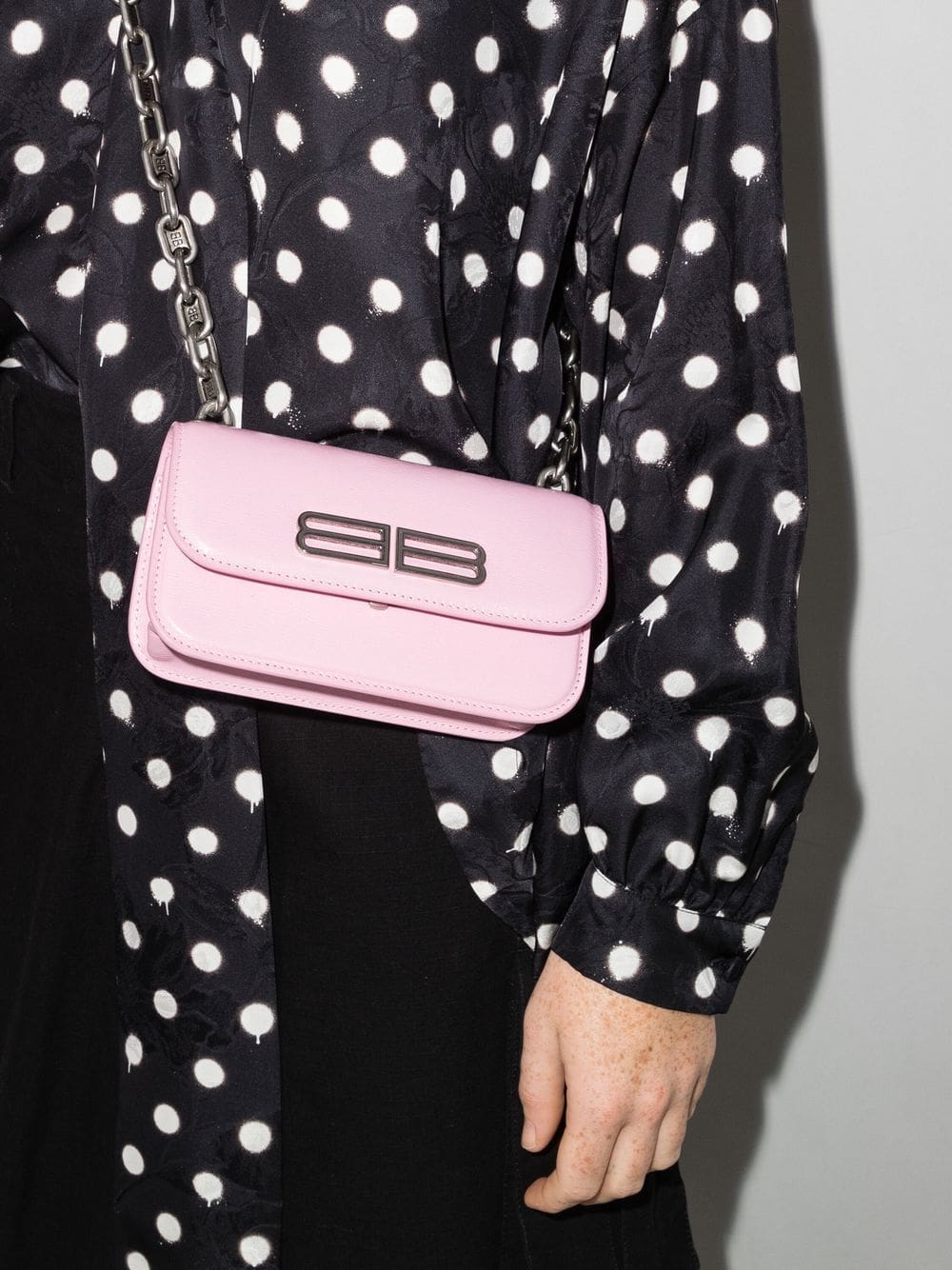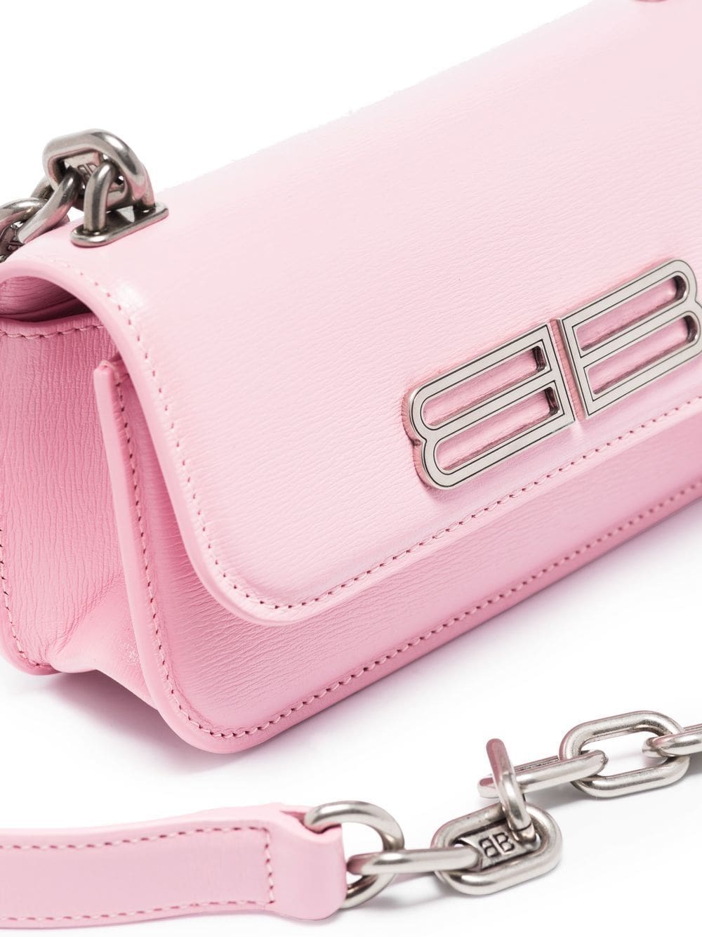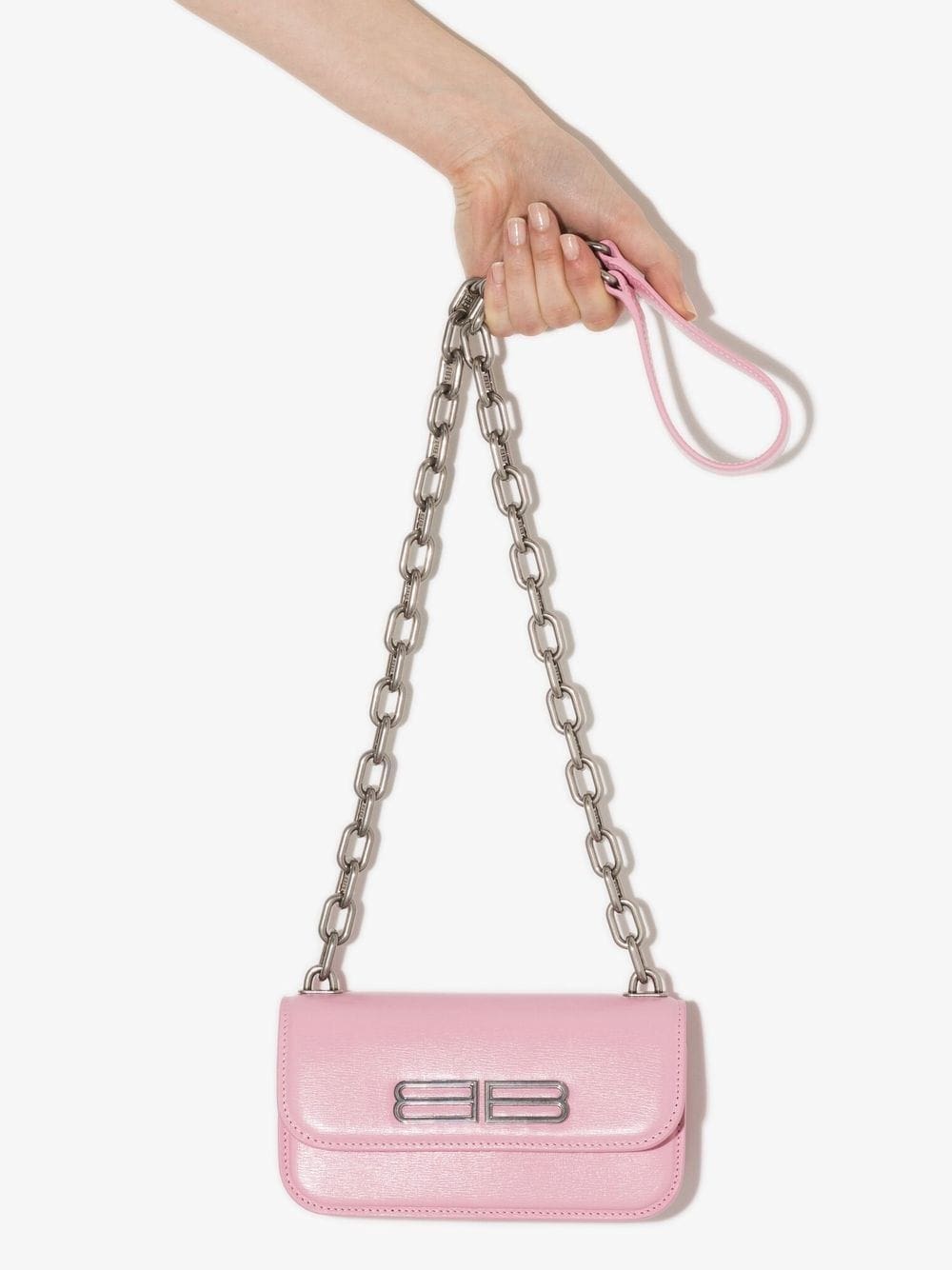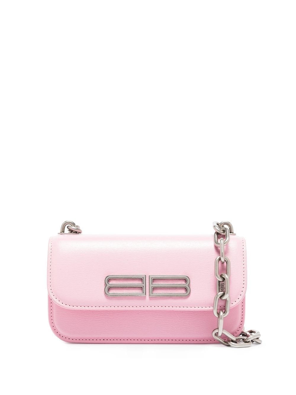 Balenciaga's XS Gossip wallet crossbody bag is crafted from candy-pink calf leather and adorned with a futuristic iteration of the BB logo plaque in silver-tone hardware. The compact accessory features a logo-detailed chain-link shoulder strap for an added signature touch.