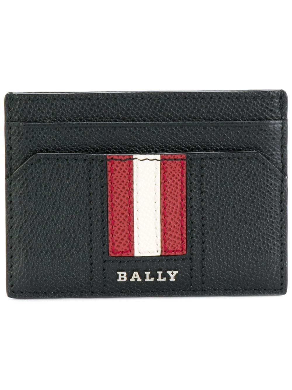 Black calf leather signature stripe cardholder from BALLY featuring a front logo plaque, a textured style and multiple card slots.