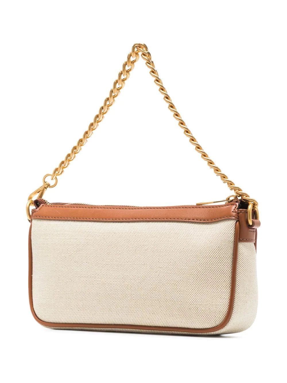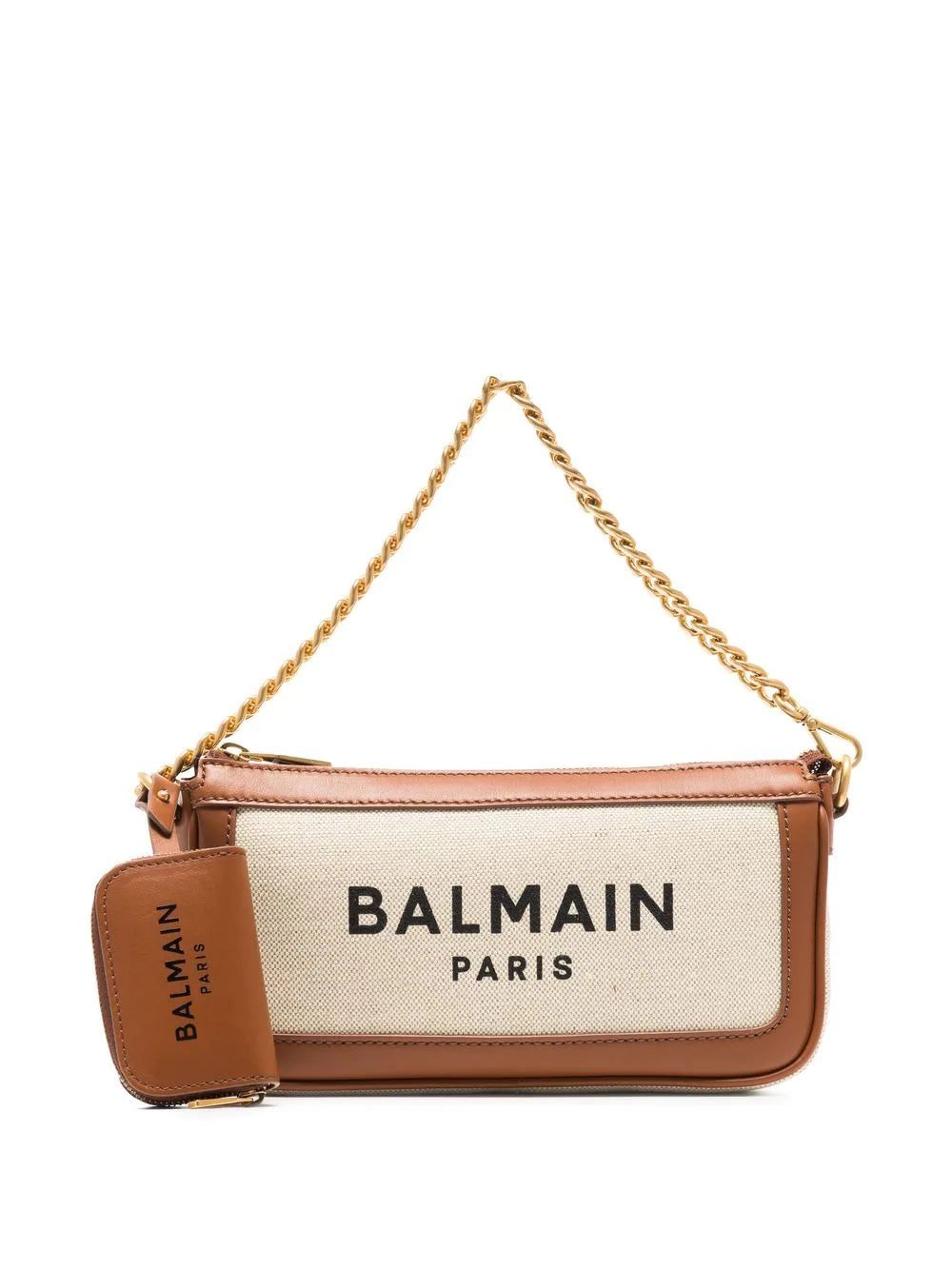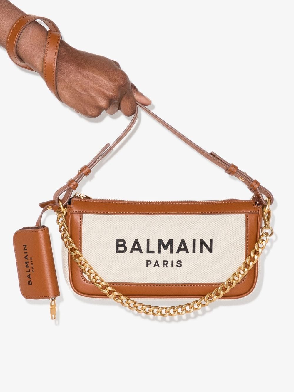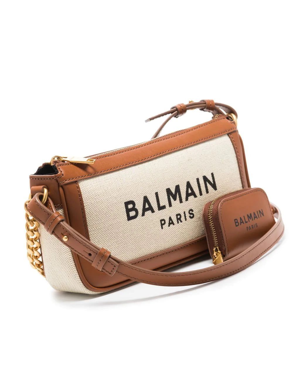 Balmain's B-Army shoulder bag is defined by its rectangle shape-silhouette and tan-brown leather trim. A recognisable design, it is printed with a black logo on beige canvas to the front.