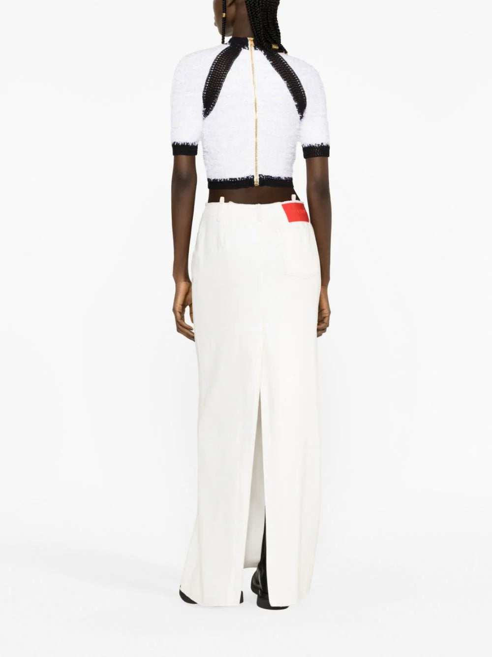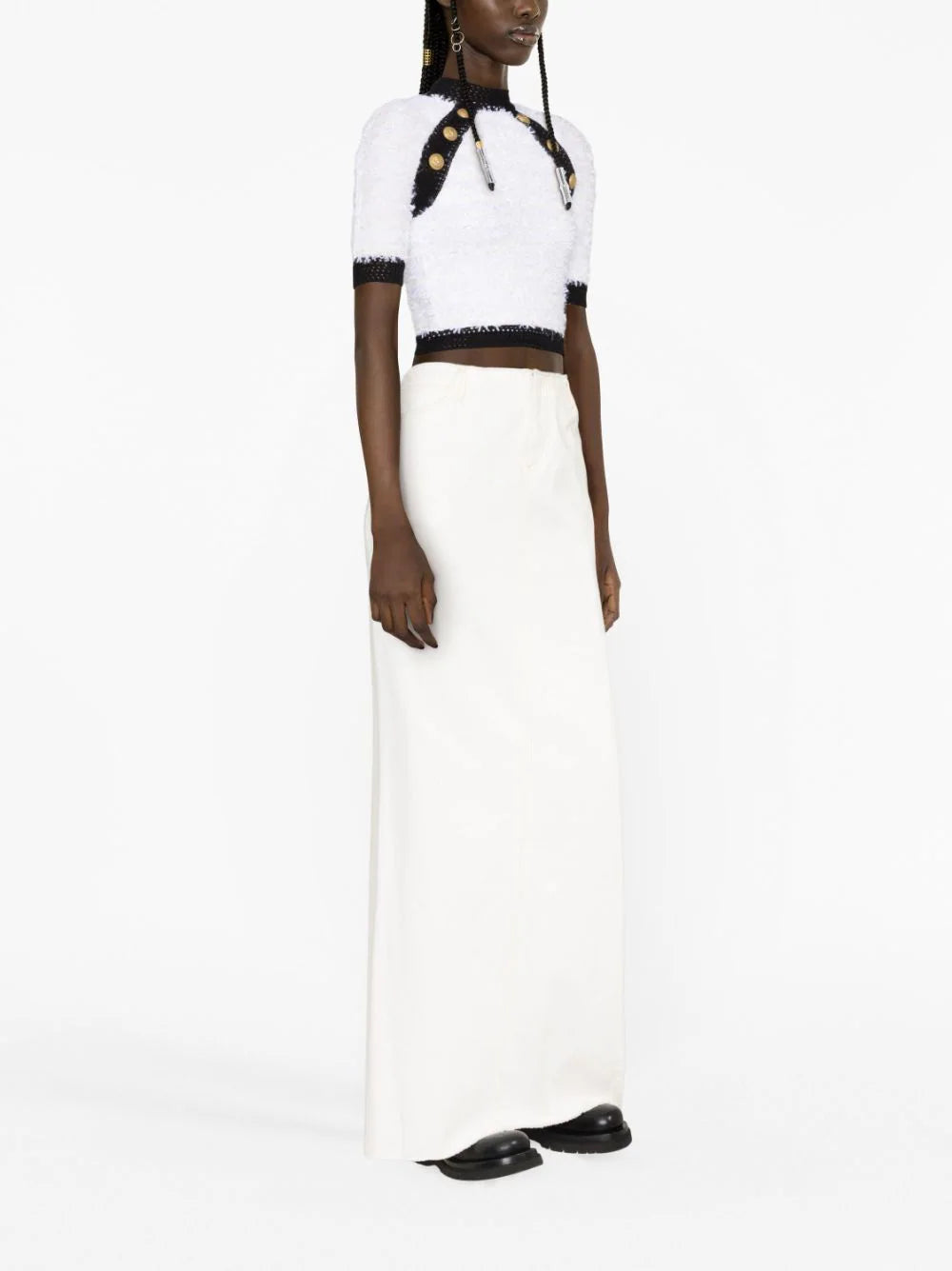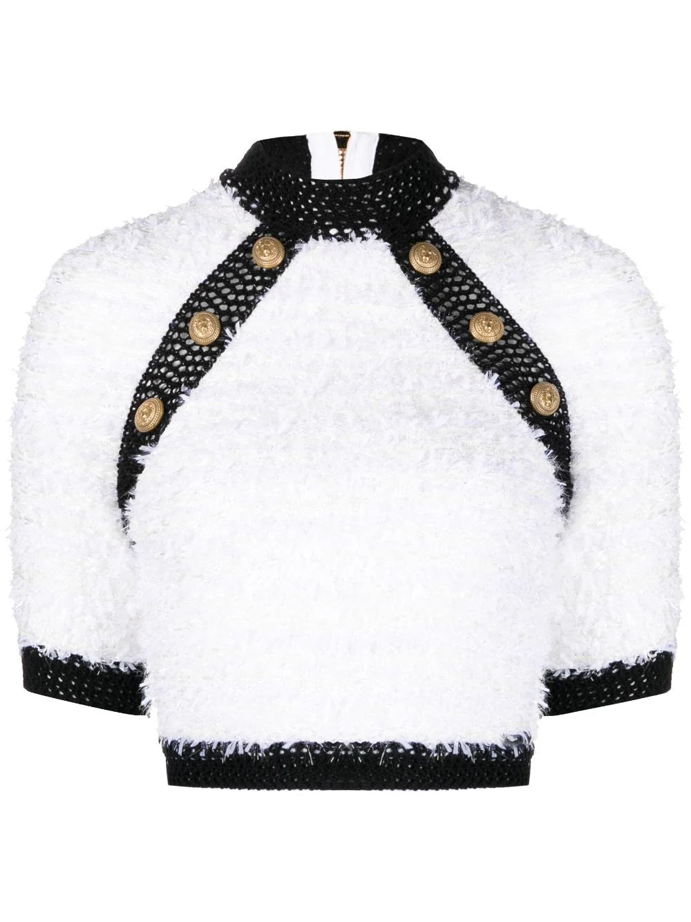 Balmain juxtaposes its French heritage with a modern sensibility. A case in point, this crop top is crafted from fuzzy tweed and framed with open-knit black trims. Signature embossed gold-tone buttons at the shoulders make for a recognisable finishing touch.