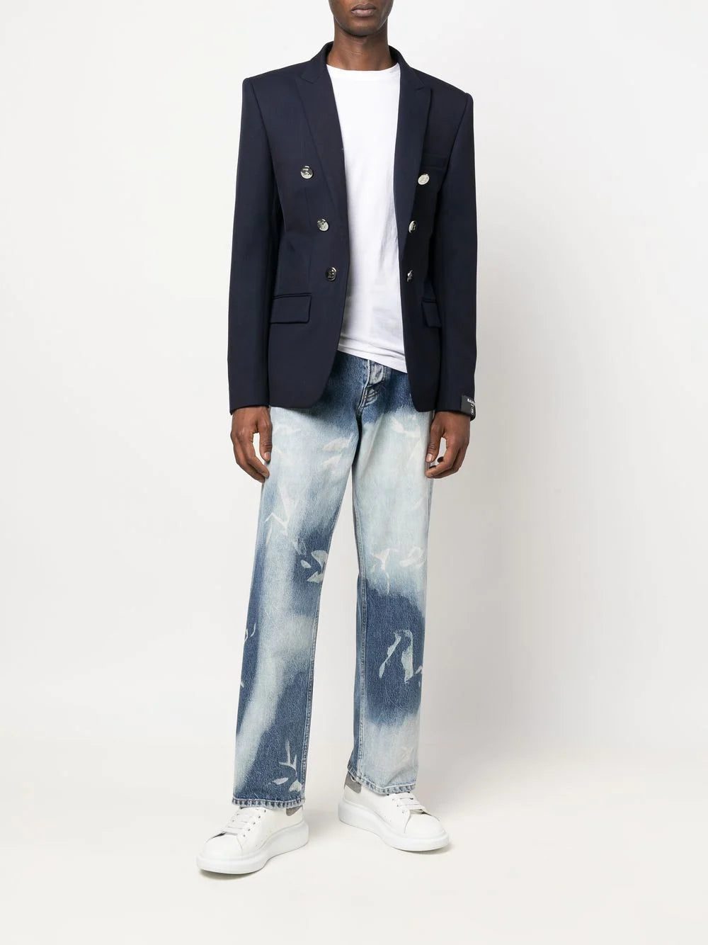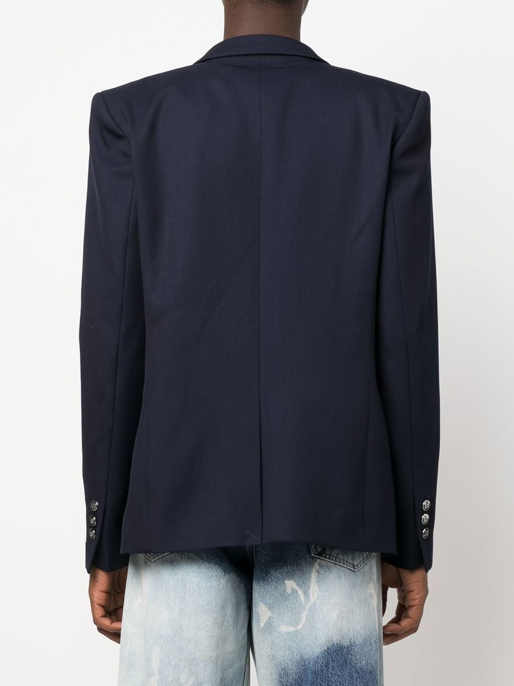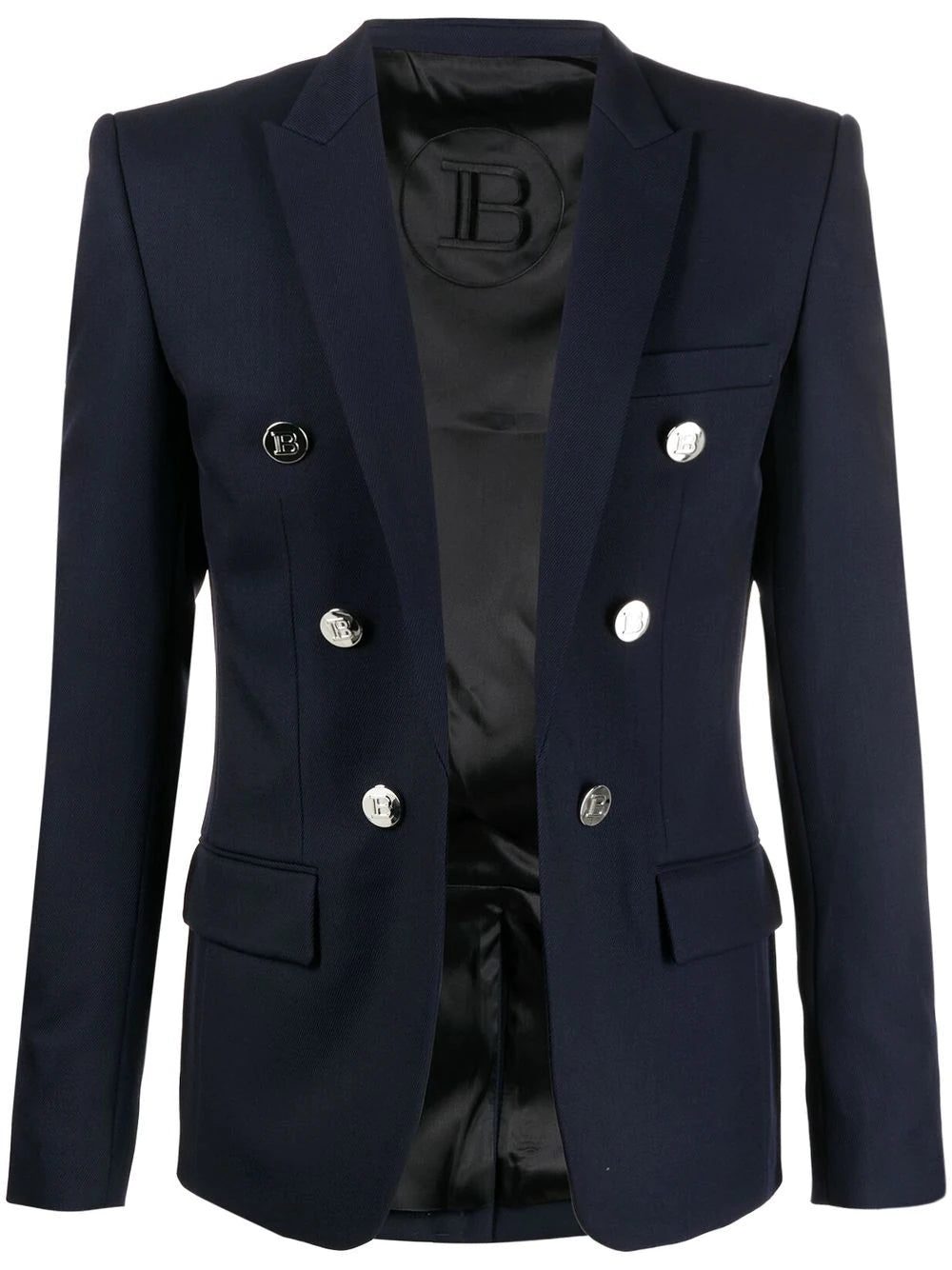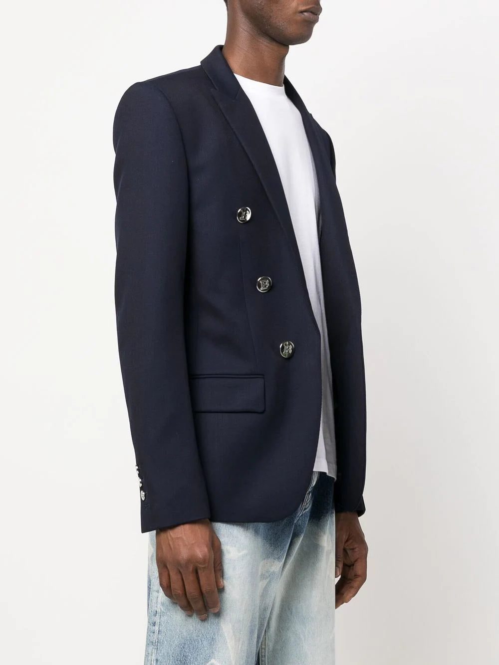 double-breasted tailored blazer from Balmain featuring blue, wool, silver-tone hardware, logo-embossed buttons, logo patch at the sleeve, shoulder pads, peak lapels, long sleeves, central rear vent, chest welt pocket and two front flap pockets.