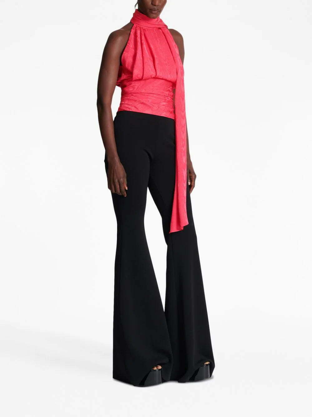 Balmain plays with texture and depth in this fuchsia pink sleeveless blouse. With exaggerated draped detailing at the neckline, the all-over moiré effect adds to the tonality of the piece.