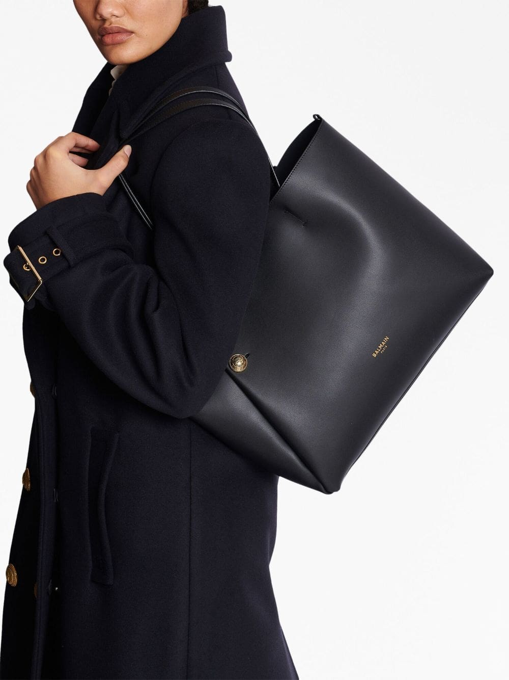 Eye-catching embossed buttons are a mainstay at Balmain, speaking to the house's opulent aesthetic. Contrasting against the sleek black hue of the calf leather construction, they appear in a gold-tone finish on the Emblème bag for an elevated flourish.