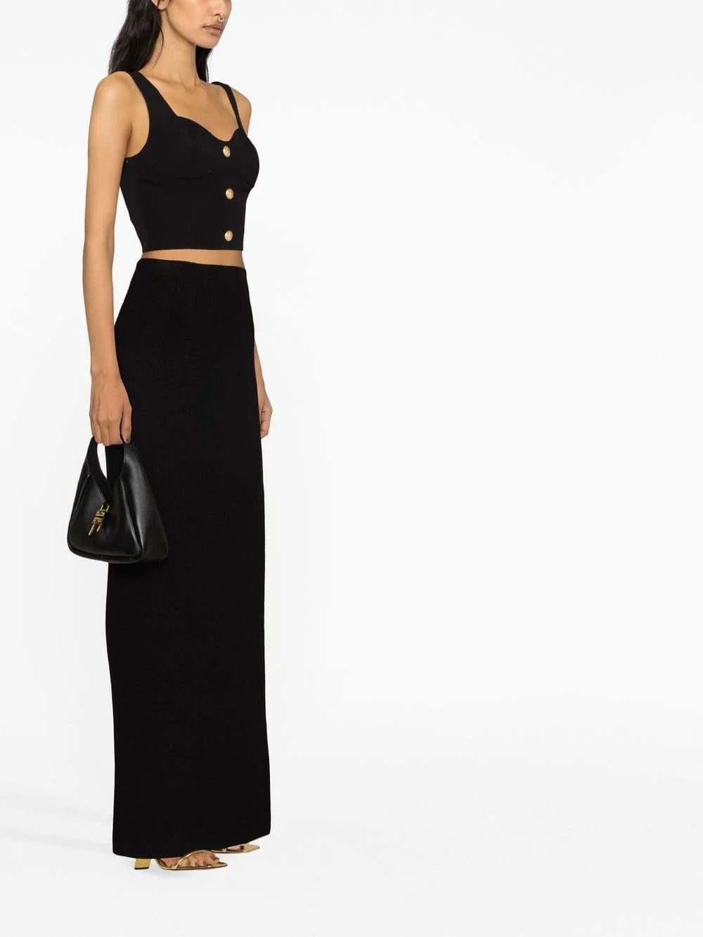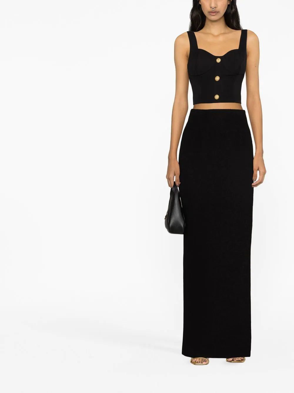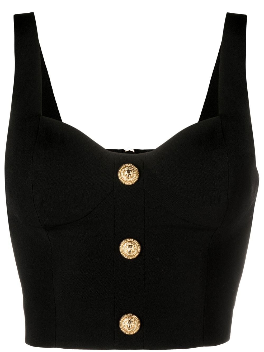 Eye-catching embossed buttons are a mainstay at Balmain, speaking to the house's opulent aesthetic. They appear in a gold-tone finish here, contrasting with the top’s sleek black hue for an elevated casual look.