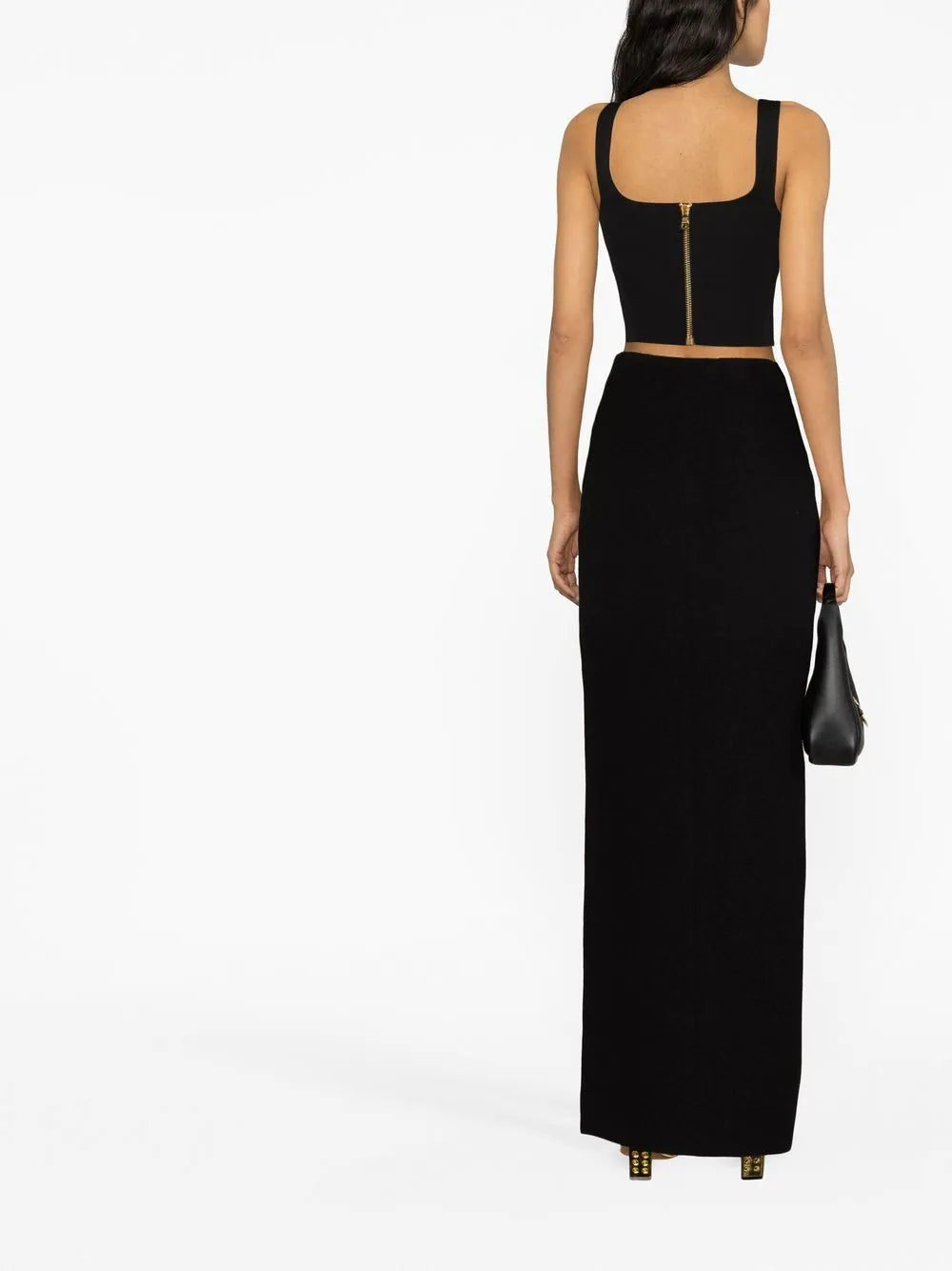 Eye-catching embossed buttons are a mainstay at Balmain, speaking to the house's opulent aesthetic. They appear in a gold-tone finish here, contrasting with the top’s sleek black hue for an elevated casual look.