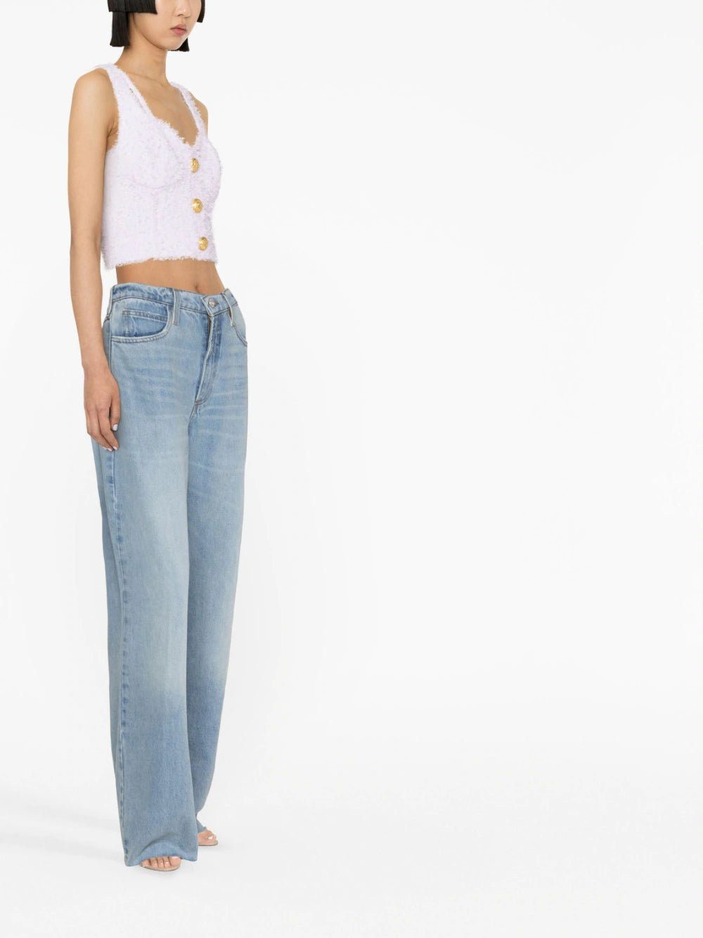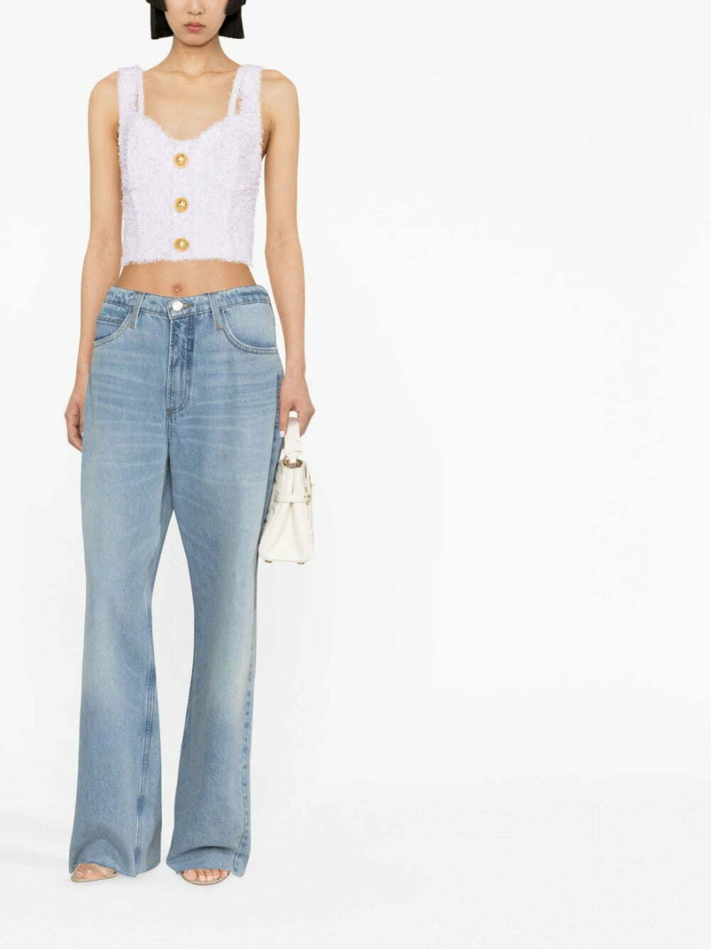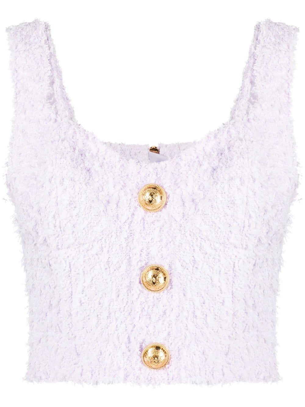 Timeless yet innovative, this crop top from Balmain brings back the quintessential tweed fabric. The garment features a rear zip fastening, cropped hem and embossed gold-tone buttons at the front which complement the sweetheart neckline.