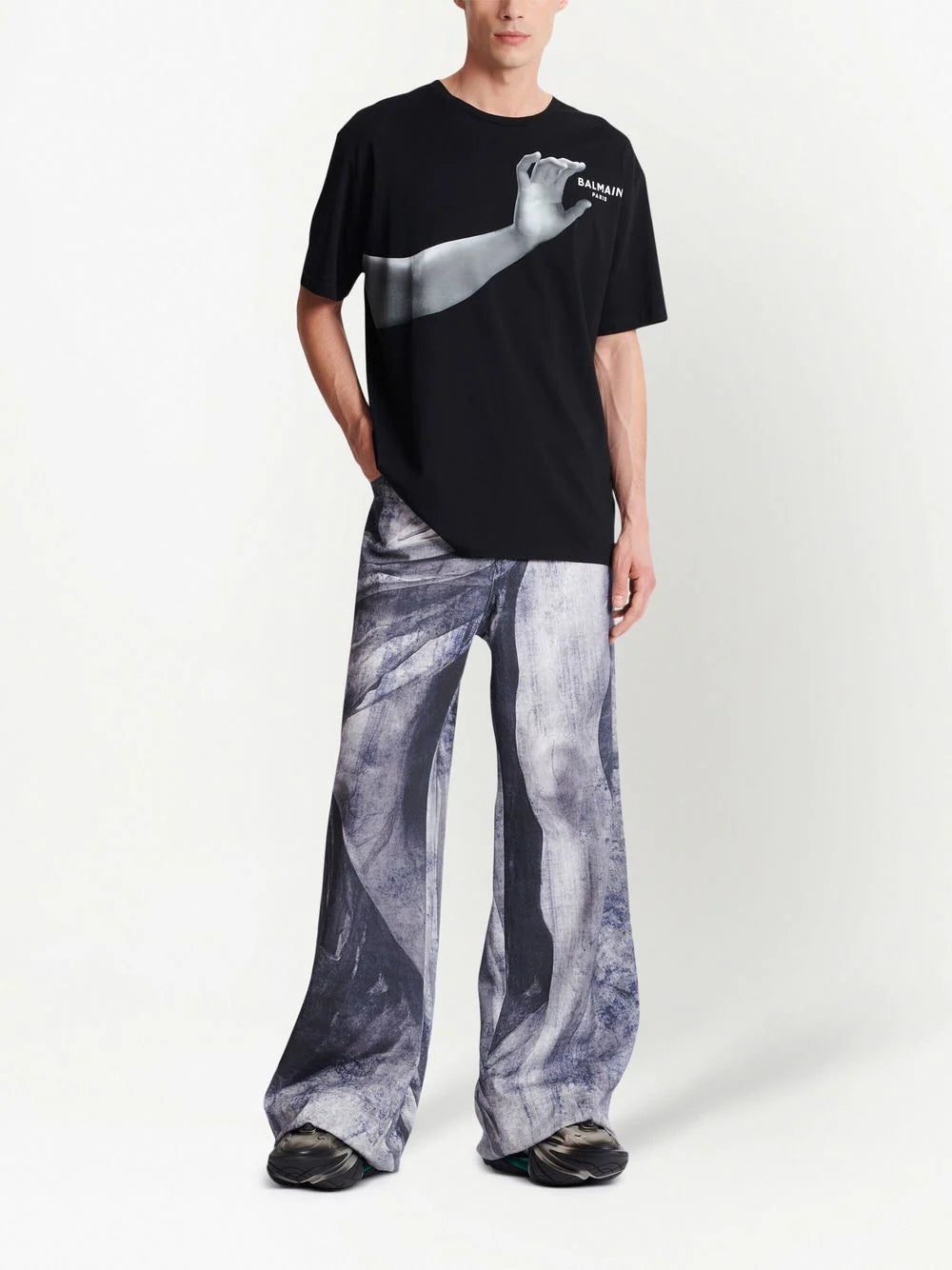 Combining references from past and present, Balmain lends this casual crew-neck T-shirt a renaissance touch through an outstretched arm across the front. The photo-realistic graphic - reminiscent of Michelangelo's Creazione di Adamo - appears to be reaching for the maison's sans serif logo.