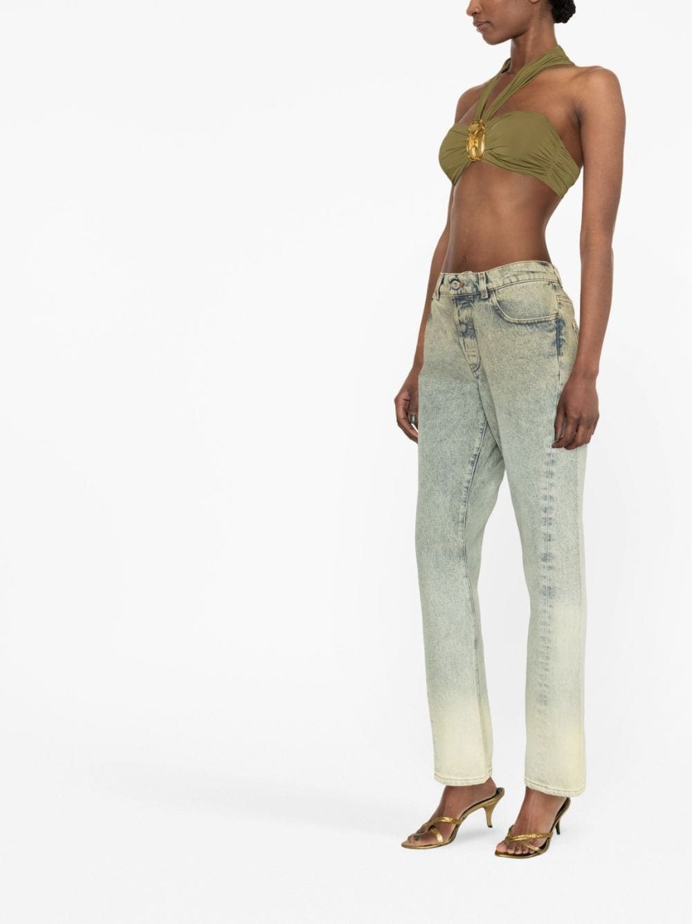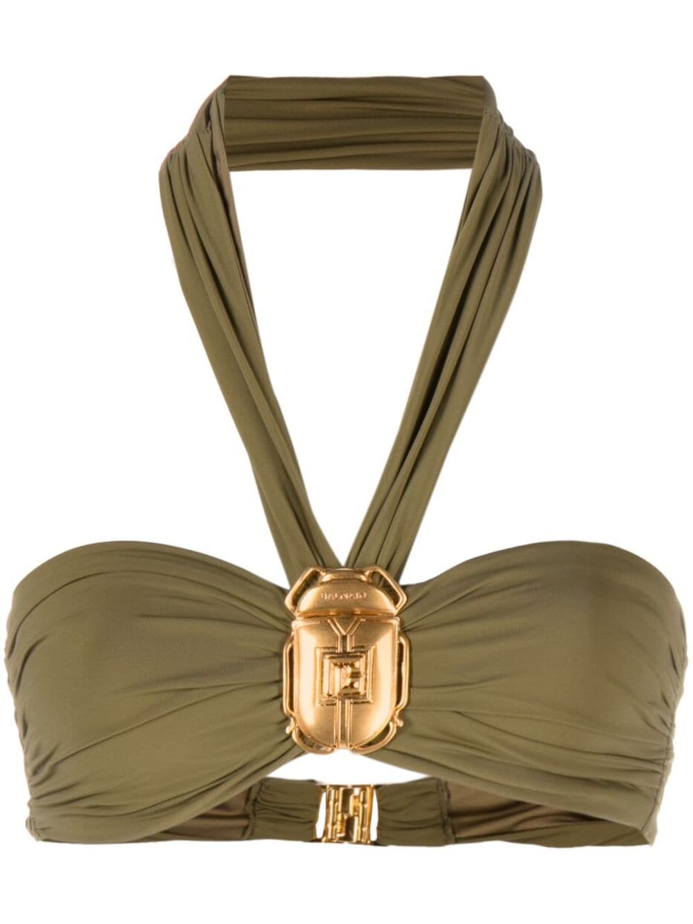 asparagus green stretch-design bustier-style neckline halterneck sleeveless rear buckle fastening