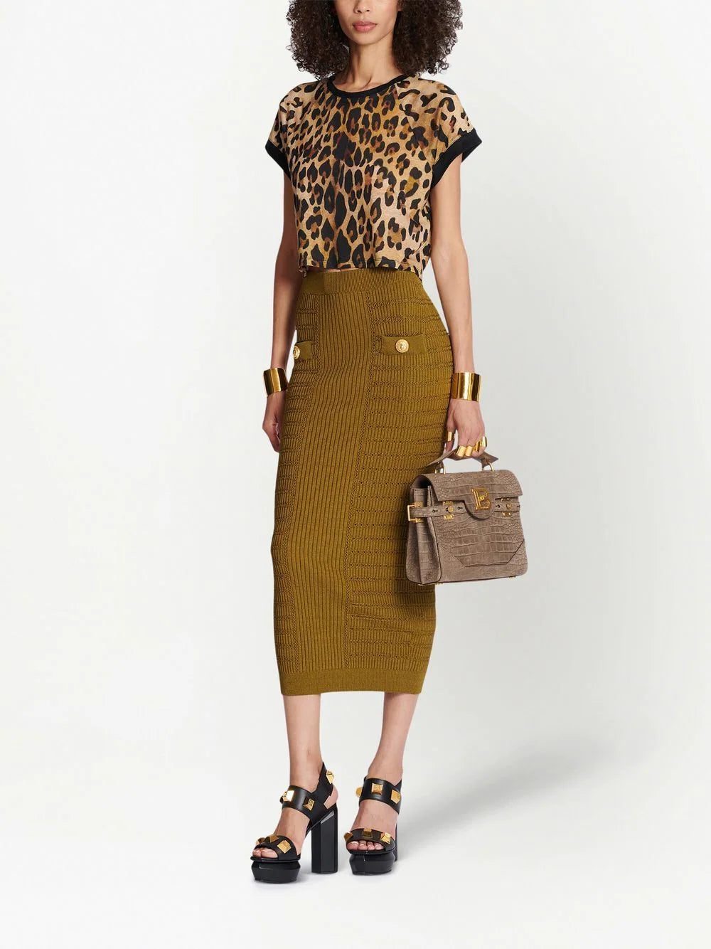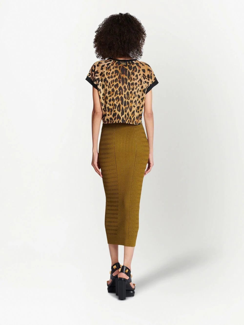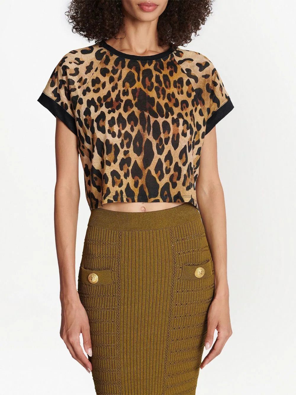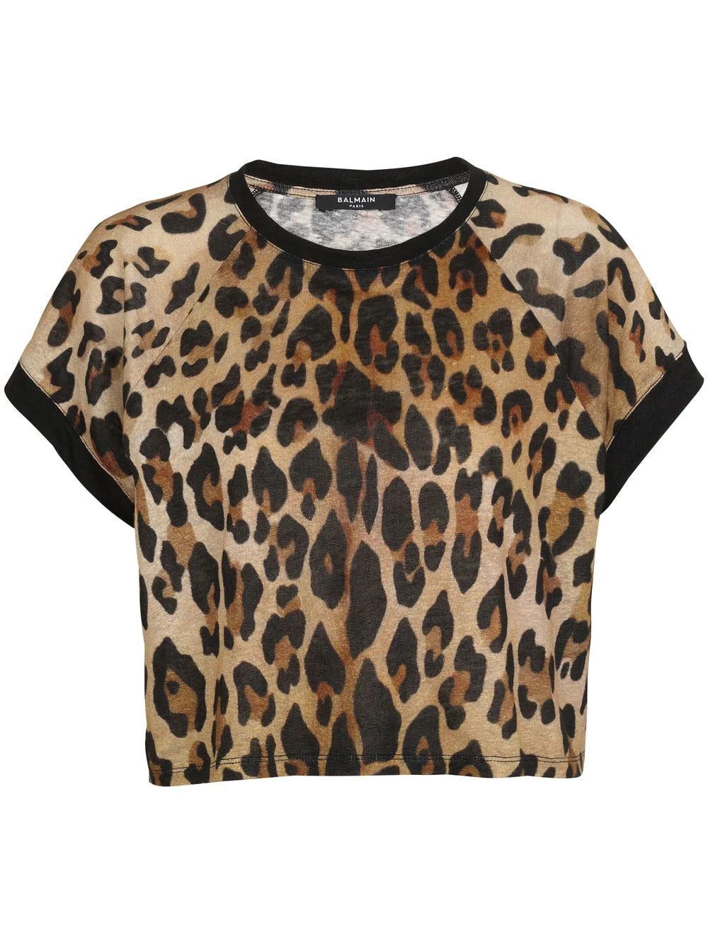 leopard-print cropped T-shirt from Balmain featuring coffee brown, beige, linen/flax, all-over leopard print, crew neck, short sleeves and cropped.