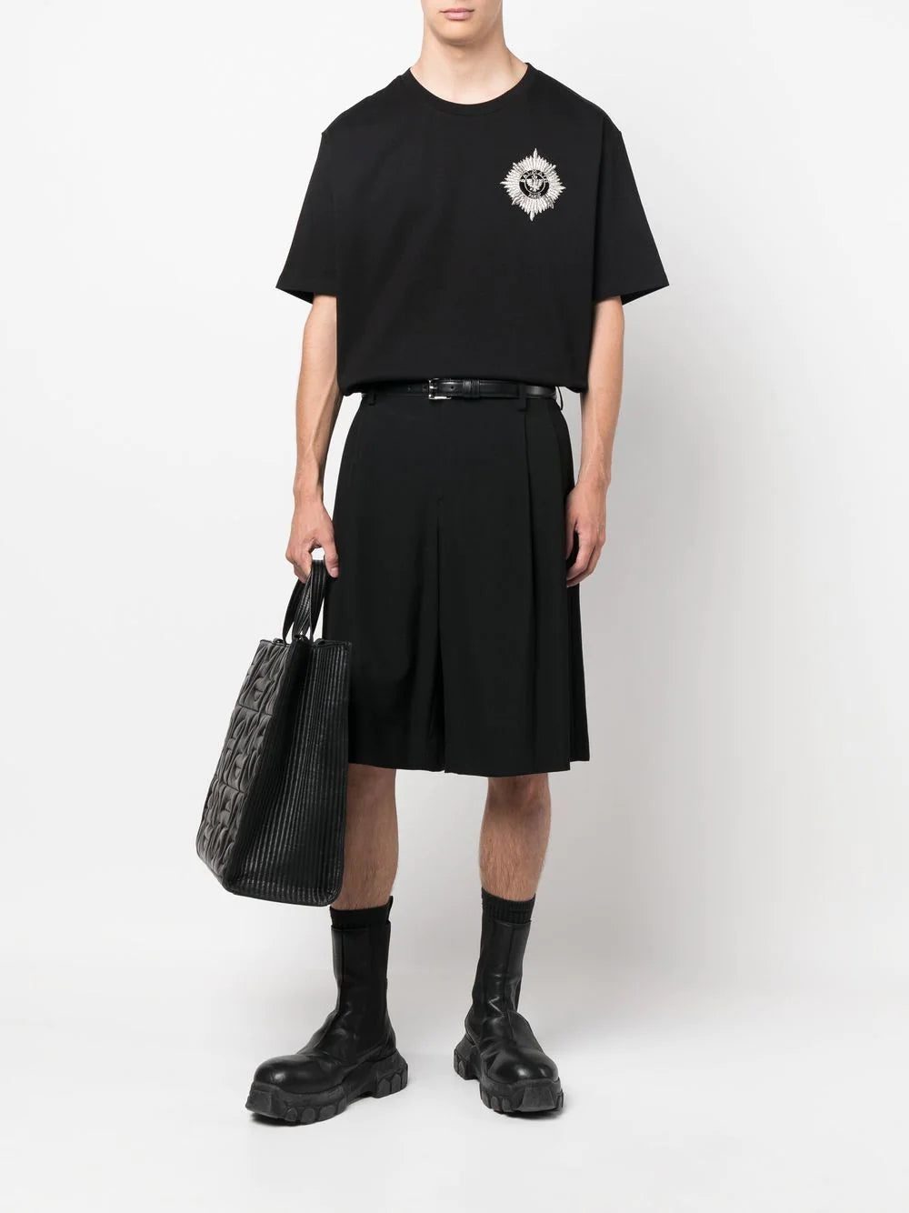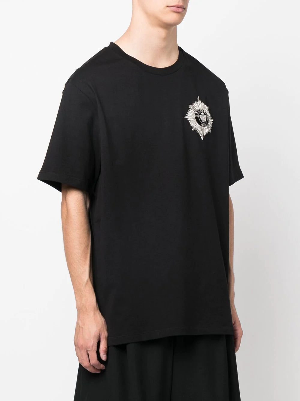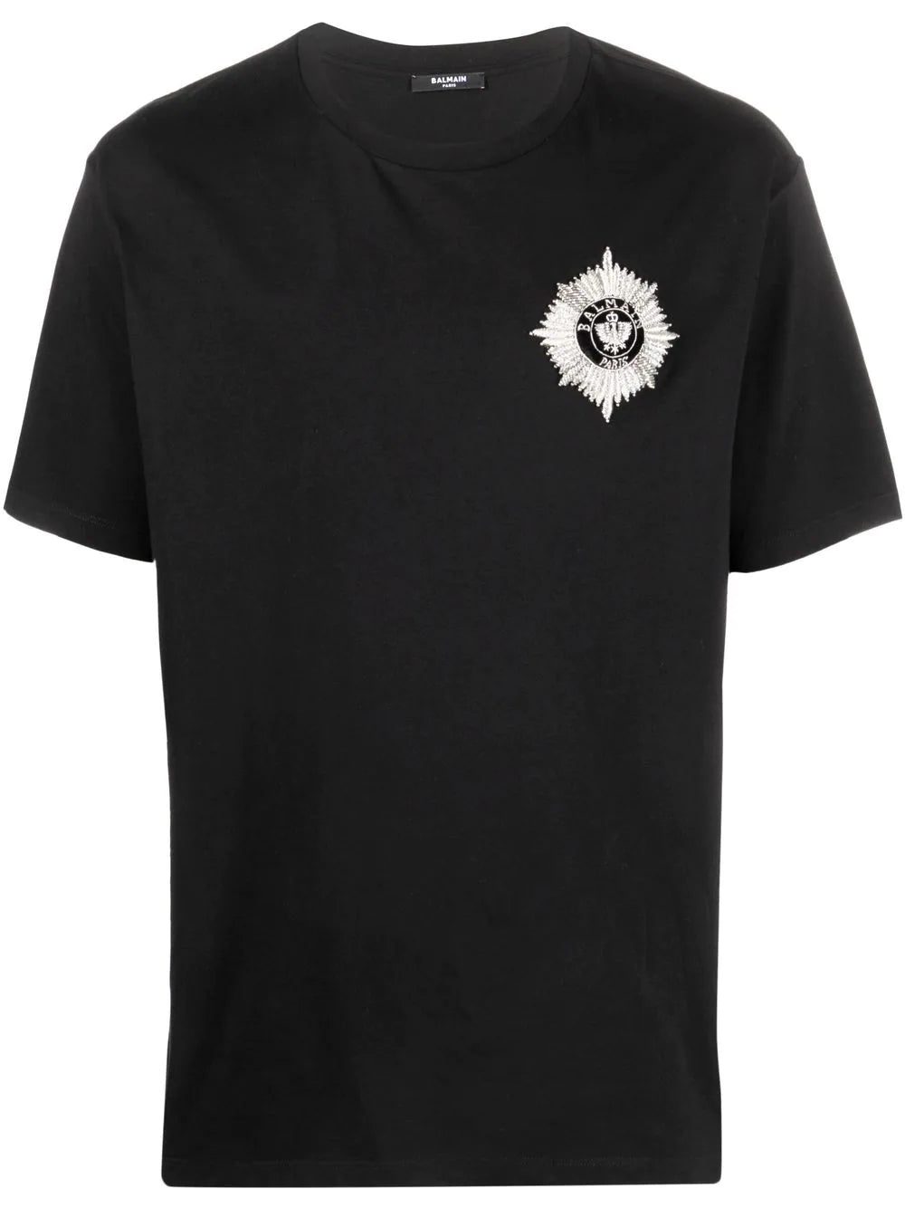 A shimmering logo appliqué adorns this basic black T-shirt, lending the casual top a hint of the glamorous aesthetic that defines the French house.