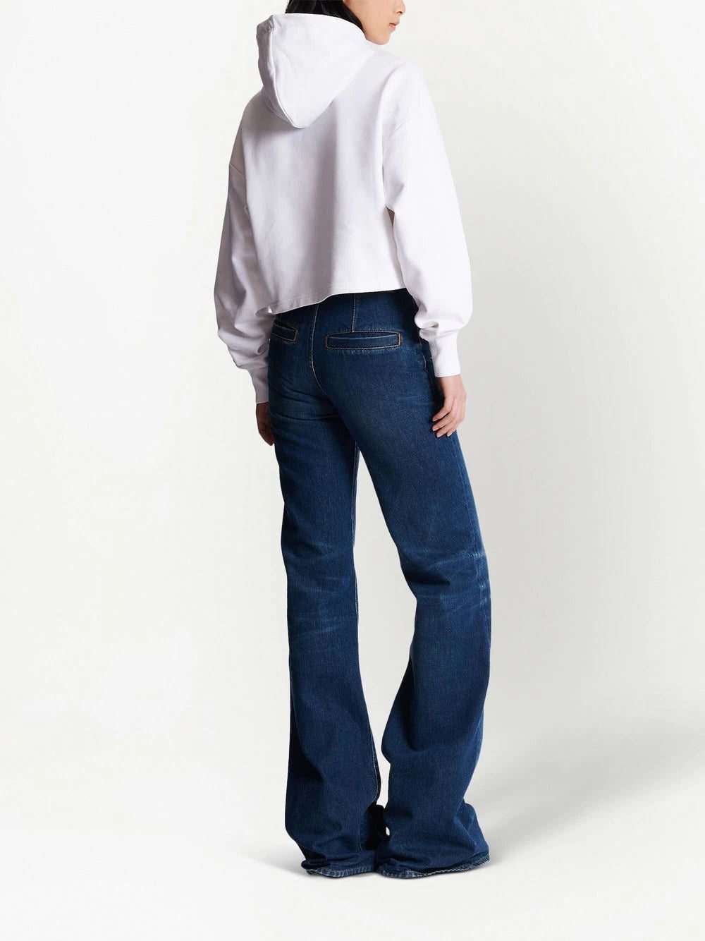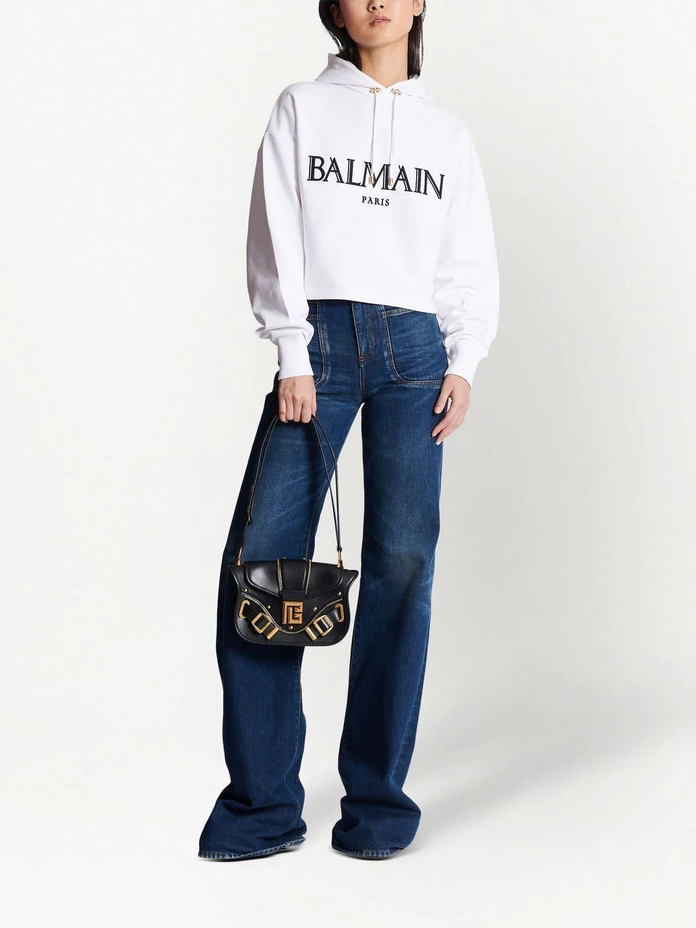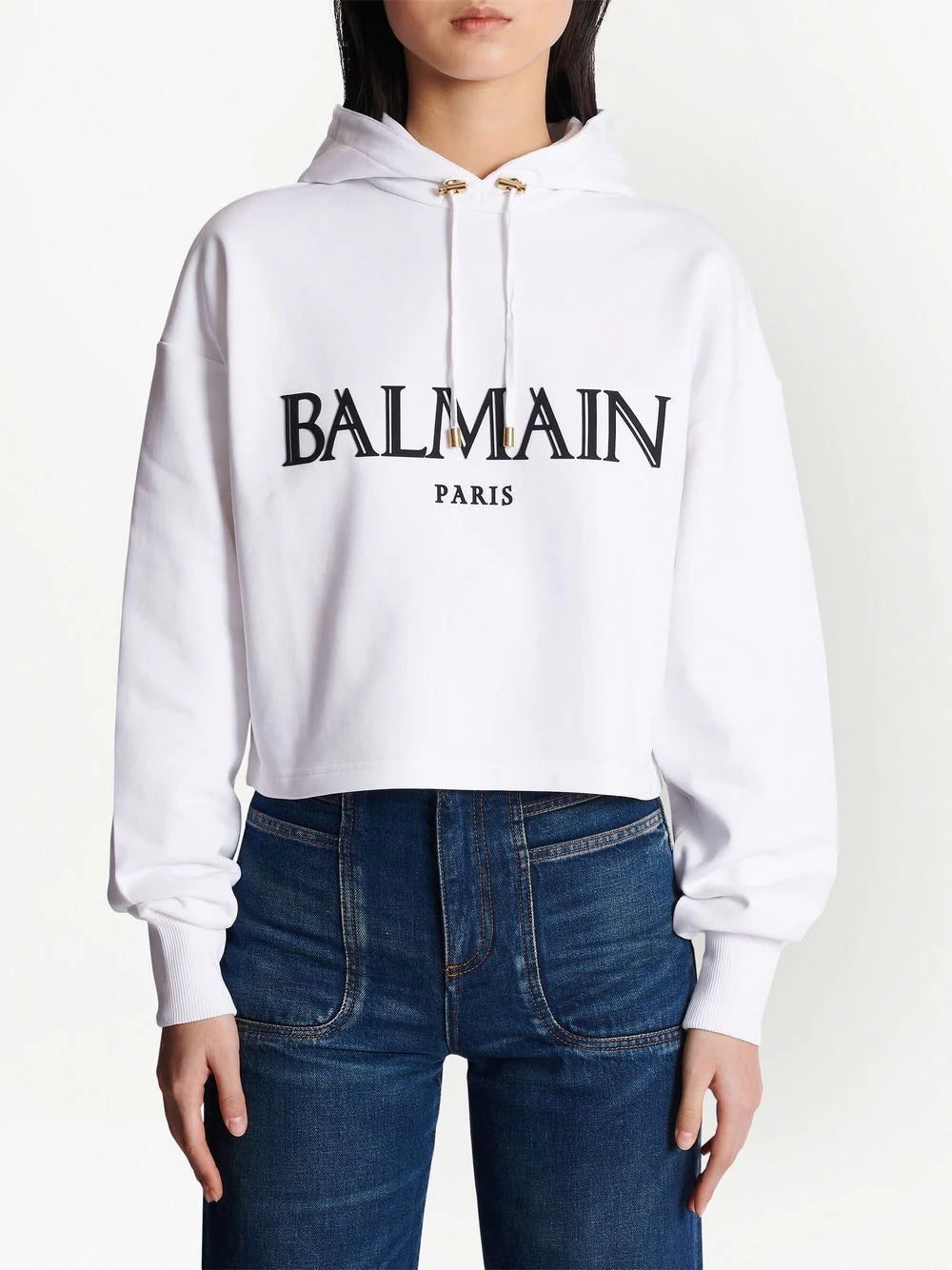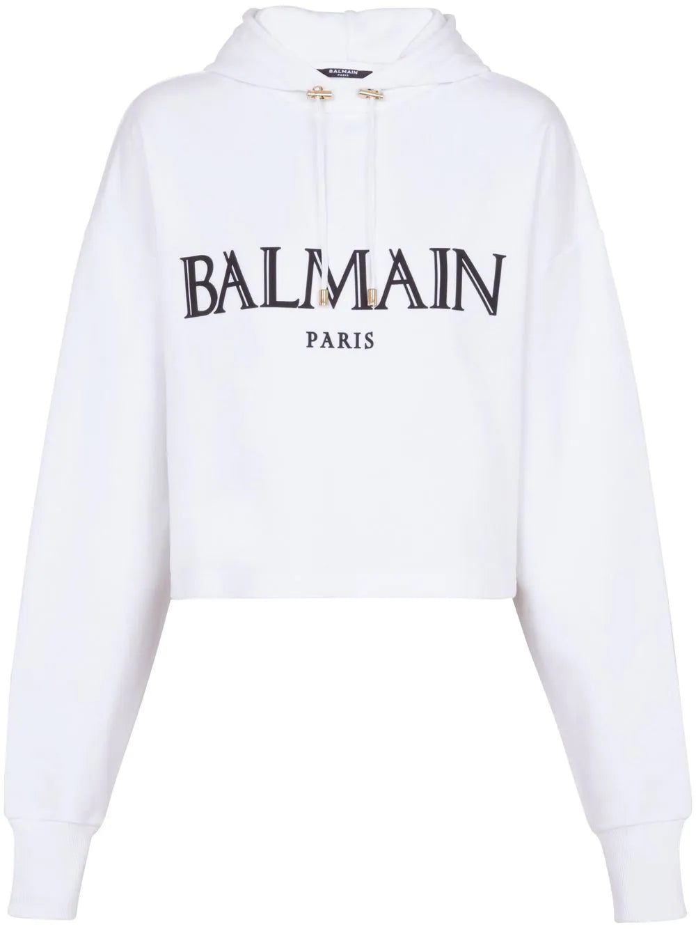 logo-appliqué cropped hoodie from Balmain featuring appliqué logo, drawstring hood, long sleeves, cropped, straight hem, white/black and cotton.