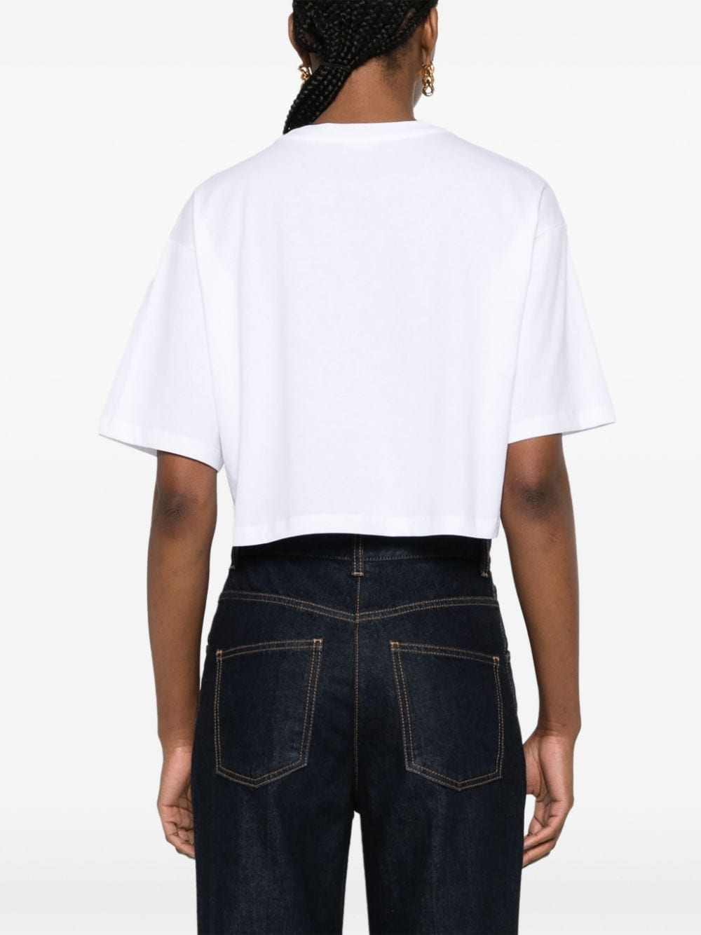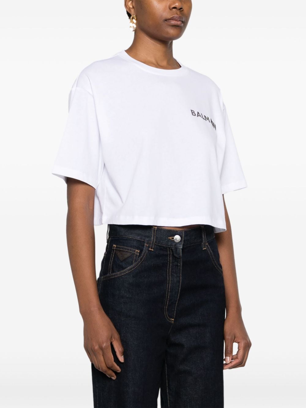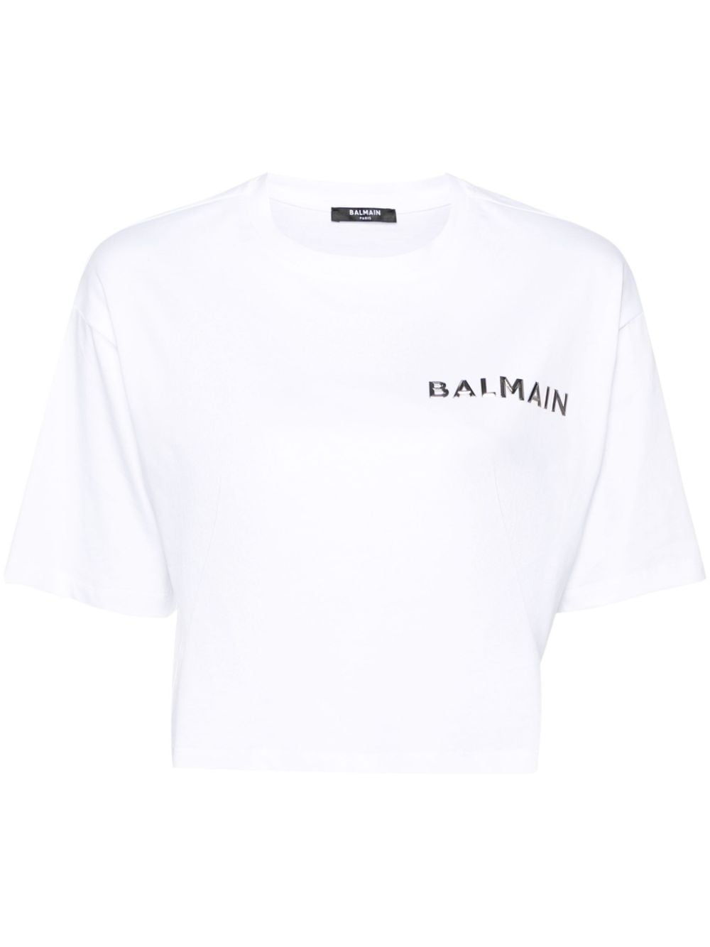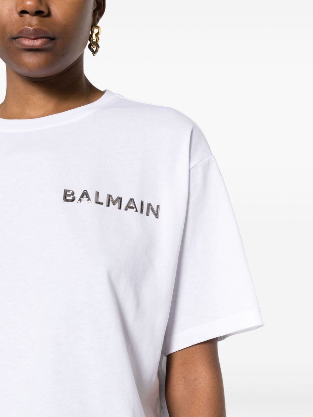 This white Balmain T-shirt is cut from soft cotton jersey to a loose silhouette that balances the cropped hem. Dimensional silver-tone logo lettering is appliquéd at the chest for a branded look.