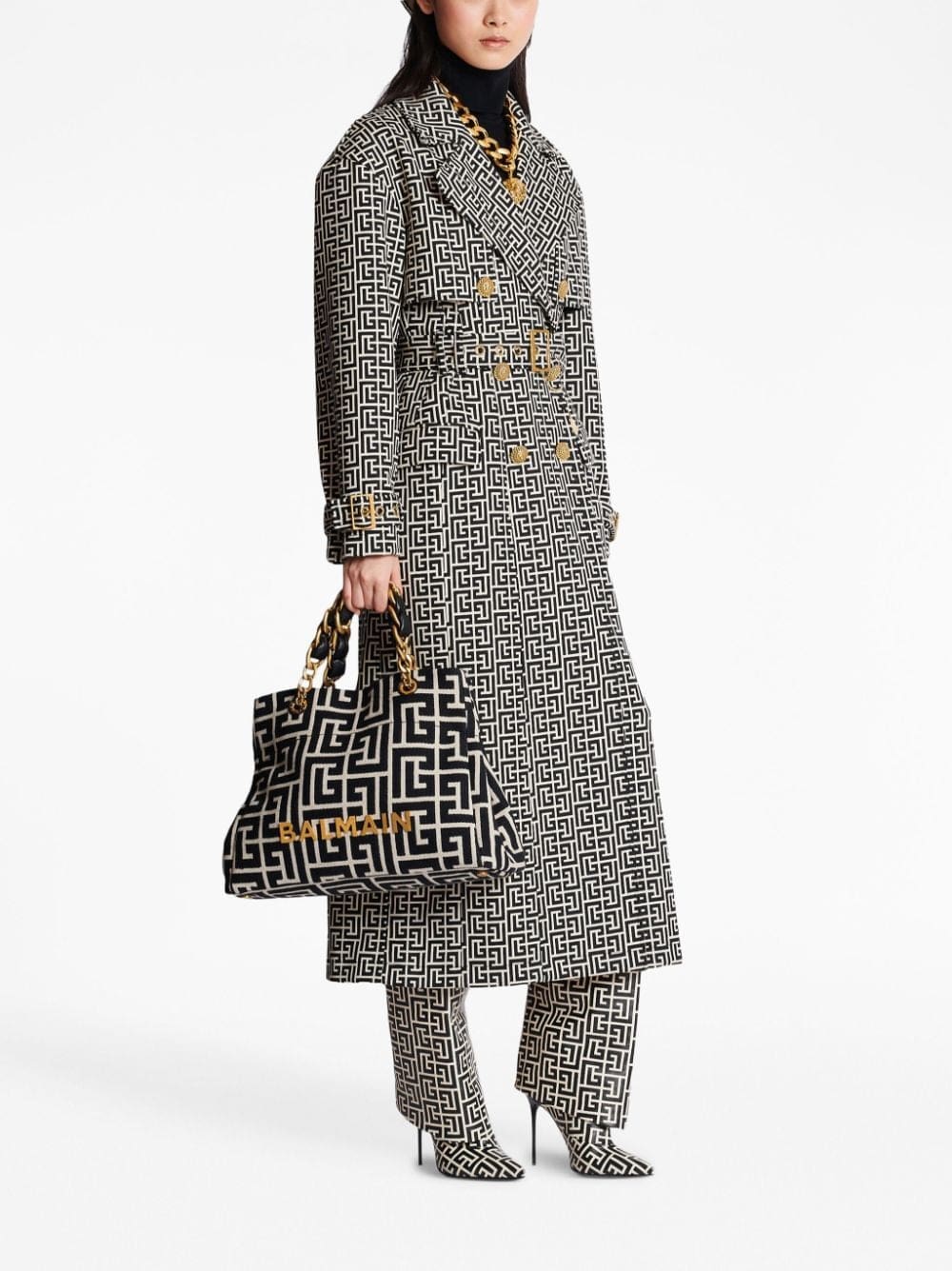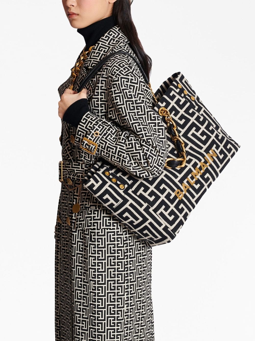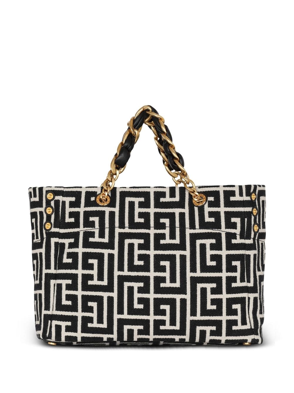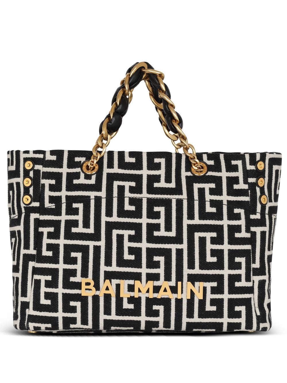 Taking its name from Balmain’s inaugural year, this black 1945 Soft tote bag is crafted from fabric with expandable sides and a plethora of gold-tone hardware – from the chain-link straps and logo lettering to the metal feet.