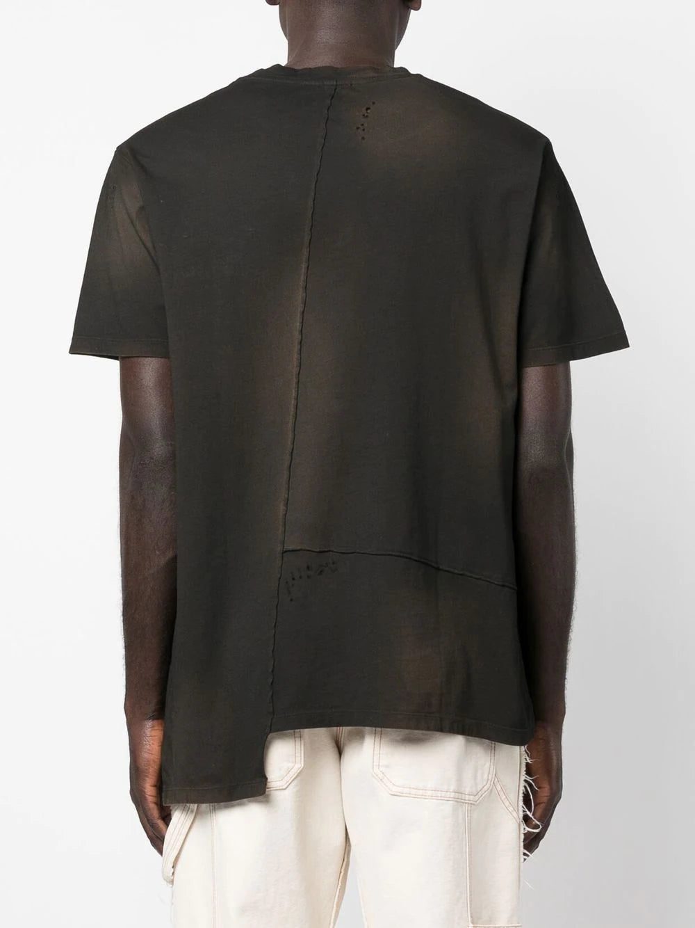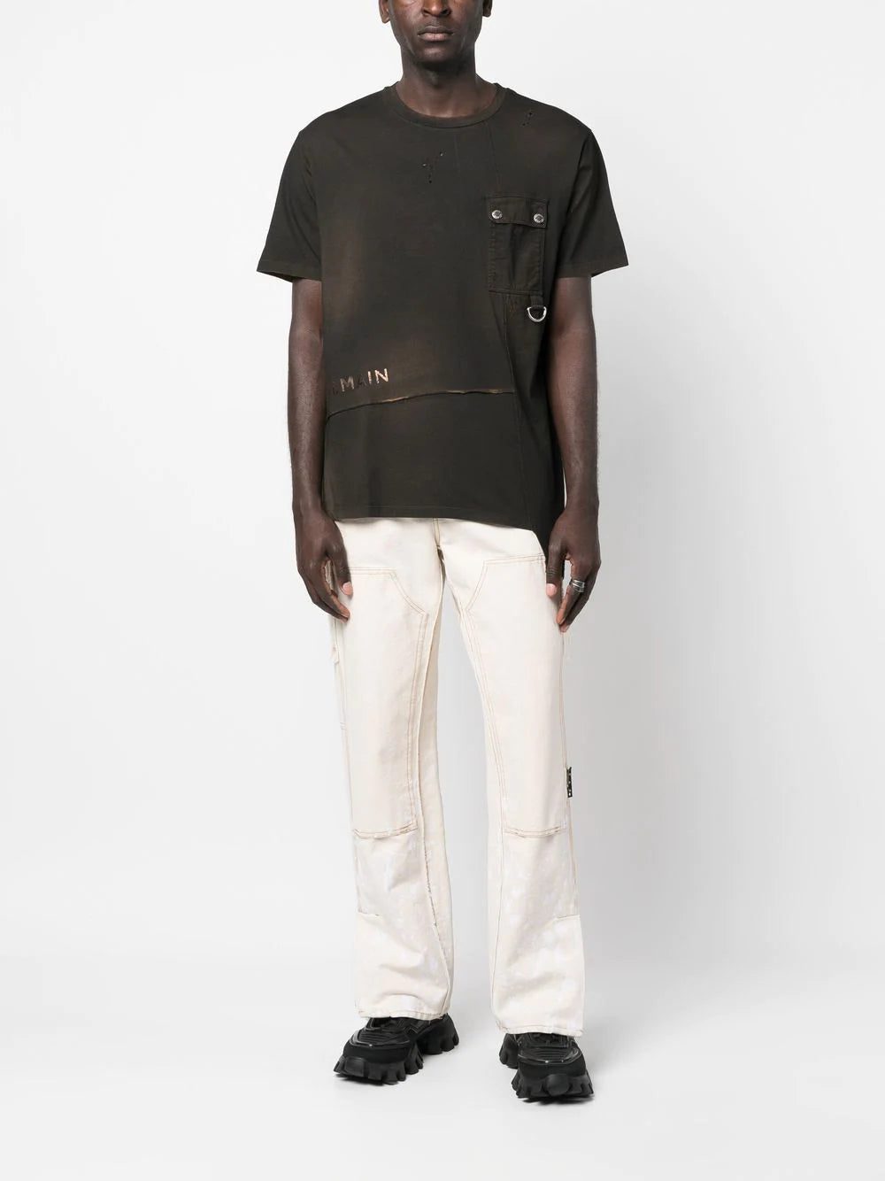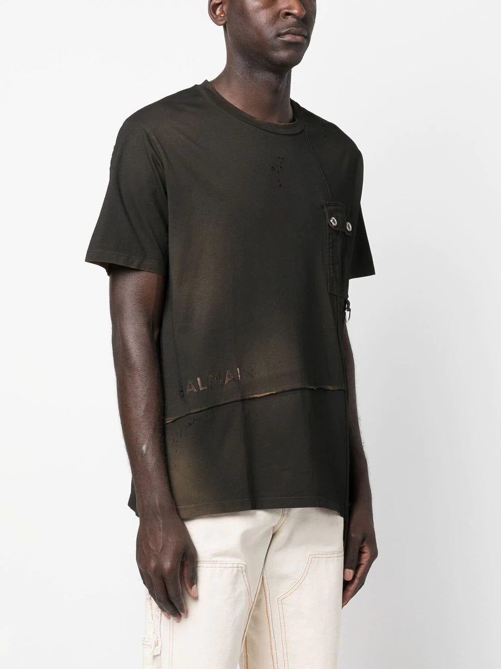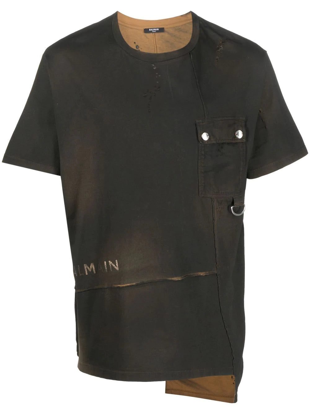 logo-print asymmetric T-shirt from Balmain featuring coffee brown, cotton, distressed effect, logo print to the side, round neck, short sleeves, silver-tone hardware, D-ring findings, asymmetric hem and button-fastening chest pocket.