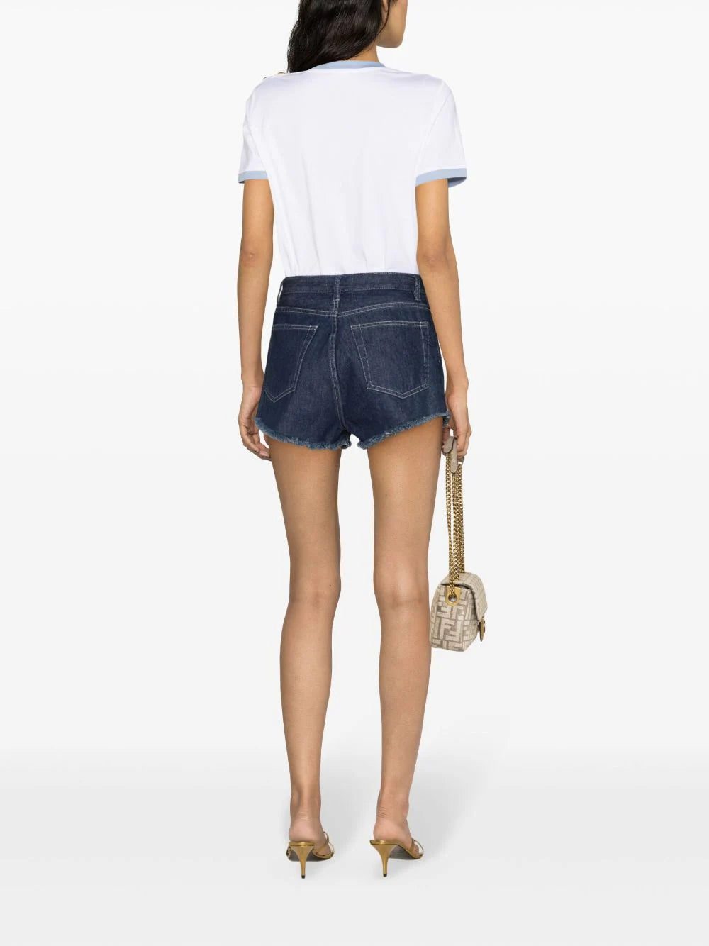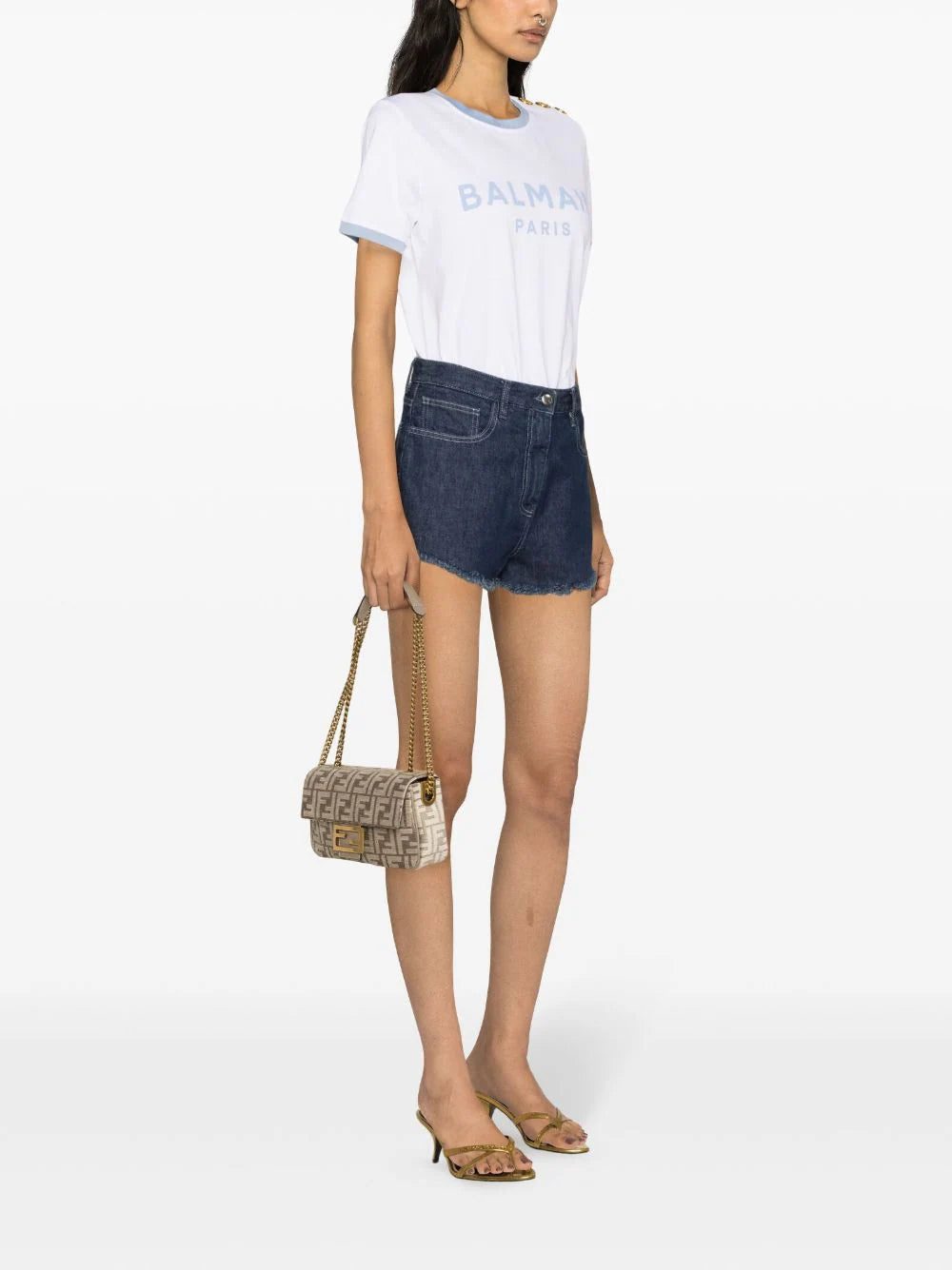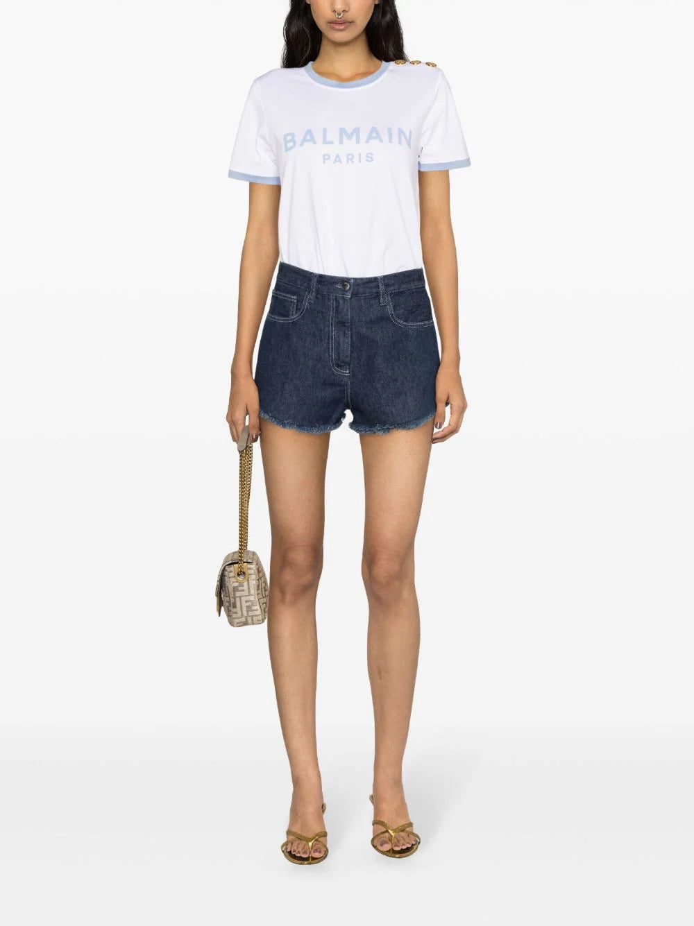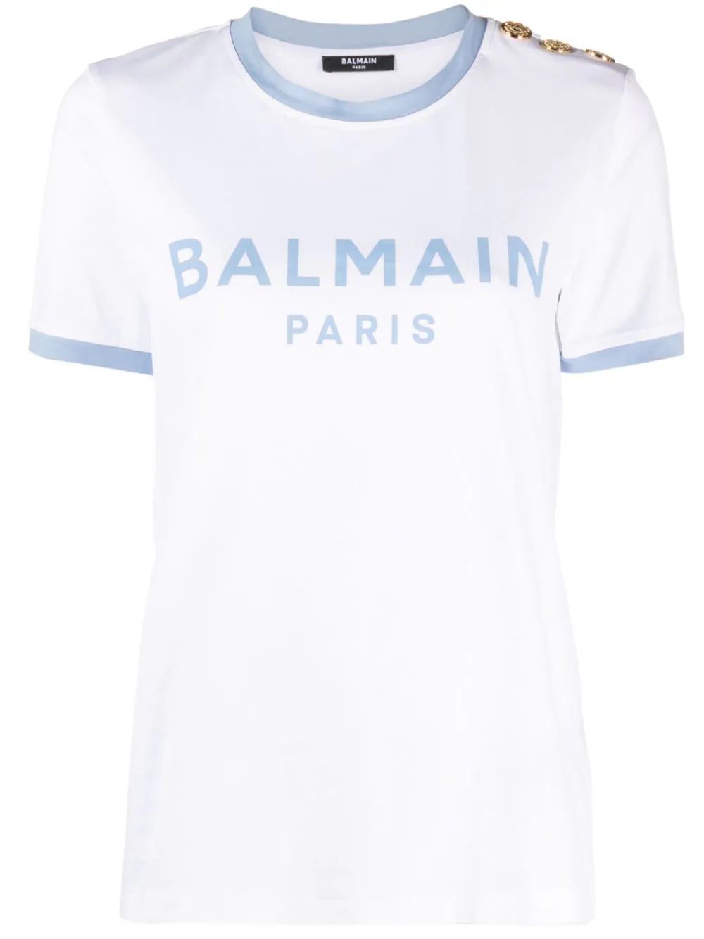 The white and light-blue hues combined with the gilded buttons at the shoulder lend this Balmain T-shirt elevated nautical nuance while the contrast trims recall retro sports tees.
